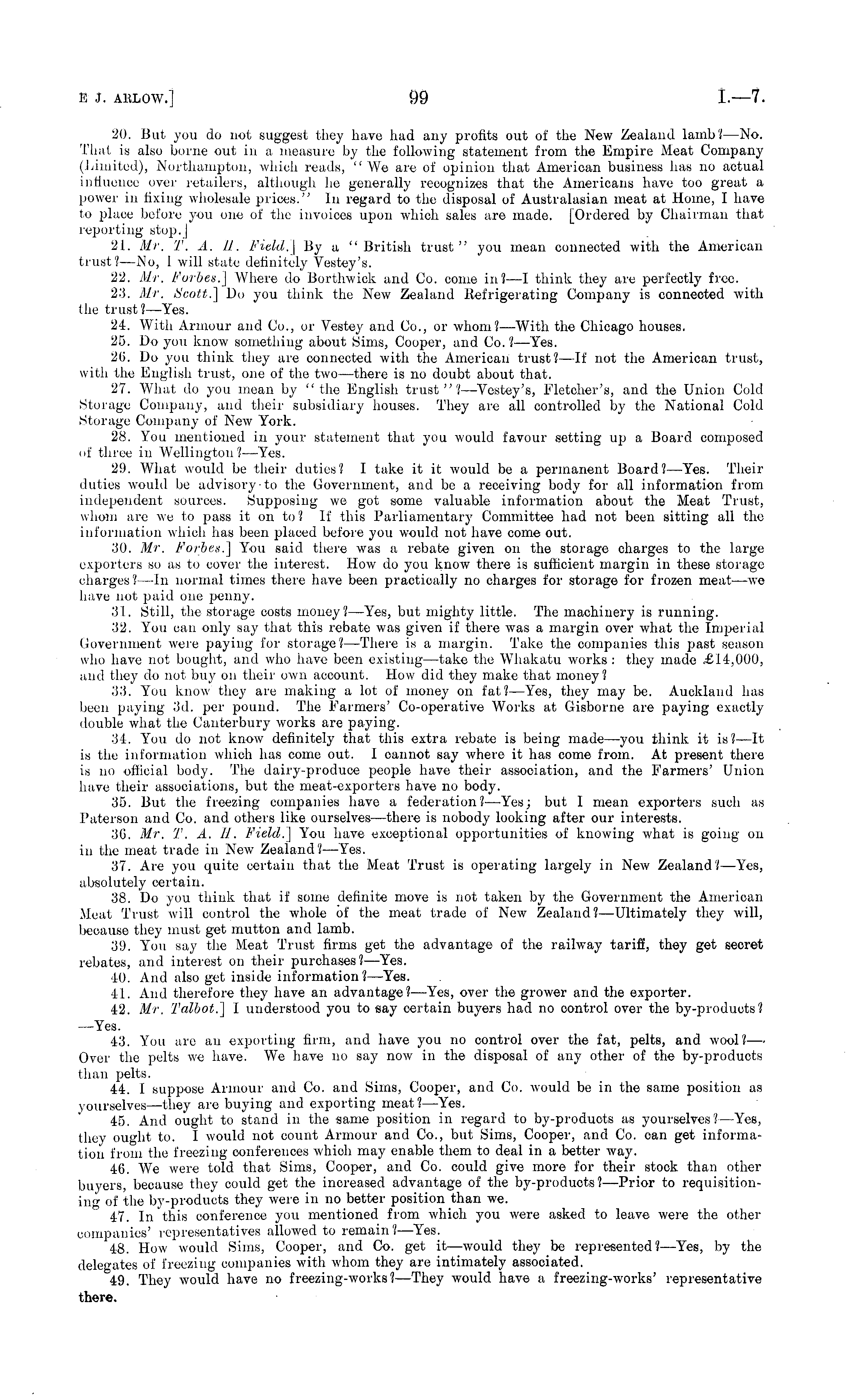 20. But you do not suggest they have had any profits out of the New Zealand lamb? —No. That is also borne out in a measure by the following statement from the Empire Meat Company (Limited), Northampton, which reads, " We are of opinion that American business has no actual influence over retailers, although he generally recognizes that the Americans have too great a power in fixing wholesale prices." In regard to the disposal of Australasian meat at Home, I have to place before you one of the invoices upon which sales are made. [Ordered by Chairman that reporting stop.] 21. Mr. T. A. 11. Field.} By a "British trust" you mean connected with the American trust?—No, I will state definitely Vestey's. 22. Mr. Forbes.] Where do Borthwick and Co. come in? —I think they are perfectly free. 23. Mr. Scott.] Do you think the New Zealand Refrigerating Company is connected with the trust? —Yes. 24. With Armour and Co., or Vestey and Co., or whom? —With the Chicago houses. 25. Do you know something about Sims, Cooper, and Co. ?—Yes. 26. Do you think they are connected with the American trust?—lf not the American trust, with the English trust, one of the two —there is no doubt about that. 27. What do you mean by "the English trust"? —Vestey's, Fletcher's, and the Union Cold Storage Company, and their subsidiary houses. They are all controlled by the National Cold Storage Company of New York. 28. You mentioned in your statement that you would favour setting up a Board composed of three in Wellington?— Yes. 29. What would be their duties? I take it it would be a permanent Board?— Yes. Their duties would be advisory to the Government, and be a receiving body for all information from independent sources. Supposing we got some valuable information about the Meat Trust, whom are we to pass it on to ? If this Parliamentary Committee had not been sitting all the information which has been placed before you would not have come out. 30. Mr. Forbes.] You said there was a rebate given on the storage charges to the large exporters so as to cover the interest. How do you know there is sufficient margin in these storage charges ?—ln normal times there have been practically no charges for storage for frozen meat —we have not paid one penny. 31. Still, the storage costs money? —Yes, but mighty little. The machinery is running. 32. You can only say that this rebate was given if there was a margin over what the Imperial Government were paying for storage?— There is a margin. Take the companies this past season who have not bought, and who have been existing —take the Whakatu works : they made £14,000, and they do not buy on their own account. How did they make that money? 33. You know they are making a lot of money on fat? —Yes, they may be. Auckland has been paying 3d. per pound. The Farmers' Co-operative Works at Gisborne are paying exactly double what the Canterbury works are paying. 34. You do not know definitely that this extra rebate is being made —you think it is?—lt is the information which has come out. I cannot say where it has come from. At present there is no official body. The dairy-produce people have their association, and the Farmers' Union have their associations, but the meat-exporters have no body. 35. But the freezing companies have a federation?— Yes; but I mean exporters such as Paterson and Co. and others like ourselves —there is nobody looking after our interests. .'l6. Mr, T. A. 11. Field.] You have exceptional opportunities of knowing what is going on in the meat trade in New Zealand? —Yes. 37. Are you quite certain that the Meat Trust is operating largely in New Zealand? —Yes, absolutely certain. 38. Do you think that if some definite move is not taken by the Government the American Meat Trust will control the whole of the meat trade of New Zealand?— Ultimately they will, because they must get mutton and lamb. 39. You say the Meat Trust firms get the advantage of the railway tariff, they get secret rebates, and interest on their purchases?— Yes. 40. And also get inside information? —Yes. 41. And therefore they have an advantage?— Yes, over the grower and the exporter. 42. Mr. Talbot.] I understood you to say certain buyers had no control over the by-products? —Yes. 43. You are an exporting firm, and have you no control over the fat, pelts, and wool?— Over the pelts we have. We have no say now in the disposal of any other of the by-products than pelts. 44. I suppose Armour and Co. and Sims, Cooper, and Co. would be in the same position as yourselves —they are buying and exporting meat? —Yes. 45. And ought to stand in the same position in regard to by-products as yourselves?— Yes, they ought to. I would not count Armour and Co., but Sims, Cooper, and Co. can get information from the freezing conferences which may enable them to deal in a better way. 46. We were told that Sims, Cooper, and Co. could give more for their stock, than other buyers, because they could get the increased advantage of the by-products?— Prior to requisitioning of the by-products they were in no better position than we. 47. In this conference you mentioned from which you were asked to leave were the other companies' representatives allowed to remain? —Yes. 48. How would Sims, Cooper, and Co. get it—would they be represented?— Yes, by the delegates of freezing companies with whom they are intimately associated. 49. They would have no freezing-works?— They would have a freezing-works' representative there.