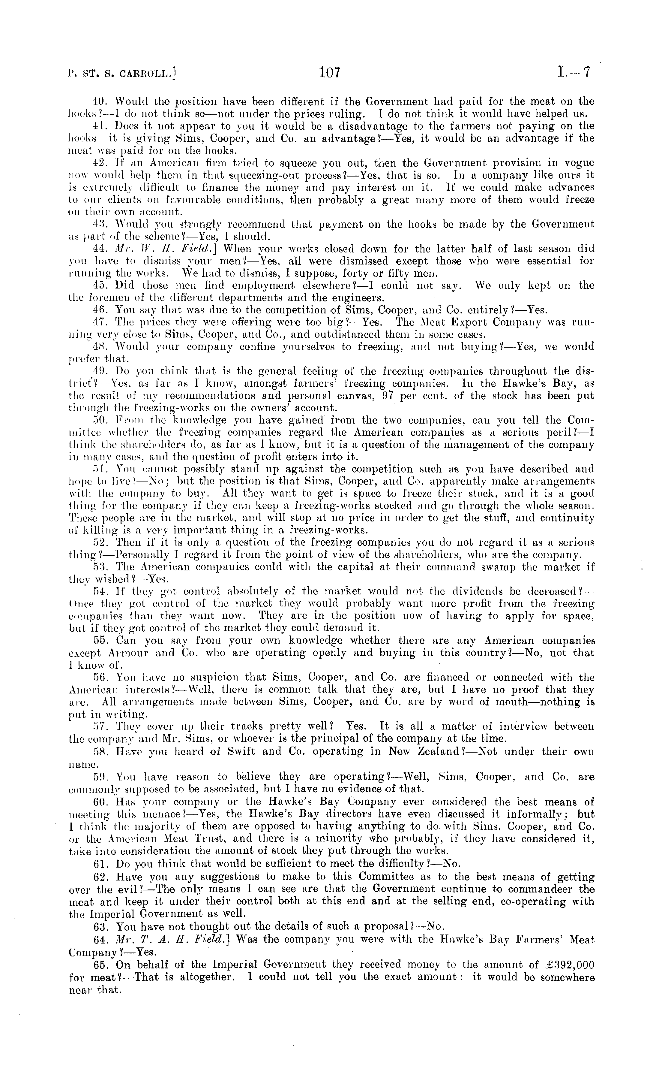 40. Would the position have been different if the Government had paid for the meat on the hooks? —I do not think so —not under the prices ruling. Ido not think it would have helped us. 41. Does it not appear to you it would be a disadvantage to the farmers not paying on the hooks—it is giving Sims, Cooper, and Co. an advantage?— Yes, it would be an advantage if the meat was paid for on the hooks. 42. If an American firm tried to squeeze you out, then the Government provision in vogue now would help them in that squeezing-out process?— Yes, that is so. In a company like ours it is extremely difficult to finance the money and pay interest on it. If we could make advances to our clients on favourable conditions, then probably a great many more of them would freeze on their own account. 43. Would you strongly recommend that payment on the hooks be made by the Government as part of the scheme? —Yes, I should. 44. Mr. W. 11. Field.] When your works closed down for the latter half of last season did \oii have to dismiss your men? —Yes, all were dismissed except those who were essential for running the works. We had to dismiss, I suppose, forty or fifty men. 45. Did those men find employment elsewhere? —I could not say. We only kept on the the foremen of the different departments and the engineers. 46. You say that was due to the competition of Sims, Cooper, anil Co. entirely?— Yes. 47. The prices they were offering were too big?— Yes. The Meat Export Company was running very close to Sims, Cooper, and Co., and outdistanced them in some cases. 48. Would your company confine yourselves to freezing, and not buying? —Yes, we would prefer that. 49. Do you think that is the general feeling of the freezing companies throughout the district?— Yes, as far as I know, amongst farmers' freezing companies. In the Hawke's Bay, as the result of my recommendations and personal canvas, 97 per cent, of the stock has been put through the freezing-works on the owners' account. 50. From the knowledge you have gained from the two companies, can you tell the Committee whether the freezing companies regard the American companies as a serious peril?—l think the shareholders do, as far as I know, but it is a question of the management of the company in many cases, anil the question of profit enters into it. 51. You cannot possibly stand up against the competition such as you have described and hope to live?—No; but the position is that Sims, Cooper, and Co. apparently make arrangements with the company to buy. All they want to get is space to freeze their stock, and it is a good thing for the company if they can keep a freezing-works stocked and go through the whole season. These people are in the market, and will stop at no price in order to get the stuff, and continuity of killing is a very important thing in a freezing-works. 52. Then if it is only a question of the freezing companies you do not regard it as a serious thing?— Personally I regard it from the point of view of the shareholders, who are the company. 53. The American companies could with the capital at their command swamp the market if they wished? —Yes. 54. If they got control absolutely of the market would not the dividends be decreased?— Once they got control of the market they would probably want more profit from the freezing companies than they want now. They arc in the position now of having to apply for space, but if they got control of the market they could demand it, 55. Can you say from your own knowledge whether there are any American companies except Armour and Co. who are operating openly and buying in this country?—No, not that I know of. 56. You have no suspicion that Sims, Cooper, and Co. are financed or connected with the American interests? —Well, there is common talk that they are, but I have no proof that they are. All arrangements made between Sims, Cooper, and Co. are by word of mouth —nothing is put in writing. 57. They cover up their tracks pretty well? Yes. It is all a matter of interview between the company and Mr. Sims, or whoever is the principal of the company at the time. 58. Have you heard of Swift and Co. operating in New Zealand?— Not under their own name. 59. You have reason to believe they are operating?— Well, Sims, Cooper, and Co. are commonly supposed to be associated, but I have no evidence of that. 60. Has your company or the Hawke's Bay Company ever considered the best means of meeting this menace? —Yes, the Hawke's Bay directors have even discussed it informally; but 1 think the majority of them are opposed to having anything to do. with Sims, Cooper, and Co. or the American Meat Trust, and there is a minority who probably, if they have considered it, take into consideration the amount of stock they put through the works. 61. Do you think that would be sufficient to meet the difficulty?— No. 62. Have you any suggestions to make to this Committee as to the best means of getting over the evil? —The only means 1 can see are that the Government continue to commandeer the meat and keep it under their control both at this end and at the selling end, co-operating with the Imperial Government as well. 63. You have not thought out the details of such a proposal? —No. 64. Mr. T. A. 11. Field.] Was the company you were with the Hawke's Bay Farmers' Meat Company?— Yes. 65. On behalf of the Imperial Government they received money to the amount of £392,000 for meat? —That is altogether. I could not tell you the exact amount: it would be somewhere near that.