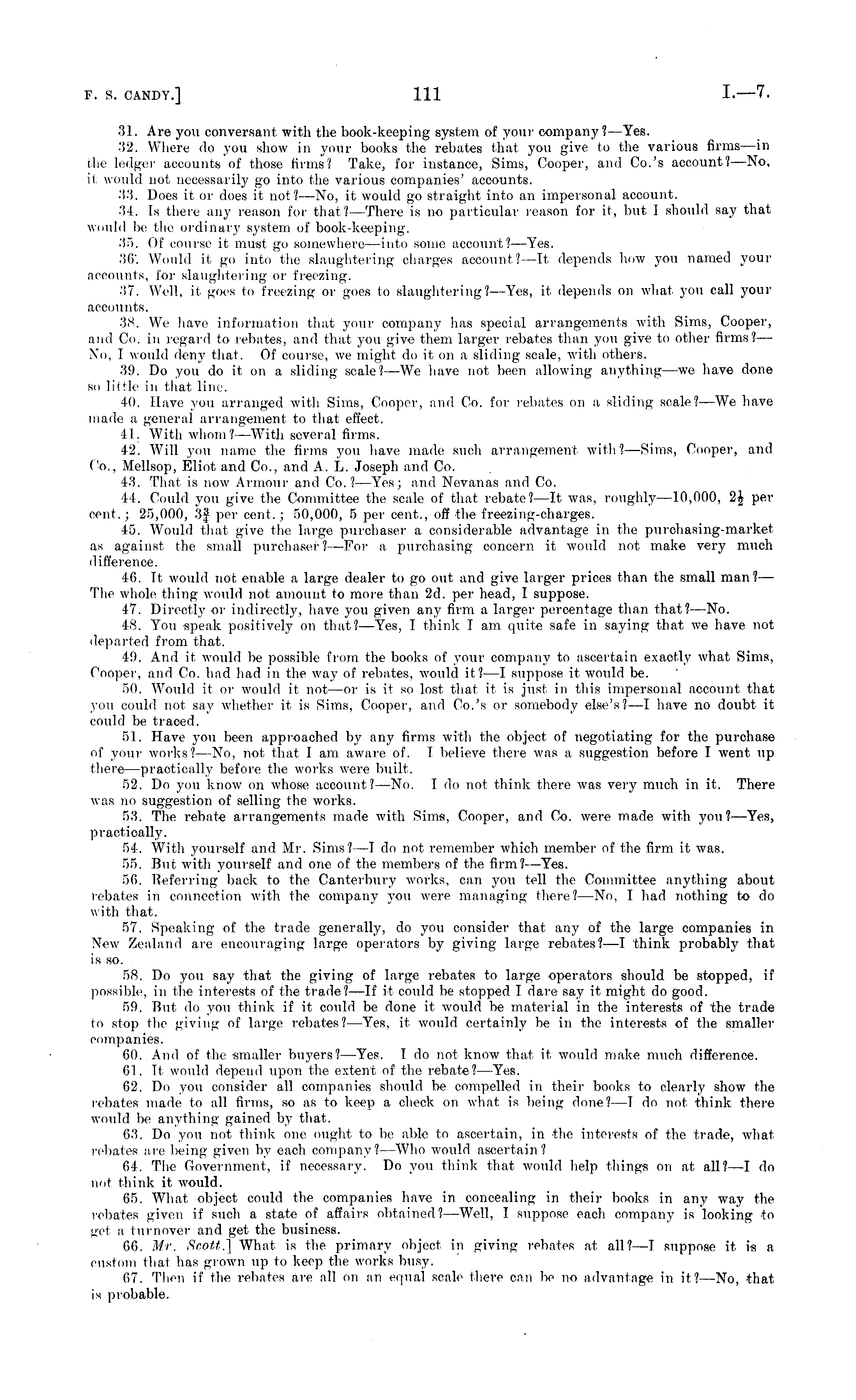 31. Are you conversant, with the book-keeping system of your company?— Yes. 32. Where do you show in your books the rebates that you give to the various firms —in the ledger accounts of those firms? Take, for instance, Sims, Cooper, and Co.'s account? —No, it would not necessarily go into the various companies' accounts. 33. Does it or does it not?—No, it would go straight into an impersonal account. 34. Is there any reason for that? —There is no particular reason for it, but I should say that would be the ordinary system of book-keeping. 35. Of course it must go somewhere —into some account? —Yes. 36. Would it go into the slaughtering charges account? —It depends how you named your accounts, for slaughtering or freezing. 37. Well, it goes to freezing or goes to slaughtering?— Yes, it depends on what, you call your accounts. 38. We have information that your company has special arrangements with Sims, Cooper, and Co. in regard to rebates, and that you give them larger rebates than you give to other firms? — Xo, I would deny that. Of course, we might do it on a sliding scale, with others. 39. Do you do it on a sliding scale? —We have not been allowing anything —we have done so little in that line. 40. Have you arranged with Sims, Cooper, and Co, for rebates on a sliding scale? —We have made a general arrangement to that effect. 41. With whom? —With several firms. 42. Will you name the firms you have made such arrangement with? —Sims, Cooper, and Co., Mellsop, Eliot and Co., and A. L. Joseph and Co. 43. That is now Armour and Co.? —Yes; and Nevanas and Co. 44. Could you give the Committee the scale of that rebate? —It was, roughly—lo,ooo, 2| petcent. ; 25,000, 3| per cent.; 50,000, 5 per cent., off the freezing-charges. 45. Would that give the large purchaser a considerable advantage in the purchasing-market as against the small purchaser?— For a purchasing concern it would not make very much difference. 46. It would not enable a large dealer to go out and give larger prices than the small man? — The whole thing would not amount to more than 2d. per head, I suppose. 47. Directly or indirectly, have you given any firm a larger percentage than that?— No. 48. You speak positively on that? —Yes, I think I am quite safe in saying that we have not departed from that. 49. And it would be possible from the books of your company to ascertain exactly what Sims, Cooper, and Co. had had in the way of rebates, would it? —I suppose it, would be. 50. Would it or would it, not —or is it so lost that it is just in this impersonal account that you could not say whether it is Sims, Cooper, and Co.'s or somebody else's? —I have no doubt it could be traced. 51. Have you been approached by any firms with the object of negotiating for the purchase of your works?—No, not that lam aware of. I believe there was a suggestion before I went up there —practically before the works were built. 52. Do you know on whose account?— No. T do not think there was very much in it. There was no suggestion of selling the works. 53. The rebate arrangements made with Sims, Cooper, and Co. were made with you?— Yes, practically. 54. With yourself and Mr. Sims? —I do not remember which member of the firm it was. 55. But with yourself and one of the members of the firm? —Yes. 56. Referring back to the Canterbury works, can you tell the Committee anything about rebates in connection with the company you were managing there? —No, I had nothing to do with that. 57. Speaking of the trade generally, do you consider that any of the large companies in New Zealand are encouraging large operators by giving large rebates? —I think probably that is so. 58. Do you say that the giving of large rebates to large operators should be stopped, if possible, in the interests of the trade? —If it could be stopped I dare say it might do good. 59. But, do you think if it, could be done it would be material in the interests of the trade to stop the giving of large rebates? —Yes, it would certainly be in the interests of the smaller companies. 60. And of the smaller buyers?— Yes. T do not know that, it would make much difference. 61. It would depend upon the extent of the rebate?— Yes. 62. Do you consider all companies should be compelled in their books to clearly show the rebates made to all firms, so as to keep a check on what is being done?—T do not, think there would be anything gained by that. 63. Do you not think one ought to be able to ascertain, in the interests of the trade, what, rebates are being given by each company?— Who would ascertain? 64. The Government, if necessary. Do you think that would help things on at all? —I do not think it would. 65. What object could the companies have in concealing in their books in any way the. rebates given if such a state of affairs obtained? —Well, I suppose each company is looking to get a turnover and get the business. 66. Mr. Scott,.] What is the primary object in giving rebates at, all?—T suppose it, is a custom that has grown up to keep the works busy. 67. Then if the rebates are all on an equal scale there can be no advantage in it ?—No, that is probable.
