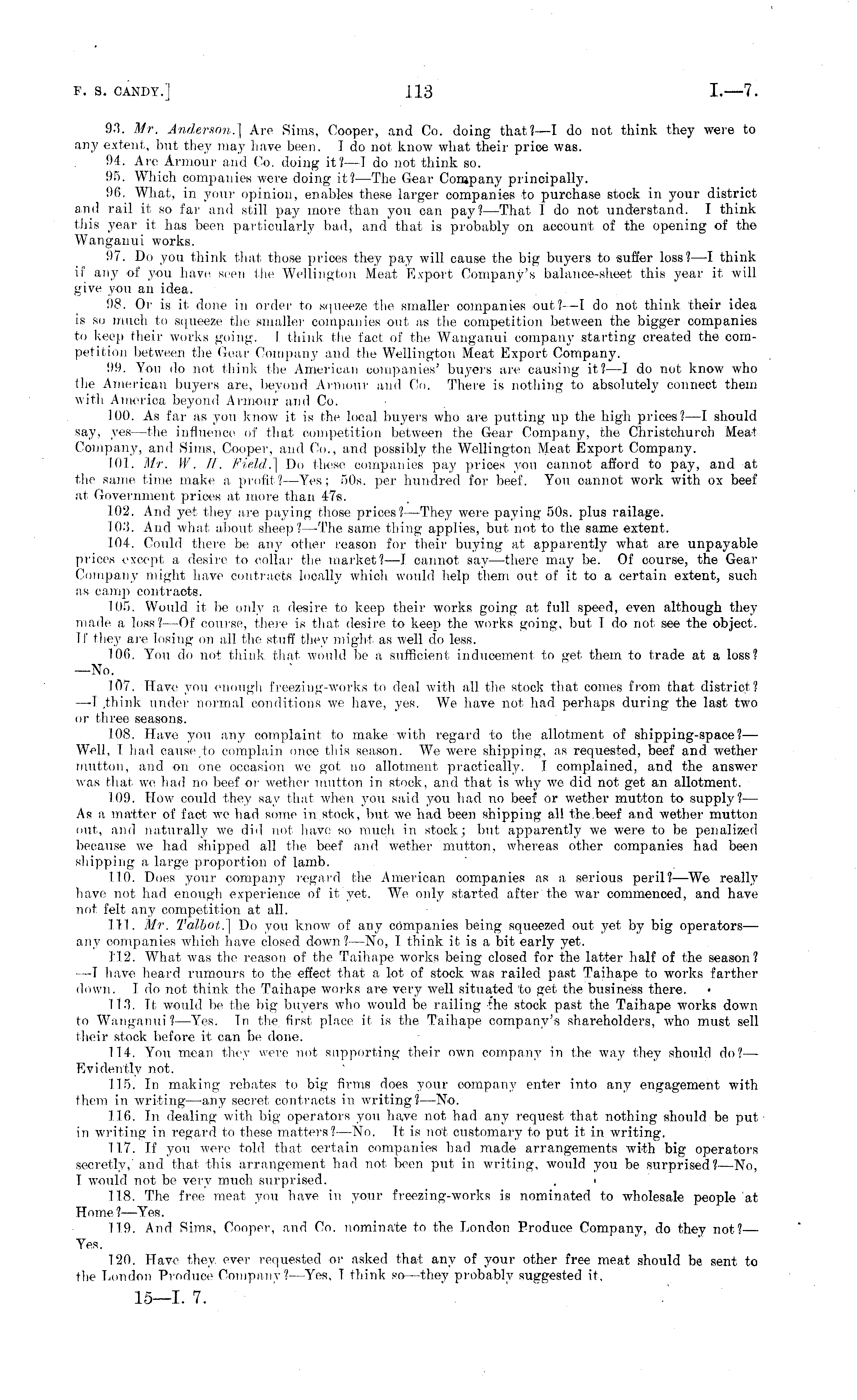 93. Mr. Anderson.] Are Sims, Cooper, and Co. doing that?—l do not think they were to any extent, but they may have been. Ido not know what their price was. 94. Are Armour and Co. doing it? —I do not think so. 95. Which companies were doing it? —The Gear Company principally. 96. What, in your opinion, enables these larger companies to purchase stock in your district and rail it so far and still pay more than, you can pay?— That I do not understand. I think this year it has been particularly bad, and that is probably on account of the opening of the Wanganui works. 97. Do you think that, those prices they pay will cause the big buyers to suffer loss? —I think if any of you have seen I he Wellington Meat Export, Company's balance-sheet this year it will give you an idea. 98. Or is it done in order to squeeze the smaller companies out? —I do not think their idea is so much to squeeze the smaller companies out as the competition between the bigger companies to keep their works going. I think the fact of the Wanganui company starting created the competition between the Gear Company and the Wellington Meat Export Company. 99. You do not think the American companies' buyers are causing it?—l do not know who the American buyers are, beyond Armour and Co. There is nothing to absolutely connect them with America beyond Armour and Co. 100. As far as you know it, is the local buyers who are putting up the high prices?—l should say, yes —the influence of that competition between the Gear Company, the Christchurch Meat Company, and Sims, Cooper, and Co., and possibly the Wellington Meat Export Company. 101. Mr. W. 11. Field.} Do these companies pay prices you cannot afford to pay, and at the same time make a, profit?— Yes; 50s. per hundred for beef. You cannot work, with ox beef at, Government prices at more than 475. 102. And yet they are paying those prices?— They were paying 50s. plus railage. 103. And what about sheep?— The same thing applies, but not to the same extent. 104. Could there be any other reason for their buying at apparently what, are unpayable prices except a desire to collar the market?—l cannot say —there may be. Of course, the Gear Company might have contracts locally which would help them out of it to a certain extent, such as camp contracts. 105. Would it be only a, desire to keep their works going at full speed, even although they made a loss? —Of course, there is that desire to keep the works going, but T do not see the object. If they are losing on all the stuff they might as well do less. 106. You do not think that- would be a sufficient, inducement to get, them to trade at a loss? —No. 107. Have you enough freezing-works to deal with all the stock, that comes from that district? —I .think under normal conditions we have, yes. We have not had perhaps during the last two or three seasons. 108. Have you any complaint to make with regard to the allotment, of shipping-space? — Well, I had cause to complain once this season. We were shipping, as requested, beef and wether mutton, and on one occasion we got no allotment, practically. I complained, and the answer was that we had no beef or wether mutton in stock, and that is why we did not get an, allotment. 109. How could they say that when you said you had no beef or wether mutton to supply? — As a matter of fact we had some in stock, but we had been shipping all the,beef and wether mutton out, and naturally we did not, have so much in stock; but apparently we were to be penalized because we had shipped all the, beef and wether mutton, whereas other companies had been shipping a large proportion of lamb. 110. Does your company regard the American companies as a serious peril?—We really have not had enough experience of it yet. We only started after the war commenced, and have not felt any competition at all. 111. Mr. Talbot.] Do you know of any companies being squeezed out yet by big operators — any companies which have closed down ?—No, I think it is a, bit early yet. IT2. What was the reason of the Taihape works being closed for the latter half of the season? —I have heard rumours to the effect that a lot of stock was railed past, Taihape to works farther down! Tdo not think the Taihape works are very well situated to get the business there. 113. It would be the big buyers who would he railing the stock past the Taihape works down to Wanganui?—Yes. Tn the first place it is the Taihape company's shareholders, who must sell their stock before it can be done. 114. You mean they were not supporting their own company in the way they should do?— Evidently not. 115. In making rebates to big firms does your company enter into any engagement with them in writing—"any secret contracts in writing?— No. 116. In dealing with big operators you have not had any request that nothing should be put in writing in regard to these matters?— No. It is not customary to put it, in writing. 11.7. If you were told that certain companies had made arrangements with big operators secretly,' and that this arrangement had not been put in writing, would you be surprised?—No, I would not be very much surprised. . i 118. The free meat you have in your freezing-works is nominated to wholesale people at Home? —Yes. 119. And Sims, Cooper, and Co. nominate to the London Produce Company, do they not?— Yes. 120. Have they ever requested or asked that any of your other free meat should be sent to the London Produce Company? —Yes, T think so—they probably suggested it.