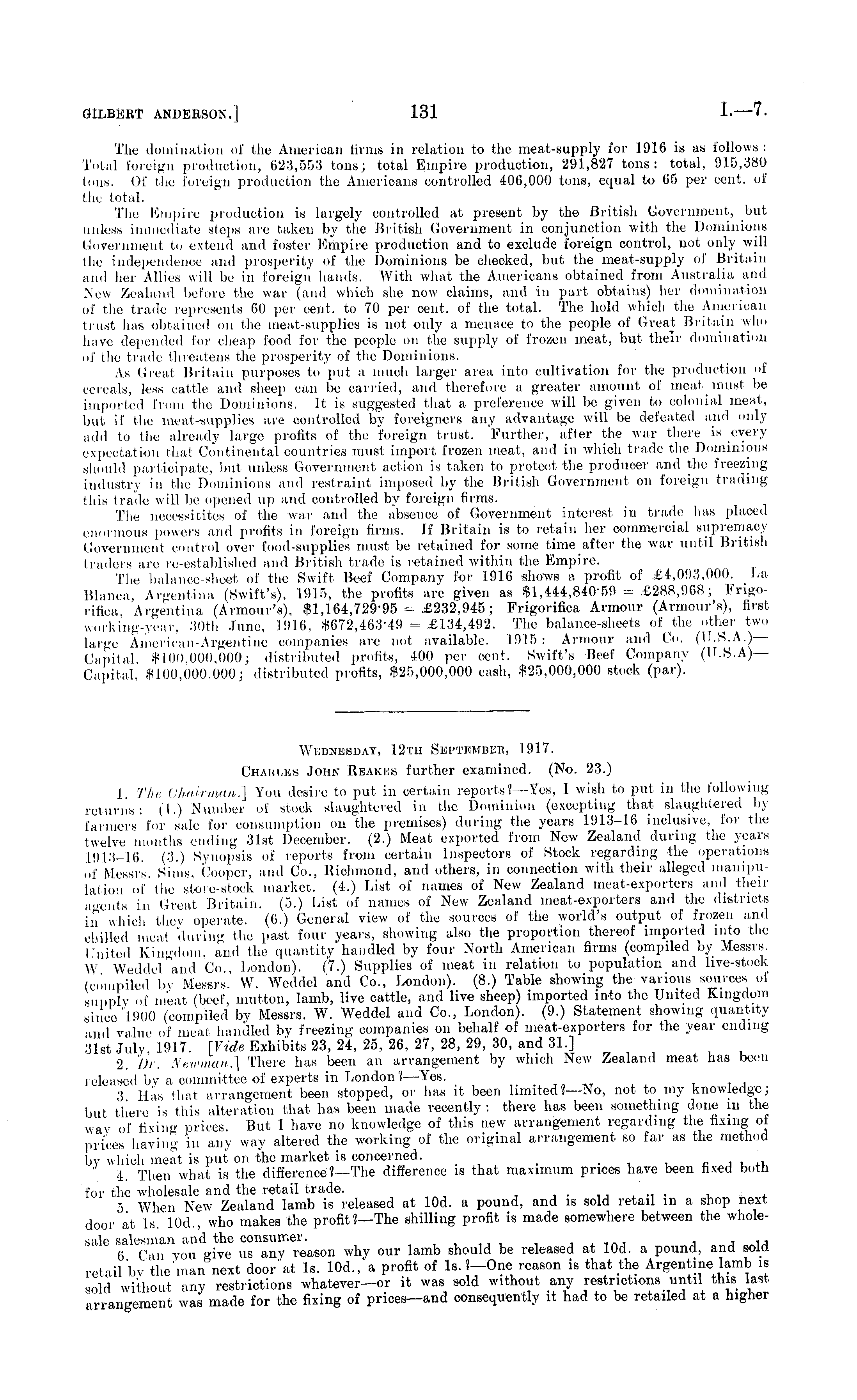 Wednesday, 12th September, 1917. Chaiu.us John Rbakidw further examined. (No. 23.) 1. The Chairman:] You desire to put in certain reports'l—Yes, I wish to put in the following returns: (1.) Number of stock slaughtered in the Dominion (excepting that slaughtered by farmers for sale for consumption on the premises) during the years 1913-16 inclusive, for the twelve months ending 31st December. (2.) Meat exported from Now Zealand during the years 1918-16. (3.) Synopsis of reports from certain Inspectors of Stock regarding the operations of Messrs Sims. Cooper, and Co., Richmond, and others, in connection with their alleged manipulation of the store-stock market. (4.) List of names of New Zealand meat-exporters and their agents in Great Britain. (5.) List of names of New Zealand meat-exporters and the districts in which they operate. (6.) General view of the sources of the world's output of frozen and chilled meat 'during the past four years, showing also the proportion thereof imported into the United Kingdom, and the quantity handled by four North American firms (compiled by Messrs. W Weddel and Co., London). (7.) Supplies of meat in relation to population and live-stock (compiled by Messrs. W. Weddel and Co., London). (8.) Table showing the various sources oi supply of meat (beef, mutton, lamb, live cattle, and live sheep) imported into the United Kingdom since 1900 (compiled by Messrs. W. Weddel and Co., London). (9.) Statement showing quantity and value of meat handled by freezing companies on behalf of meat-exporters for the year ending 31st July 1917. [Vide Exhibits 23, 24, 25, 26, 27, 28, 29, 30, and 31.] 2. Dr. Newman.] There has been an arrangement by which New Zealand meat has been released by a committee of experts in London?— Yes. ~.-,„ XT , , j 3 Has that arrangement been stopped, or has it been limited?—No, not to my knowledge; but there is this alteration that has been made recently : there has been something done in the wav of fix-iim prices. But I have no knowledge of this new arrangement regarding the fixing of prices having in any way altered the working of the original arrangement so far as the method by which meat is put on the market is concerned. _ '_ 4. Then what is the difference?--The difference is that maximum prices have been fixed both for the wholesale and the retail trade. , 5 When New Zealand lamb is released at lOd. a pound, and is sold retail in a shop next door at Is. 10d., who makes the profit?— The shilling profit is made somewhere between the wholesale salesman and the consumer. ~,,,, , -, . ,AJ A A 6 Can you »ive us any reason why our lamb should be released at lOd. a pound, and sold retail by the man next door at Is. 10d., a profit of Is. ?—One reason is that the Argentine lamb is sold without any restrictions whatever—or it was sold without any restrictions until this last arrangement was made for the fixing of prices—and consequently it had to be retailed at a higher