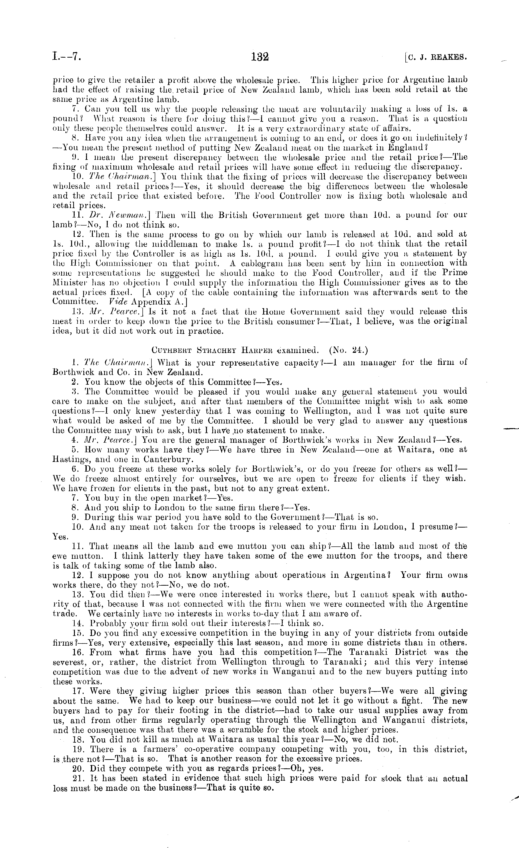 price to give the retailer a profit above the wholesale price. This higher price for Argentine lamb had the effect of raising the. retail price of New Zealand lamb, which has been sold retail at the same price as Argentine lamb. 7. Can you tell us why the people releasing the meat are voluntarily making a loss of Is. a pound? What reason is there for doing this?—l cannot give you a reason. That is a question only these people themselves could answer. It is a very extraordinary state of affairs. 8. Have you any idea when the arrangement is coming to an end, or does it go on indefinitely? —You mean the present method of putting New Zealand meat on the market in England? 9. 1 mean the present discrepancy between the wholesale price ami the retail price? —The fixing of maximum wholesale and retail prices will have some effect in reducing the discrepancy. 10. The Chairman.] You think that the fixing of prices will decrease the discrepancy between wholesale and retail prices?— Yes, it should decrease the big differences between the wholesale and the retail price that existed before. The Food Controller now is fixing both wholesale and retail prices. 11. Dr. Newman.] Then will the British Government get more than lOd. a pound for our lamb? —No, 1 do not think so. 12. Then is the same process to go on by whioh our lamb is released at lOd. and sold at Is. lOd., allowing the middleman to make Is. a pound profit?—l do not think that the retail price fixed by the Controller is as high as Is. lOd. a pound. I could give you a statement by the High Commissioner on that point. A. cablegram, has been sent by him in connection with some representations he suggested he should make to the Food Controller, and if the Prime Minister has no objection 1 could supply the information the High Commissioner gives as to the actual prices fixed. [A copy of the cable containing the information was afterwards sent to the Committee. Vide Appendix A.] f.'i. Mr. Pearce.] Is it not a fact that the Home Government said they would release this meat in order to keep down the price to the British consumer?— That, 1 believe, was the original idea, but it did not work out in practice. Cuthbebt Stkachey Habper examined. (No. 24.) 1. The Chairman.] What is your representative capacity?—l am manager for the firm of Borthwick and Co. in New Zealand. 2. You know the objects of this Committee? —Yes. 3. The Committee would be pleased if you would make any general statement you would care to make on the subject, and after that members of the Committee might wish to ask some questions?—l only knew yesterday that 1 was coming to Wellington, and 1 was not quite sure what would be asked of me by the Committee. 1 should be very glad to answer any questions the Committee may wish to ask, but 1 have ,no statement to make. 4. Mr. Pearce.] You are the general manager of Borthwick's works in New Zealand? —Yes. 5. How many works have they?—We have three in New Zealand —one at Waitara, one at Hastings, and one in Canterbury. 6. Do you freeze at these works solely for Borthwick's, or do you freeze for others as well?— We do freeze almost entirely for ourselves, but we are open to freeze for clients if they wish. We have frozen for clients in the past, but not to any great extent. 7. You buy in the open market?— Yes. 8. And you ship to London to the same firm there? —Yes. 9. During this war period you have sold to the Government? —That is so. 10. And any meat not taken for the troops is released to your firm in London, 1 presume?— Yes. 11. That means all the lamb and ewe mutton you can ship?— All the lamb and most of the ewe mutton. 1 think latterly they have taken some of the ewe mutton for the troops, and there is talk of taking some of the lamb also. 12. I suppose you do not know anything about operations in Argentina? Your firm owns works there, do they not?—No, we do not. 13. You did then? —We were once interested in works there, but I cannot speak with authority of that, because I was not connected with the firm when we were connected with tho Argentine trade. We certainly have no interests in works to-day that lam aware of. 14. Probably your firm sold out their interests? —I think so. 15. Do you find any excessive competition in the buying in any of your districts from outside firms?— Yes, very extensive, especially this last season, and more in some districts than in others. 16. From what firms have you had this competition?— The Taranaki District was the severest, or, rather, the district from Wellington through to Taranaki; and this very intense competition was due to the advent of new works in Wanganui and to the new buyers putting into these works. 17. Were they giving higher prices this season than other buyers?—We were all giving about the same. We had to keep our business —we could not let it go without a fight. The new buyers had to pay for their footing in the district —had to take our usual supplies away from us, and from other firms regularly operating through the Wellington and Wanganui districts, and the consequence was that there was a scramble for the stock and higher prices. 18. You did not kill as much at Waitara as usual this year?—No, we did not. 19. There is a farmers' co-operative company competing with you, too, in this district, is .there not? —That is so. That is another reason for the excessive prices. 20. Did they compete with you as regards prices?—Oh, yes. 21. It has been stated in evidence that such high prices were paid for stock that an actual loss must be made on the business? —That is quite so.