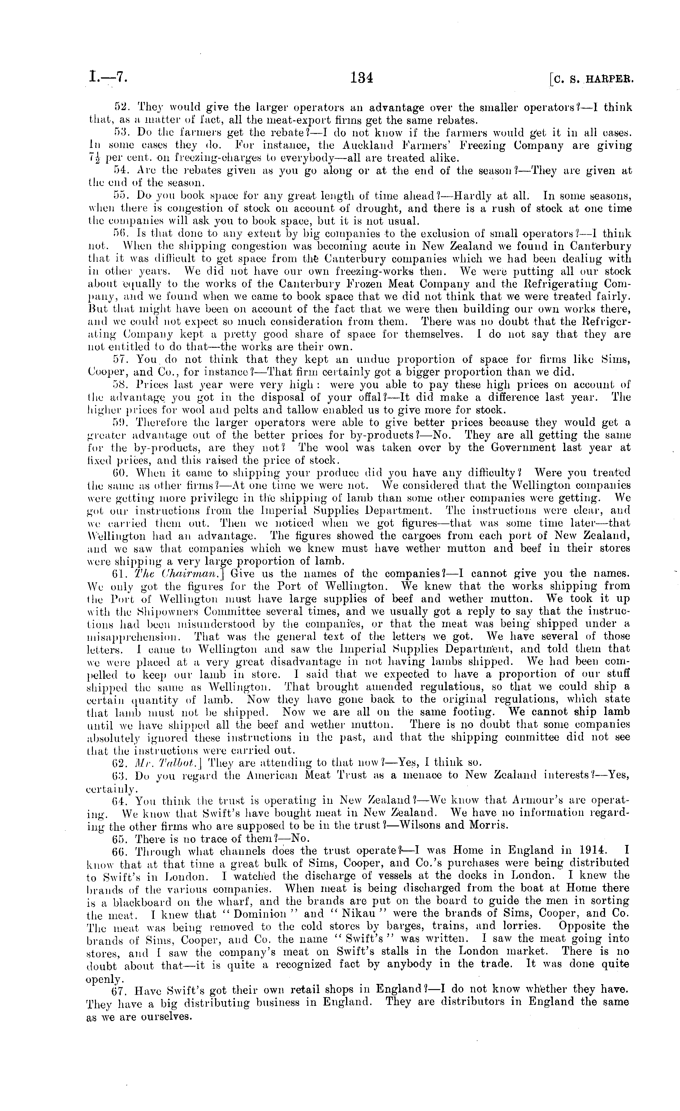 52. They would give the larger operators an advantage over the smaller operators?—l think that, as a matter of fact, all the meat-export firms get the same rebates. 53. Do the farmers get the rebate?—l do not know if the farmers would get it in all cases. In some cases they do. For instance, the Auckland Farmers' Freezing Company are giving 7£ per cent, on freezing-charges to everybody —all are treated alike. 54. Are the rebates given as you go along or at the end of the season ?—They are given at the end of the season. 55. Do you book space for any great length of time ahead? —Hardly at all. In some seasons, when there is congestion of stock on account of drought, and there is a rush of stock at one time the companies will ask you to book space, but, it is not usual. 56. Is that done to any extent by big companies to the exclusion of small operators?—l think not. When the shipping congestion was becoming acute in New Zealand we found in Canterbury that it was difficult to get space from the Canterbury companies which we had been dealing with in other years. We did not have our own freezing-works then. We were putting all our stock about equally to the works of the Canterbury Frozen Meat Company and the Refrigerating Company, and we found when we came to book space that we did not think that we were treated fairly. But that might have been on account of the fact that we were then building our own works there, and we could not expect so much consideration from them. There was no doubt that the Refrigerating Company kept a pretty good share of space for themselves. 1 do not say that they are not entitled to do that—the works are their own. 57. You do not think that they kept an undue proportion of space for firms like Sims, Cooper, and Co., for instance? —That firm certainly got a bigger proportion than we did. 58. Prices last year were very high : were you able to pay these high prices on account of (he advantage, you got in the disposal of your offal? —It did make a difference last year. The higher prices for wool and pelts and tallow enabled us to give more for stock. 59. Therefore the larger operators were able to give better prices because they would get a greater advantage out of the better prices for by-products?— No. They are all getting the same for the by-products, are they not? The wool was taken over by the Government last year at fixed prices, and this raised the price of stock. (iO. When it came to shipping your produce did you have any difficulty? Were you treated the same as other firms? —At one time we were not. We considered that the Wellington companies were getting more privilege in the shipping of lamb than some other companies were getting. We got our instructions from the Imperial Supplies Department. The instructions were clear, and we carried them out. Then we noticed when we got figures—that was some time later —that Wellington had an advantage. The figures showed the cargoes from each port of New Zealand, and we saw that companies which we knew must have wether mutton and beef in their stores were shipping a very large proportion of lamb. 61. The Chairman.] Give us the names of the companies? —I cannot give you the names. We only got the figures for the Port of Wellington. We knew that the works shipping from (he Port of Wellington must have large supplies of beef and wether mutton. We took it up with the Shipowners Committee several times, and we usually got a reply to say that the instructions had been misunderstood by the companies, or that the meat was being shipped under a misapprehension. That was the general text of the letters we got. We have several of those letters. 1 came to Wellington and saw the Imperial Supplies Department, and told them that we were placed at a very great disadvantage in not having lambs shipped. We had been compelled to keep our lamb in store. I said that we expected to have a proportion of our stuff shipped the same as Wellington. That brought amended regulations, so that we could ship a certain quantity of lamb. Now they have gone back to the original regulations, which state that lamb must not be shipped. Now we are all on the same footing. We cannot ship lamb until we have shipped all the beef and wether mutton. There is no doubt that some companies absolutely ignored these instructions in the past, and that the shipping committee did not see that the instructions were carried out. 62. Mr. 'Talbot.] They are attending to that now?— Yes, 1 think so. 63. Do you regard the American Meat Trust as a menace to New Zealand interests? —Yes, certainly. 64. You think the trust is operating in New Zealand? —We know that Armour's are operating. We know that Swift's have bought meat in New Zealand. We have no information regarding the other firms who are supposed to be in the trust?— Wilsons and Morris. 65. There is no trace of them?— No. 66. Through what channels does the trust operate? —I was Home in England in 1914. I know that at that time a great bulk of Sims, Cooper, and Co.'s purchases were being distributed to Swift's in London. I watched the discharge of vessels at the docks in London. I knew the brands of the various companies. When meat is being discharged from the boat at Home there is a blackboard on the wharf, and the brands are put on the board to guide the men in sorting the meat. I knew that "Dominion " and " Nikau " were the brands of Sims, Cooper, and Co. The meat was being removed to the cold stores by barges, trains, and lorries. Opposite the brands of Sims, Cooper, and Co. the name " Swift's" was written. I saw the meat going into stores, and 1 saw the company's meat on Swift's stalls in the London market. There is no doubt about that—it is quite a recognized fact by anybody in the trade. It was done quite openly. 67. Have Swift's got their own retail shops in England?—l do not know whether they have. They have a big distributing business in England. They are distributors i