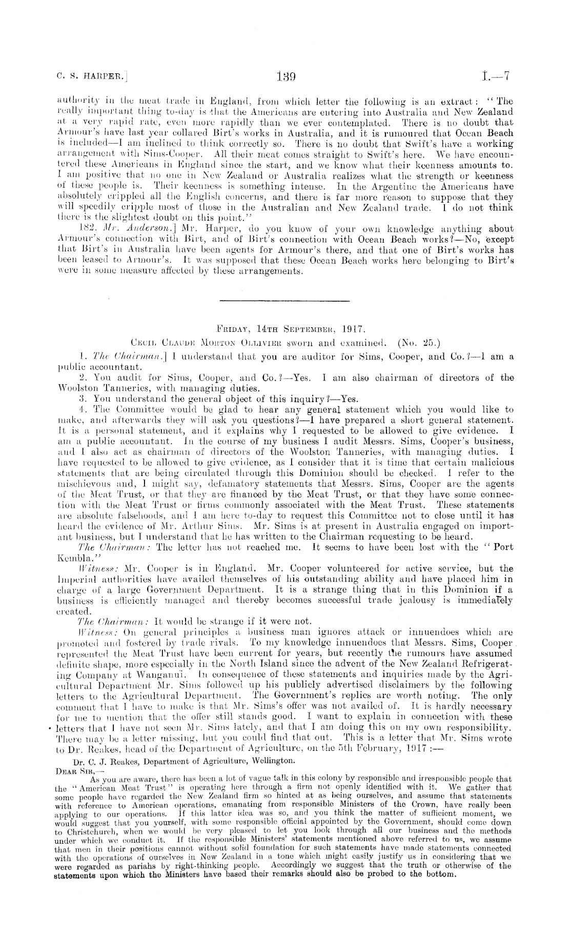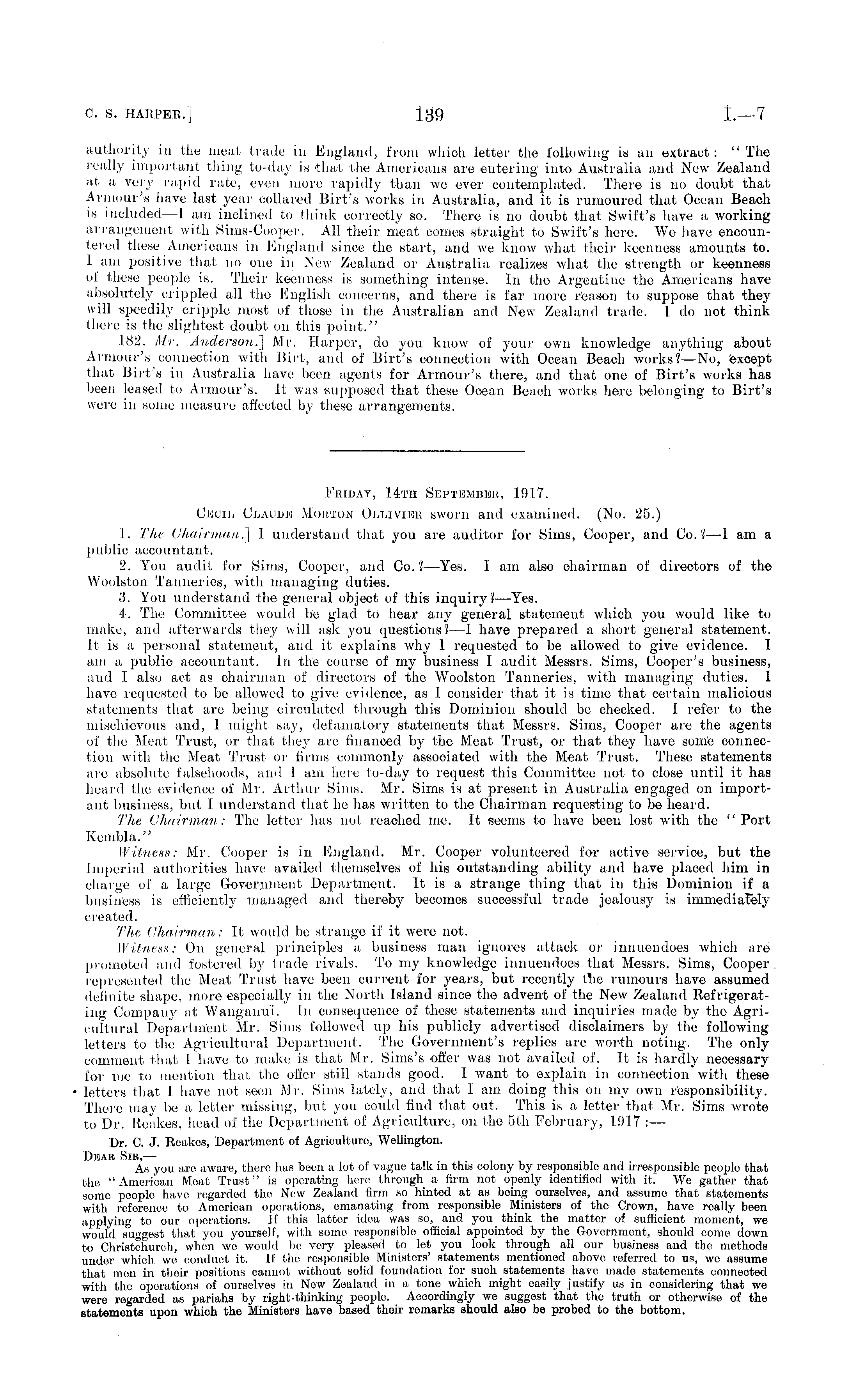 Friday, 14th September, 1917. CECIL Claude Mobton Ollivieb sworn and examined. (No. 25.) 1. The Chairman.] I understand that you are auditor for Sims, Cooper, and Co. ?—1 am a public accountant. 2. You audit for Sims, Cooper, and Co.?— Yes. I am also chairman of directors of the Woolston Tanneries, with managing duties. 3. You understand the general object of this inquiry? —Yes. 4. The Committee would be glad to hear any general statement which you would like to make, and afterwards they will ask you questions? —I have prepared a short general statement. It is a personal statement, and it explains why I requested to be allowed to give evidence. I am a public accountant. In the course of my business I audit Messrs. Sims, Cooper's business, and I also act as chairman of directors of the Woolston Tanneries, with managing duties. I have requested to be allowed to give evidence, as I consider that it is time that certain malicious statements that are being circulated through this Dominion should be checked. I refer to the mischievous and, 1 might say, defamatory statements that Messrs. Sims, Cooper are the agents of the Meat Trust, or that they are financed by the Meat Trust, or that they have some connection with the Meat Trust or firms commonly associated with the Meat Trust. These statements are absolute falsehoods, and I am here to-day to request this Committee not to close until it has heard the evidence of Mr. Arthur Sims. Mr. Sims is at present in Australia engaged on important business, but I understand that he has written to the Chairman requesting to be heard. The Chairman: The letter has not reached me. It seems to have been lost with the "Port Kembla." Witness: Mr. Cooper is in England. Mr. Cooper volunteered for active service, but the Imperial authorities have availed themselves of his outstanding ability and have placed him in charge of a large Government Department. It is a strange thing that iv this Dominion if a business is efficiently managed and thereby becomes successful trade jealousy is immediately created. The Chairman: It would be strange if it were not. Witness: On general principles a business man ignores attack or .innuendoes which arc promoted and fostered by trade rivals. To my knowledge innuendoes that Messrs. Sims, Cooper represented the Meat Trust have been current for years, but recently the rumours have assumed definite shape, more especially in the North Island since the advent of the New Zealand Refrigerating Company at Wanganui. In consequence of these statements and inquiries made by the Agricultural Department Mr. Sims followed up his publicly advertised disclaimers by the following letters to the Agricultural Department. The Government's replies are worth noting. The only comment that I have to make is that Mr. Sims's offer was not availed of. It is hardly necessary for me to mention that the offer still stands good. I want to explain in connection with these letters that I have not seen Mr. Sims lately, and that I am doing this on my own responsibility. There may be a letter missing, but you could find that out. This is a letter that Mr. Sims wrote to Dr. Reakes, head of the Department of Agriculture, on the sth February, 1917 : — Dr. C. J. Reakes, Department of Agriculture, Wellington. Dear Sir, — As you are aware, thero has been a lot of vague talk in this colony by responsible and irresponsible people that the "American Meat Trust" is operating here through, a firm not openly identified, with it. We gather that some people have regarded tho New Zealand firm so hinted at as being ourselves, and assume that statements with reference to American operations, emanating from responsible Ministers of the Crown, have really been applying to our operations. If this latter idea was so, and you think the matter of sufficient moment, wo would suggest that you yourself, with some responsible official appointed by the Government, should come down to Christchurch, when we would be very pleased to let you look through all our business and the methods under which, we conduct it. If the responsible Ministers' statements mentioned above referred to us, we assume that men in their positions cannot without, solid foundation for such statements have made statements connected with the operations of ourselves in New Zealand in a tone which might easily justify us in considering that we were regarded as pariahs by right-thinking people. Accordingly we suggest that the truth or otherwise of the statements upon which the Ministers havo based their remarks should also be probed to the bottom.