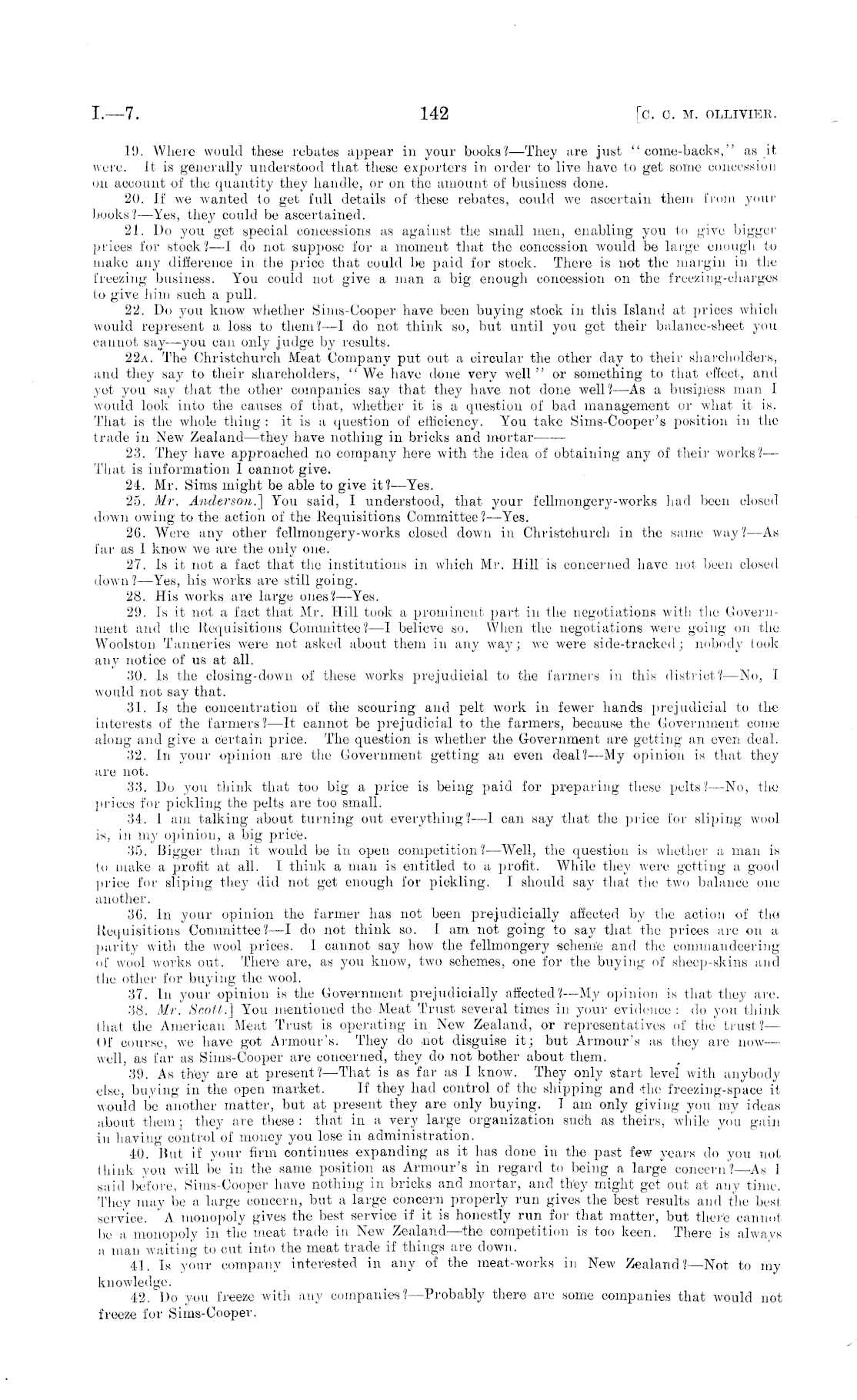 19. Where would these rebates appear in your books? —They are just "come-backs," as it were. It is generally understood that these exporters in order to live have to get some concession on account of the quantity they handle, or on the amount of business done. 20. If we wanted to get full details of these rebates, could we ascertain them from your books? —Yes, they could be ascertained. 21. Do you get special concessions as against the small men, enabling you to give bigger prices for stock?—l do not suppose for a moment that tho concession would be large enough to make any difference in the price that could be paid for stock. There is not the margin in the freezing business. You could not give a man a big enough concession on the freezing-charges to give him such a pull. 22. Do you know whether Sims-Cooper have been buying stock in this Island at prices which would represent a loss to them? —I do not think so, but until you get their balance-sheet you cannot say—you can only judge by results. 22a. The Christchurch Meat Company put out a circular the other day to their shareholders, and they say to their shareholders, "We have done very well" or something to that effect, and yet you say that the other companies say that they have not done well? —As a business man I would look, into the causes of that, whether it is a question of bad management or what it is. That is the whole thing :it is a question of efficiency. You take Sims-Cooper's position in the trade in New Zealand—they have nothing in bricks and mortar 23. They have approached no company here with the idea of obtaining any of their works? — That is information I cannot give. 24. Mr. Sims might be able to give it?— Yes. 25. Mr. Anderson.] You said, I understood, that your fellmongery-works had been closed down owing to the action of the Requisitions Committee ?—Yes. 26. Were any other fellmongery-works closed down in Christchurch in the same way? —As fai- as 1 know we are the only one. 27. Is it not a fact that the institutions in which Mr. Hill is concerned have not been closed down ?—Yes, his works are still going. 28. His works are large ones?— Yes. 29. Is it not a fact that Mr. Hill took a prominent part in the negotiations with the Government and the Requisitions Committee? —I. believe so. When the negotiations were going on the Woolston Tanneries were not asked about them in any way; we were side-tracked; nobody took any notice of us at all. 30. Is the closing-down of these works prejudicial to the farmers in this district? —No, 1 would not say that. 31. Is the concentration of the scouring and pelt work in fewer hands prejudicial to the interests of the farmers? —It cannot be prejudicial to the farmers, because the Government come along and give a certain price. The question, is whether the Government are getting an even deal. 32. In your opinion are the Government getting an even deal?—My opinion is that they are not. 33. Do you think that too big a price is being paid for preparing these pelts?—No, the prices for pickling the pelts are too small. 34. 1 am talking about turning out everything?—l can say that the price for sliping wool is, in vi}' opinion, a big price. 35. Bigger than it would be in open competition?— Well, the question is whether a man is to make a profit at all. I think a man is entitled to a profit. While they were getting a good price for sliping they did not get enough for pickling. I should say that the two balance one another. 36. in your opinion the farmer has not been prejudicially affected by the action of tho Requisitions Committee? —I do not think so. lam not going to say that the prices are on a parity with the wool prices. 1 cannot say how the fellmongery scheme and the commandeering of wool works out. There are, as you know, two schemes, one for the buying of sheep-skins and the other for buying the wool. 37. In your opinion is the Government prejudicially affected? —My opinion is that they arc. 38. Mr. Scott.] You mentioned the Meat Trust several times in your evidence: do you think that the American Meat Trust is operating in New Zealand, or representatives of the trust? — Of course, we have got Armour's. They do not disguise it; but Armour's as they are nowwell, as far as Sims-Cooper are concerned, they do not bother about them. 39. As they are at present? —That is as far as I know. They only start level with anybody else, buying in the open market, If they had control of the shipping and the freezing-space it would be another matter, but at present they are only buying. T am only giving you my ideas about them; they are these: that in a very large organization such as theirs, while you gain in having control of money you lose in administration. 40. But if your firm continues expanding as it has done in the past few years do you not think you will be in the same position as Armour's in regard to being a large concern?—As I said before, Sims-Cooper have nothing in bricks and mortar, and they might get out at any time. They may be a large concern, but a. large concern properly run gives the best results and the best service. A monopoly gives the best service if it is honestly run for that matter, but there cannot be a monopoly in the meat trade in New Zealand —the competition is too keen. There is always a man waiting to cut into the meat trade if things are down. 41. Is your company interested in any of the meat-works in New Zealand?— Not to my knowledge. 42. Do you freeze with any companies?— Probably there are some companies that would not freeze for Sims-Cooper.