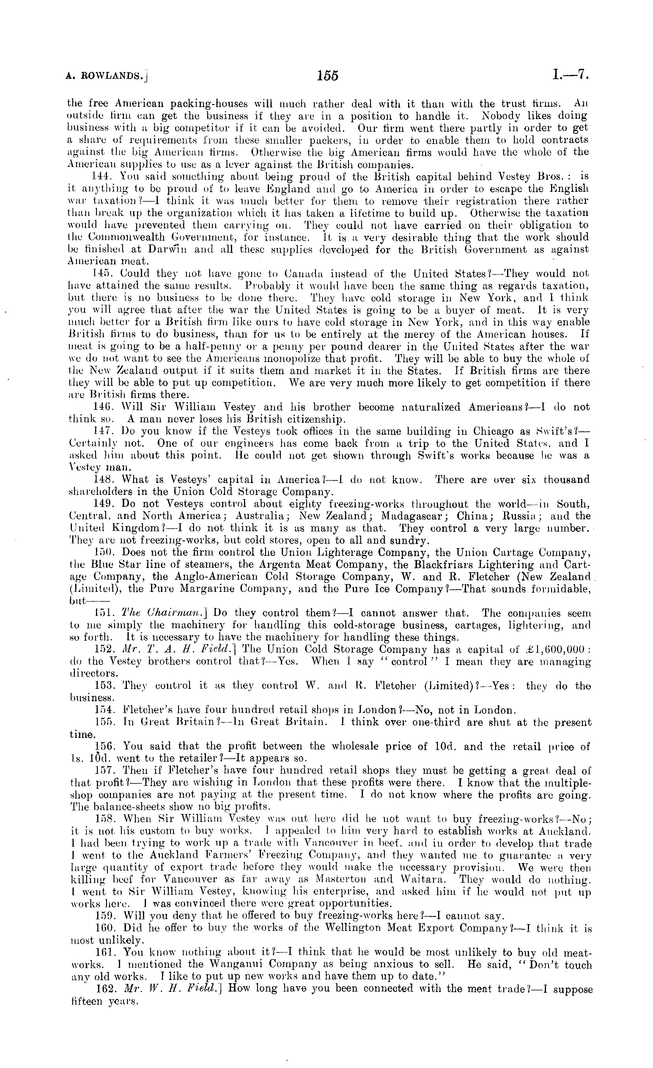 the free American packing-houses will much rather deal with it than with the trust firms. An outside firm can get the business if they are in a position to handle it, Nobody likes doing business with a big competitor if it can be avoided. Our firm went there partly in order to get a share of requirements from these smaller packers, in order to enable them to hold contracts against the big American firms. Otherwise the big American firms would have the whole of the American supplies to use as a lever against the British companies. 144. You said something about being proud of the British capital behind Vestey Bros. : is it anything to be proud of to leave England and go to America in order to escape the English war taxation? —1 think it was much better for them to remove their registration there rather than break up the organization which it has taken a lifetime to build up. Otherwise the taxation would have prevented them carrying on. They could not have carried on their obligation to the Commonwealth Government, for instance. It is a very desirable thing that the work should be finished at Darwin and all these supplies developed for the British Government as against American meat. 145. Could they not have gone to Canada instead of the United States?— They would not have attained the same results. Probably it would have been the same thing as regards taxation, but there is no business to be done there. They have cold storage in New York, and I think you will agree that after the war the United States is going to be a buyer of meat. It is very much better for a British firm like ours to have cold storage in New York, and in this way enable British linns to do business, than for us to be entirely at the mercy of the American houses. If meat is going to be a half-penny or a penny per pound dearer in the United States after the war we do not want to see the Americans monopolize that profit. They will be able to buy the whole of the New Zealand output if it suits them and market it in the States. If British firms are there they will be able to put up competition. We are very much more likely to get competition if there are British firms there. 146. Will Sir William Vestey and his brother become naturalized Americans? —I do not think so. A man never loses his British citizenship. 147. Do you know if the Vesteys took offices in the same building in Chicago as Swift's? — Certainly not. One of our engineers has come back from a trip to the United States, and I asked him about this point. Ho could not get shown through Swift's works because he was a Vestey man. 148. What is Vesteys' capital in America? —I do not know. There are over six thousand shareholders in the Union Cold Storage Company. 149. Do not Vesteys control about eighty freezing-works throughout the world —in South, Central, and North America; Australia; New Zealand; Madagascar; China; Russia; and the United Kingdom?—l do not think it is as many as that. They control a very large number. They are not freezing-works, but cold stores, open to all and sundry. 150. Does not the firm control the Union Lighterage Company, the Union Cartage Company, the Blue Star line of steamers, the Argenta Meat Company, the Blackfriars Lightering and Cartage Company, the Anglo-American Cold Storage Company, W. and R. Fletcher (New Zealand (Limited), the Pure Margarine Company, and the Pure Ice Company? —That sounds formidable, but 151. 'The Chairman.] Do they control them?—l cannot answer that, The companies seem to me simply the machinery for handling this cold-storage business, cartages, lightering, and so forth. It is necessary to have the machinery for handling these things. 152. Mr. T. A. 11. Field.] The Union Cold Storage Company has a capital of £1,600,000: do the Vestey brothers control that? —Yes. When I say "control" I mean they are managingdirectors. 153. They control it as they control W. and R. Fletcher (Limited)? —Yes: they do the business. 1.54. Fletcher's have four hundred retail shops in London?—No, not in London. 155. In Great Britain?—hi Great Britain. 1 think over one-third are shut at the present time. 156. You said that the profit between the wholesale price of lOd. and the retail price of Is. lOd. went to the retailer? —It appears so. 157. Then if Fletcher's have four hundred retail shops they must be getting a greal deal of that profit? —They are wishing in London that these profits were there. I know that the multipleshop companies are not paying at the present time. I do not know where the profits are going. The balance-sheets show no big profits. 158. When Sir William Vestey was out, here did he not want to buy freezing-works?—No; it is not, his custom to buy works. 1 appealed to him very hard to establish works at Auckland. I had been trying to work up a trade wilh Vancouver in beef, and in order to develop that trade I went to the Auckland Fanners' Freezing Company, and they wanted me to guarantee a very large quantity of export trade before they would make the necessary provision. We were then killing beef for Vancouver as far away as Masterton and Waitara. They would do nothing. I went to Sir William Vestey, knowing his enterprise, and asked him if he would not put up works here. I was convinced there were great opportunities. 159. Will you deny that be offered to buy freezing-works here?—l cannot say. 160. Did he offer to buy the works of the Wellington Meat Export Company?—l think it is most unlikely. 161. You know nothing about it?—l think that he would be most, unlikely to buy old meatworks. I mentioned the Wanganui Company as being anxious to sell. He said, " Don't, touch any old works. 1 like to put up new works and have them up to date." 162. Mr. W. R. Field.] How long have you been connected with the meat trade?—l suppose fifteen years.