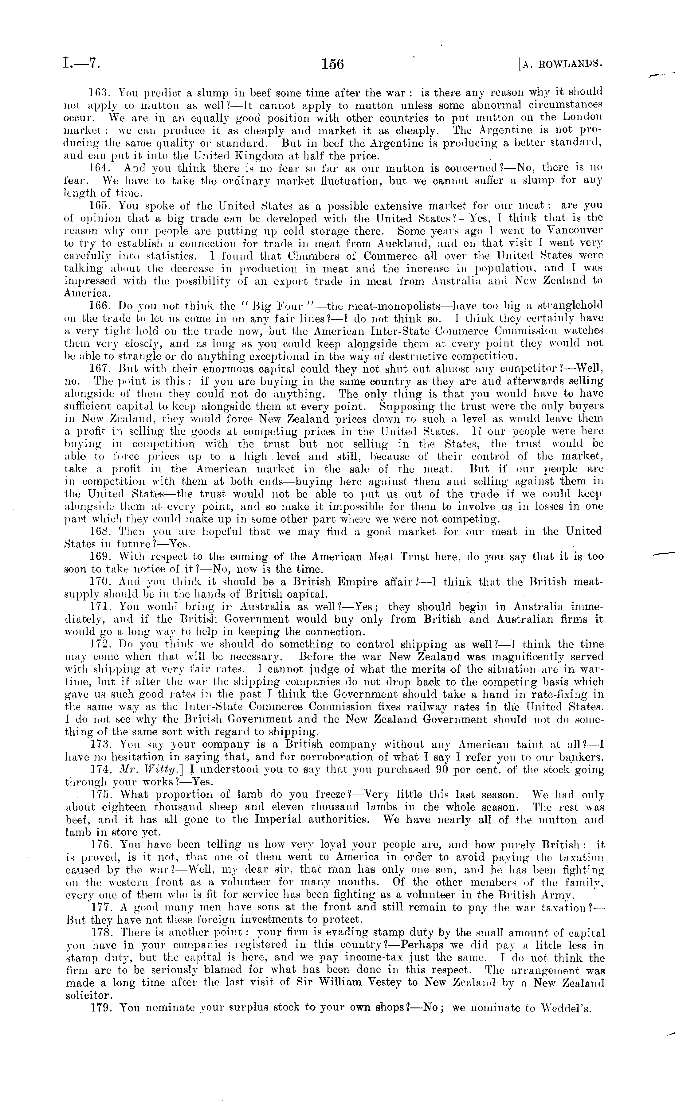 163. You predict, a slump in beef some time after the war : is there any reason why it should not apply to mutton as well? —It cannot apply to mutton unless some abnormal circumstances occur. We are in an equally good position with other countries to put mutton on the London market :we can produce it as cheaply and market it as cheaply. The Argentine is not producing the same quality or standard. But in beef the Argentine is producing a better standard, and can put it into the United Kingdom at half the price. 164. And you think there is no fear so far as our mutton is concerned? —No, there is no fear. We have to take the ordinary market fluctuation, but we cannot suffer a slump for any length of time. 165. You spoke of the United States as a possible extensive market for our meat: are you of opinion that a big trade can be developed with the United States? —Yes, I think that is the reason why our people are putting up cold storage there. Some years ago I went to Vancouver to try to establish a connection for trade in meat from Auckland, and on that visit I went very carefully into statistics. I found that Chambers of Commerce all over the United States were talking about the decrease in production in meat and the increase in population, and I was impressed with the possibility of an export trade in meat from Australia and New Zealand to America. 166. Do you not think the "Big Four" —the meat-monopolists—have too big a stranglehold on the trade to let us come in on any fair lines? —I do not think so. I think they certainly have a very tight hold on the trade now, but the American Inter-State Commerce Commission watches them very closely, and as long as you could keep alongside them at every point they would not be able to strangle or do anything exceptional in the way of destructive competition. 167. But with their enormous capital could they not shut out almost, any competitor? —Well, no. The point is this :if you are buying in the same country as they are and afterwards selling alongside of them they could not do anything. The only thing is that you would have to have sufficient capital to keep alongside them at every point. Supposing the trust were the only buyers in New Zealand, they would force New Zealand prices down to such a level as would leave them a profit, in selling the goods at competing prices in the United States. If our people were here buying in competition with the trust but not selling in the States, the trust would be able to force prices up to a high . level and still, because of their control of the market, take a profit in the American market in the sale of the meat. But if our people are in competition with them at both ends—buying here against them and selling against them in the United States—the trust would not be able to put us out of the trade if we could keep alongside them at, every point, and so make it impossible for them to involve us in losses in one part which they could make up in some other part where we were not competing. 168. Then you are hopeful that we may find a good market for our meat in the United States in future ? —Yes. 169. With respect to the coming of the American Meat Trust here, do you say that it is too soon to take notice of it?—No, now is the time. 170. And you think it should be a British Empire affair?—l think that the British meatsupply should be in the hands of British capital. 171. You would bring in Australia as well? —Yes; they should begin in Australia immediately, and if the British Government would buy only from British and Australian firms it would go a long way to help in keeping the connection. 172. Do you think we should do something to control shipping as well?—I think the time may come when that will be necessary. Before the war New Zealand was magnificently served with shipping at very fair rates. I cannot judge of what the merits of the situation are in wartime, but if after the war the shipping companies do not drop back to the competing basis which gave us such good rates in the past I think the Government should take a hand in rate-fixing in the same way as the Inter-State Commerce Commission fixes railway rates in the United States. I do not see why the British Government and the New Zealand Government should not do something of the same sort with regard to shipping. 173. You say your company is a British company without any American taint at all?—I have no hesitation in saying that, and for corroboration of what I say I refer you to our bankers. 174. Mr. Witty.] I understood you to say that you purchased 90 per cent, of the stock going through your works? —Yes. 175. What proportion of lamb do you freeze?— Very little this last season. We had only about eighteen thousand sheep and eleven thousand lambs in the whole season. The rest was beef, and it has all gone to the Imperial authorities. We have nearly all of the mutton and lamb in store yet. 176. You have been telling us how very loyal your people are, and how purely British : it is proved, is it, not, that one of them went, to America in order to avoid paying the taxation caused by the war? —Well, my dear sir, that man has only one son, and he has been fighting on the western front as a volunteer for many months. Of the other members of the family, every one of them who is fit for service has been fighting as a volunteer in the British Army. 177. A good many men have sons at, the front and still remain to pay the war taxation? — But they have not these foreign investments to protect. 178. There is another point : your firm is evading stamp duty by the small amount, of capital you have in your companies registered in this country?— Perhaps we did pay a little less in stamp duty, but the capital is here, and we pay income-tax just the same. 1 do not think the firm are to be seriously blamed for what has been done in this respect, The arrangement was made a long time after the last visit of Sir William Vestey to New Ze