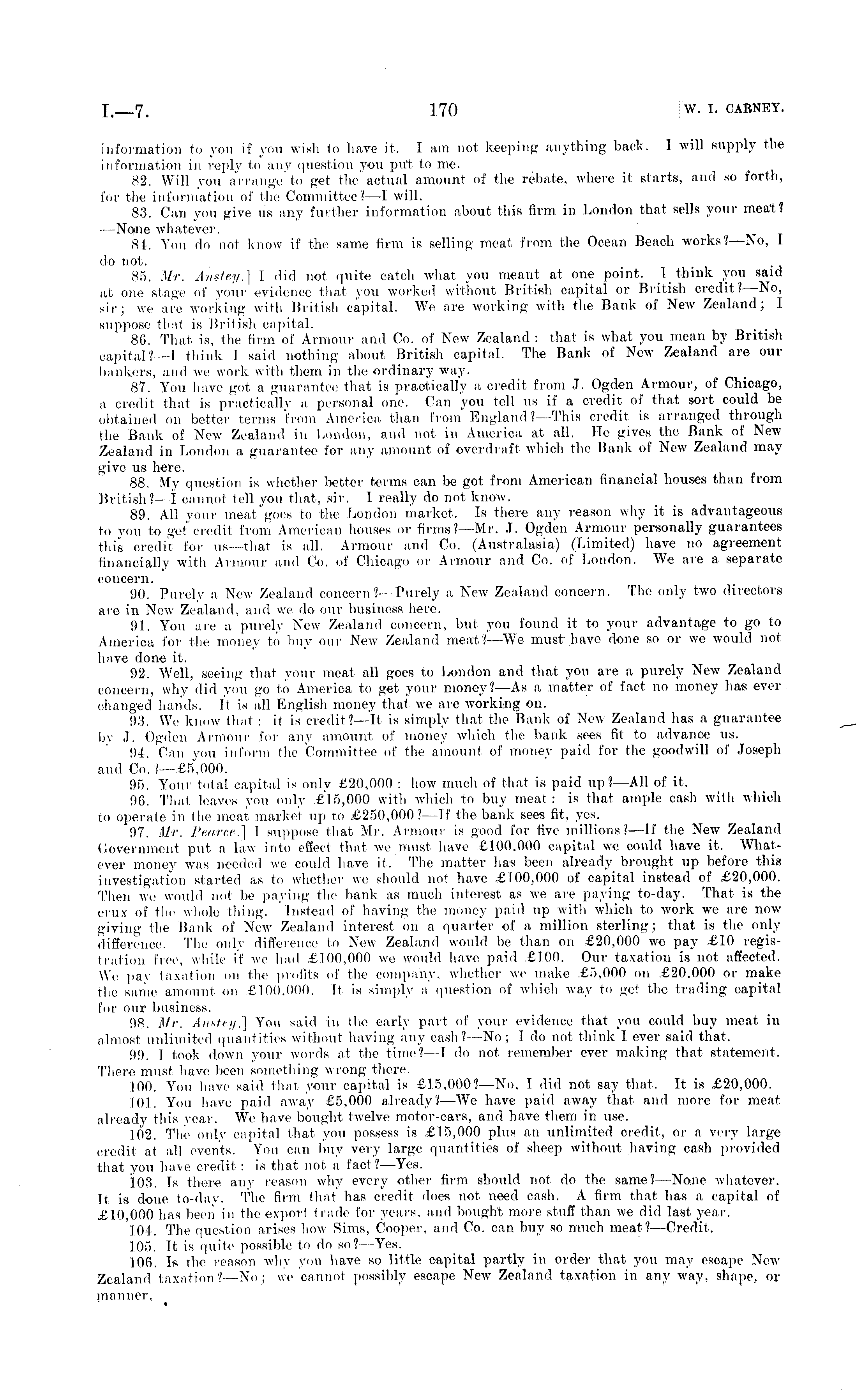information to you if you wish to have it. lam not keeping anything back. I will supply the information in reply to any question you put to me. 82. Will you arrange'to get the'actual amount of the rebate, where it starts, and so forth, for the information of the Committee? —I will. 83. Can you give us any further information about this firm in London that sells your meat? —None whatever. 84. You do not know if the same firm is selling meat from the Ocean Beach works? —No, I do not. 85. Mr. Anstey.] I did not quite catch what, you meant at, one point. I think you said at one stage of your evidence that you worked without British capital or British credit? —No, sir; we are working with British capital. We are working with the Bank of New Zealand; I suppose that is British capital. 86. That is, the firm of Armour and Co. of New Zealand : that is what you mean by British capital?—l think I said nothing about British capital. The Bank of New Zealand are our bankers, and we work with them in the ordinary way. 87. You have got a guarantee that is practically a credit from J. Ogden Armour, of Chicago, a credit, that is practical! v a personal one. Can you tell us if a credit of that sort could be obtained on better terms 'from America than from England ?—This credit is arranged through the Bank of New Zealand in London, and not in America at all. He gives the Bank of New Zealand in London a guarantee for any amount of overdraft which the Bank of New Zealand may give us here. 88. My question is whether better terms can be got from American financial houses than from British? —I cannot tell you that, sir. I really do not know. 89. All your meat,'goes to the London market. Is there any reason why it is advantageous to you to get ere:(lit from American houses or firms?— Mr. J. Ogden Armour personally guarantees this credit for us—that is all. Armour and Co. (Australasia) (Limited) have no agreement financially with Armour and Co. of Chicago or Armour and Co. of London. We are a separate concern. 90. Purely a New Zealand concern?— Purely a New Zealand concern. The only two directors arc in New Zealand, and we do our business here. 91. You are a purely New Zealand concern, but you found it to your advantage to go to America for the money to buy our New Zealand meat?—We must have done so or we would not have done it. 92. Well, seeing that your meat all goes to Loudon and that you are a purely New Zealand concern, why did you go to America to get your money?—As a matter of fact no money has ever changed hands. It is all English money that we are working on. 93. We know that : if is credit? —It is simply that the Bank of New Zealand has a guarantee by J. Ogden Armour for any amount of money which the bank sees fit to advance us. 94. Can you inform the Committee of the amount of money paid for the goodwill of Joseph and Co. ?—£5,000. 95. Your total capital is only £20,000 : how much of that is paid up?— All of it. 96. That leaves you only £15,000 with which to buy meat : is that ample cash with which to operate in the meat market up to £250,000? —If tho bank sees fit, yes. 97. Mr, Pearce.] I suppose that Mr. Armour is good for five millions? —If the New Zealand Government put, a law into effect that we must have £100.000 capital we could have it, AVhatcver money was needed we could have it. The matter has been already brought up before this investigation started as to whether we should not have £100,000 of capital instead of £20,000. Then we would not be paying the bank as much interest as we are paying to-day. That is the crux of the whole thing. Instead of having the money paid up with which to work we are now giving the Bank of New Zealand interest on a quarter of a million sterling; that is the only difference. The only difference to New Zealand would be than on £20,000 we pay £10 registration free, while if we had £100,000 we would have paid £100. Our taxation is not affected. We pay taxation mi the profits of the company, whether wo make £5,000 on £20,000 or make the same amount on £100.000. It is simply a question of which way to get the trading capital for our business. 98. Mr. Anstey.] You said in the early part of your evidence that you could buy meat in almost unlimited quantities without having any cash?-—No; 1 do not think I ever said that. 99. I took down your words at the time? —I do not remember ever making that statement. There must have been something wrong there. 100. You have said thai your capital is £15,000?— No, I did not say that. It is £20,000. 101. You have paid away £5,000 already?—We have paid away that and more for meat already this year. We have bought twelve motor-cars, and have them in use. 102. The only capita] that you possess is £15,000 plus an unlimited credit, or a very large credit at all events. You can buy very large quantities of sheep without having cash provided that you have credit : is that not, a fact? —Yes. 103. Ts there any reason why every other firm should not do the same?— None whatever. It is done to-day. The firm that has credit does not need cash. A firm that has a capital of £10,000 has been in the export trade for years, and bought more stuff than we did last year. 1.04. The question arises how Sims, Cooper, and Co. can buy so much meat? —Credit, 105. It is quite possible to do so? —Yes. 106. Is the reason why you have so little capital partly in order that you may escape NewZealand taxation? —No; we cannot possibly escape New Zealand taxation in any way, shape, or manner,