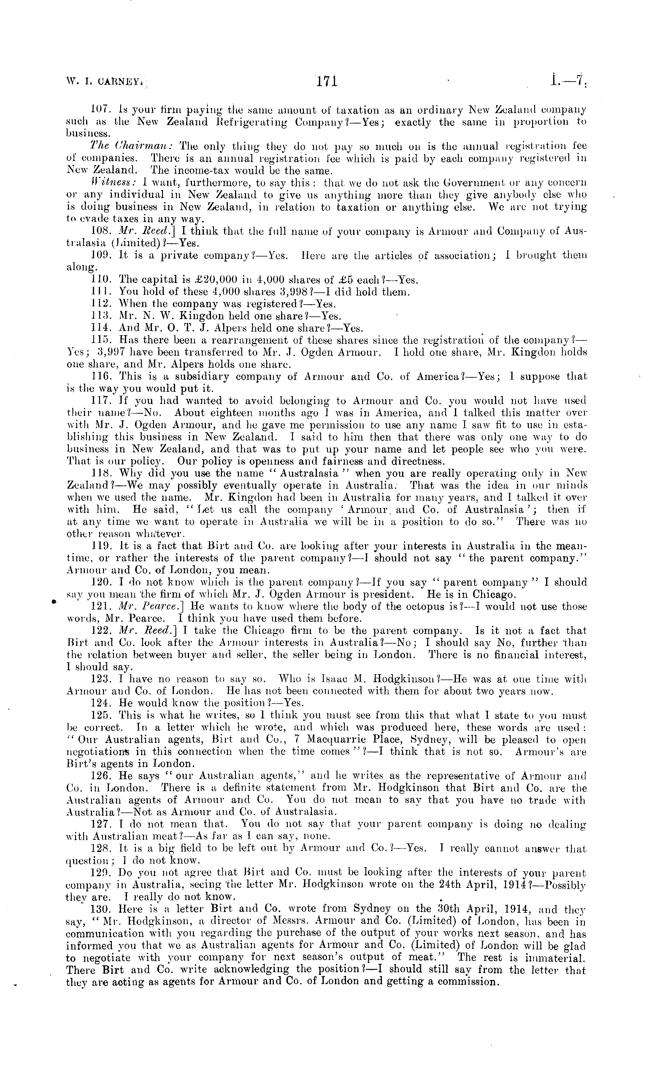 107. is your firm paying the same amount of taxation as an ordinary New Zealand company such as the New Zealand Refrigerating Company? —Yes; exactly the same in proportion to business. The Chairman: The only thing they do not pay so much on is the annual registration fee of companies. There is an annual registration fee which is paid by each company registered in New Zealand. The income-tax would be the same. Witness: 1 want, furthermore, to say this : that we do not ask the Government or any concern or any individual in New Zealand to give us anything more than they give anybody else who is doing business in New Zealand, in relation to taxation or anything else. We are not trying to evade taxes in any way. 108. Mr. Reed.] I think that the full name of your company is Armour and Company of Australasia (Limited)? —Yes. 109. It is a private company?— Yes. Here are the articles of association; I brought them along. 110. The capital is £20,000 in 4,000 shares of £5 each?— Yes. II I. You hold of these 4,000 shares 3,998?—1 did hold them. 112. When the company was registered? —Yes. 113. Mr. N. W. Kingdon held one share? —Y*es. 114. And Mr. O. T. J. Alpers held one share?— Yes. 115. Has there been a rearrangement of these shares since the registration of the company?— Yes; 3,997 have been transferred to Mr. J. Ogden Armour. I hold one share, Mr, Kingdon holds one share, and Mr. Alpers holds one share. 116. This is a subsidiary company of Armour and Co. of America?— Yea; 1 suppose that is the way you would put it. 117. If you had wanted to avoid belonging to Armour and Co. you would not have used their name? —No. About eighteen months ago 1 was in America, and I talked this matter over with Mr. J. Ogden Armour, and he gave me permission to use any name I saw fit to use in establishing this business in New Zealand. I said to him then that there was only one way to do business in New Zealand, and that was to put up your name and let people see who you were. That is our policy. Our policy is openness and fairness and directness. 118. Why did you use the name "Australasia" when you are really operating only in NewZealand? —We may possibly eventually operate in Australia, That was the idea in our minds when we used the name. Mr. Kingdon had been in Australia for many years, and I talked it over with him. He said, "Let us call the company ' Armour, and Co. of Australasia'; then if at any time we want to operate in Australia we will be in a position to do so." There was no other reason whatever. 119. It is a fact that Birt and Co. are looking after your interests in Australia in the meantime, or rather the interests of the parent company?—l should not say "the parent company." Armour and Co. of London, you mean. 120. I do not know which is the parent company?—lf you say " parent company " I should say you mean the firm of which Mr. J. Ogden. Armour is president. He is in Chicago. 121. Mr. Pearce.] He wants to know where the body of the octopus is?—l would not use those words, Mr. Pearce. I think you have used them before. 122. Mr. Reed.] I take the Chicago firm to be the parent company. Is it not a fact that Birt and Co. look after the Armour interests in Australia? —No; I should say No, further 'than the relation between buyer and seller, the seller being in London. There is no financial interest, I should say. 123. I have no reason to say so. Who is Isaac M, Hodgkinson?—He was at one time with Armour and Co. of London. He has not been connected with them for about two years now. 124. He would know the position?— Yes. 125. This is what he writes, so 1 think you must see from this that what 1 state to you musl be correct. In a letter which he wrote, and which was produced here, these words are used ; " Our Australian agents, Birt and Co., 7 Macquarrie Place, Sydney, will be pleased to open negotiations in this connection when the time comes"? —I think that is not so. Armour's are Birt's agents in London. 126. He says "our Australian agents," and he writes as the representative of Armour and Co. in London. There is a definite statement from Mr. Hodgkinson that, Birt and Co. are the Australian agents of Armour and Co. You do not mean to say that you have no trade with Australia? —Not as Armour and Co. of Australasia. 127. I do not mean that. You do not say that your parent company is doing no dealing with Australian meat?—As far as I can say, none. 128. It is a big field to be left out by Armour and Co.?— Yes. I really cannot, answer that question; 1 do not know, 129. Do you not agree that Birt and Co. must be looking after the interests of your parent, company in Australia, seeing the letter Mr. Hodgkinson wrote on the 24th April, 1914?— Possibly they are. I really do not know. 130. Here is a letter Birt, and Co. wrote from Sydney on the 30th April, 1914, and they say, "Mr. Hodgkinson, a director of Messrs. Armour and Co. (Limited) of London, has been in communication with you regarding the purchase of the output of your works next season, and has informed you that we as Australian agents for Armour and Co. (Limited) of London will be glad to negotiate with your company for next season's output of meat," The rest is immaterial. There Birt and Co. write acknowledging the position?—l should still say from the letter that they are acting as agents for Armour and Co. of London and getting a commission.