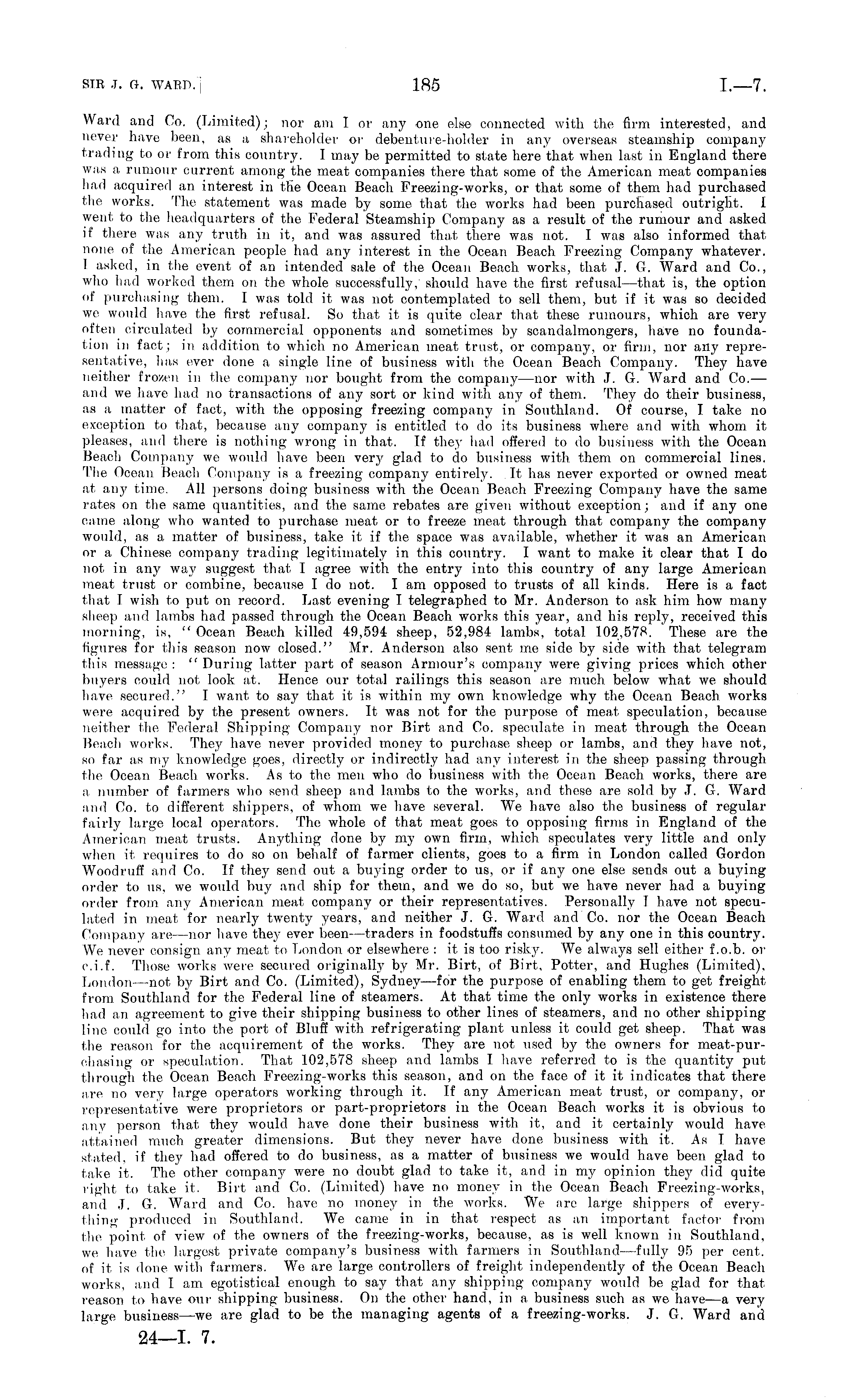 Ward and Co. (himited); nor am I or any one else connected with the firm interested, and never have been, as a shareholder or debenture-holder in any overseas steamship company trading to or from this country. I may be permitted to state here that when last in England there was a rumour current among the meat companies there that some of the American meat companies had acquired an interest in the Ocean Beach Freezing-works, or that some of them had purchased the works. The statement was made by some that the works had been purchased outright. I went to the headquarters of the Federal Steamship Company as a result of the rumour and asked if there was any truth in it, and was assured that there was not. I was also informed that none of the American people had any interest in the Ocean Beach Freezing Company whatever. I asked, in the event of an intended sale of the Ocean Beach works, that J. G. Ward and Co., who had worked them on the whole successfully,' should have the first refusal —that is, the option of purchasing them. I was told it was not contemplated to sell them, but if it was so decided we, would have the first refusal. So that it is quite clear that these rumours, which are very often circulated by commercial opponents and sometimes by scandalmongers, have no foundation in fact; in addition to which no American meat trust, or company, or firm, nor any representative, has ever done a single line of business with the Ocean Beach Company. They have neither frozen in the company nor bought from the company —nor with J. G. Ward and Co. — and we have had no transactions of any sort or kind with any of them. They do their business, as a matter of fact, with the opposing freezing company in Southland. Of course, I take no exception to that, because any company is entitled to do its business where and with whom it pleases, and there is nothing wrong in that. If they had offered to do business with the Ocean Beach Company we would have been ver)f glad to do business with them, on commercial lines. The Ocean Beach Company is a freezing company entirely. It has never exported or owned meat at any time. All persons doing business with the Ocean Beach Freezing Company have the same rates on the same quantities, and the same rebates are given without exception; and if any one came along who wanted to purchase meat or to freeze meat through that company the company would, as a matter of business, take it if the space was available, whether it was an American or a Chinese company trading legitimately in this country. I want to make it clear that I do not in any way suggest that I agree with the entry into this country of any large American meat trust or combine, because I do not. I am opposed to trusts of all kinds. Here is a fact that I wish to put on record, hast evening T telegraphed to Mr. Anderson to ask him how many slieep and lambs had passed through the Ocean Beach works this year, and his reply, received this morning, is, " Ocean Beach killed 49,594 sheep, 52,984 lambs, total 102,578. These are the figures for this season now closed." Mr. Anderson also sent me side by side with that telegram this message : " During latter part of season Armour's company were giving prices which other buyers could not look at. Hence our total railings this season are much below what we should have secured." I want to say that it is within my own knowledge why the Ocean Beach works were acquired by the present owners. It was not for the purpose of meat speculation, because neither the Federal Shipping Company nor Birt and Co. speculate in meat through the Ocean Beach works. They have never provided money to purchase sheep or lambs, and they have not, so far as my knowledge goes, directly or indirectly had any interest in the sheep passing through the Ocean Beach works. As to the men who do business with the Ocean Beach works, there are a, number of farmers who send sheep and lambs to the works, and these are sold by ,T. G. Ward and Co. to different shippers, of whom we have several. We have also the business of regular fairly large local operators. The whole of that meat goes to opposing firms in England of the American meat trusts. Anything done by my own firm, which speculates very little and only when it, requires to do so on behalf of farmer clients, goes to a firm in hondon called Gordon Woodruff and Co. If they send out a buying order to us, or if any one else sends out a buying order to us, we would buy and ship for them, and we do so, but we have never had a buying order from any American meat company or their representatives. Personally I have not speculated in meat for nearly twenty years, and neither J. G. Ward and Co. nor the Ocean Beach Company are —nor have they ever been—traders in foodstuffs consumed by any one in this country. We never consign any meat to hondon or elsewhere :it is too risky. We always sell either f.o.b. or c.i.f. Those works were secured originally by Mr. Birt, of Birt, Potter, and Hughes (himited), hondon —not b}' Birt and Co. (himited), Sydney—for the purpose of enabling them to get freight from Southland for the Federal line of steamers. At that time the only works in existence there had an agreement to give their shipping business to other lines of steamers, and no other shipping line could go into the port of Bluff with refrigerating plant unless it could get sheep. That was the reason for the acquirement of the works. They are not used by the owners for meat-pur-chasing or speculation. That 102,578 sheep and lambs I. have referred to is the quantity put through the Ocean Beach Freezing-works this season, and on the face of it it indicates that there are no very large operators working through it. If any American meat trust, or company, or representative were proprietors or part-proprietors in the Ocean Beach works it is obvious to any person that they would have done their business with it, and it certainly would have, attained much greater dimension