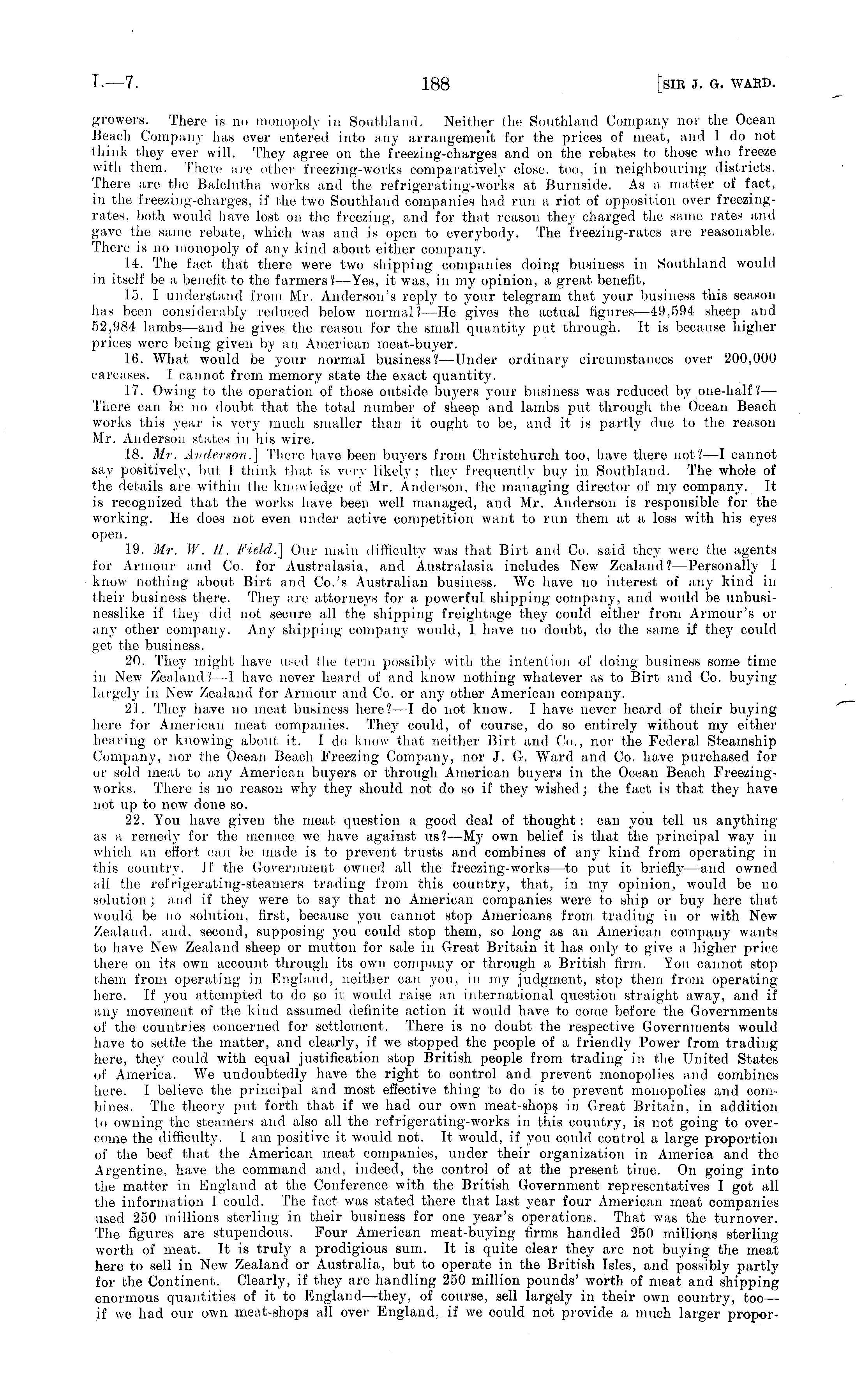 growers. There is no monopoly in Southland. Neither the Southland Company nor the Ocean Beach Company has ever entered into any arrangement for the prices of meat, and 1 do not think they ever will. They agree on the freezing-charges and on the rebates to those who freeze with them. There are other freezing-works comparatively close, too, in neighbouring districts. There are the Balolutha works and the refrigerating-works at Burnside. As a matter of fact, in the freezing-charges, if the two Southland companies had run a riot of opposition over freezingrates, both would have lost on the freezing, and for that reason they charged the same rates and gave the same rebate, which was and is open to everybody. The freezing-rates are reasonable. There is no monopoly of any kind about either company. 14. The fact that there were two shipping companies doing business in Southland would in itself be a benefit to the farmers? —Yes, it was, in my opinion, a great benefit. 15. I understand from Mr. Anderson's reply to your telegram that your business this season has been considerably reduced below normal?—He gives the actual figures —49,594 sheep and 52,984 lambs —and he gives the reason for the small quantity put through. It is because higher prices were being given by an American meat-buyer. 16. What would be your normal business? —Under ordinary circumstances over 200,000 carcases. I cannot, from memory state the exact quantity. .17. Owing to the operation of those outside buyers your business was reduced by one-half? — There can be no doubt that the total number of sheep and lambs put through the Ocean Beach works this year is very much smaller than it ought to be, and it is partly due to the reason Mr. Anderson states in his wire. 18. Mr. Anderson.] There have been buyers from Christchurch too, have there not? —I cannot say positively, but 1 think that is very likely; they frequently buy in Southland. The whole of the details are within the knowledge of Mr. Anderson, the managing director of my company. It is recognized that the works have been well managed, and Mr. Anderson is responsible for the working. He does not even under active competition want to run them at a loss with his eyes open. 19. Mr. W. 11. Field,.] Our main difficult}' was that Birt and Co. said they were the agents for Armour and Co. for Australasia, and Australasia includes New Zealand? —Personally 1 know nothing about Birt and Co.'s Australian business. We have no interest of any kind in their business there. They are attorneys for a powerful shipping company, and would be unbusinesslike if they did not secure all the shipping freightage they could either from Armour's or any other company. Any shipping company would, 1 have no doubt, do the same ii they could get the business. 20. They might have used the term possibly with the intention of doing business some time in New Zealand?—l have never heard of and know nothing whatever as to Birt and Co. buying largely in New Zealand for Armour and Co. or any other American company. 21. They have no meat business here?—l do not know. I have never heard of their buying here for American meat companies. They could, of course, do so entirely without my either hearing or knowing about it. I do know that neither Birt and Co., nor the Federal Steamship Company, nor the Ocean Beach Freezing Company, nor J. G. Ward and Co. have purchased for or sold meat to any American buyers or through American buyers in the Ocean Beach Freezingworks. There is no reason why they should not do so if they wished; the fact is that they have not up to now done so. 22. You have given the meat question a, good deal of thought : can you tell us anything as a remedy for the menace we have against us?—My own belief is that the principal way in which an effort can be made is to prevent trusts and combines of any kind from operating in this country. If the Government owned all the freezing-works —to put it briefly —and owned all the refrigerating-steamers trading from this country, that, in my opinion, would be no solution; and if they were to say that no American companies were to ship or buy here that would be no solution, first, because you cannot stop Americans from trading in or with New Zealand, and, second, supposing you could stop them, so long as an American company wants to have New Zealand sheep or mutton for sale in Great Britain it has only to give a higher price there on its own account through its own company or through a, British firm. You cannot stop them from operating in England, neither can you, in my judgment, stop them from operating here. If you attempted to do so it would raise an international question straight away, and if any movement of the kind assumed definite action it would have to come before the Governments of the countries concerned for settlement. There is no doubt the respective Governments would have to settle the matter, and clearly, if we stopped the people of a friendly Power from trading here, they could with equal justification stop British people from trading in the United States of America. We undoubtedly have the right to control and prevent monopolies and combines here. I believe the principal and most effective thing to do is to prevent monopolies and combines. The theory put forth that if we had our own meat-shops in Great Britain, in addition to owning the steamers and also all the refrigerating-works in this country, is not going to overcome the difficulty. lam positive it would not. It would, if you could control a large proportion of the beef that the American meat companies, under their organization in America and the Argentine, have the command and, indeed, the control of at the present time. On going into the matter in England at the Conference with the British Government representatives I got all the information 1 could. The fact was stated there that last year four American meat companies used 250 millions sterling in their business