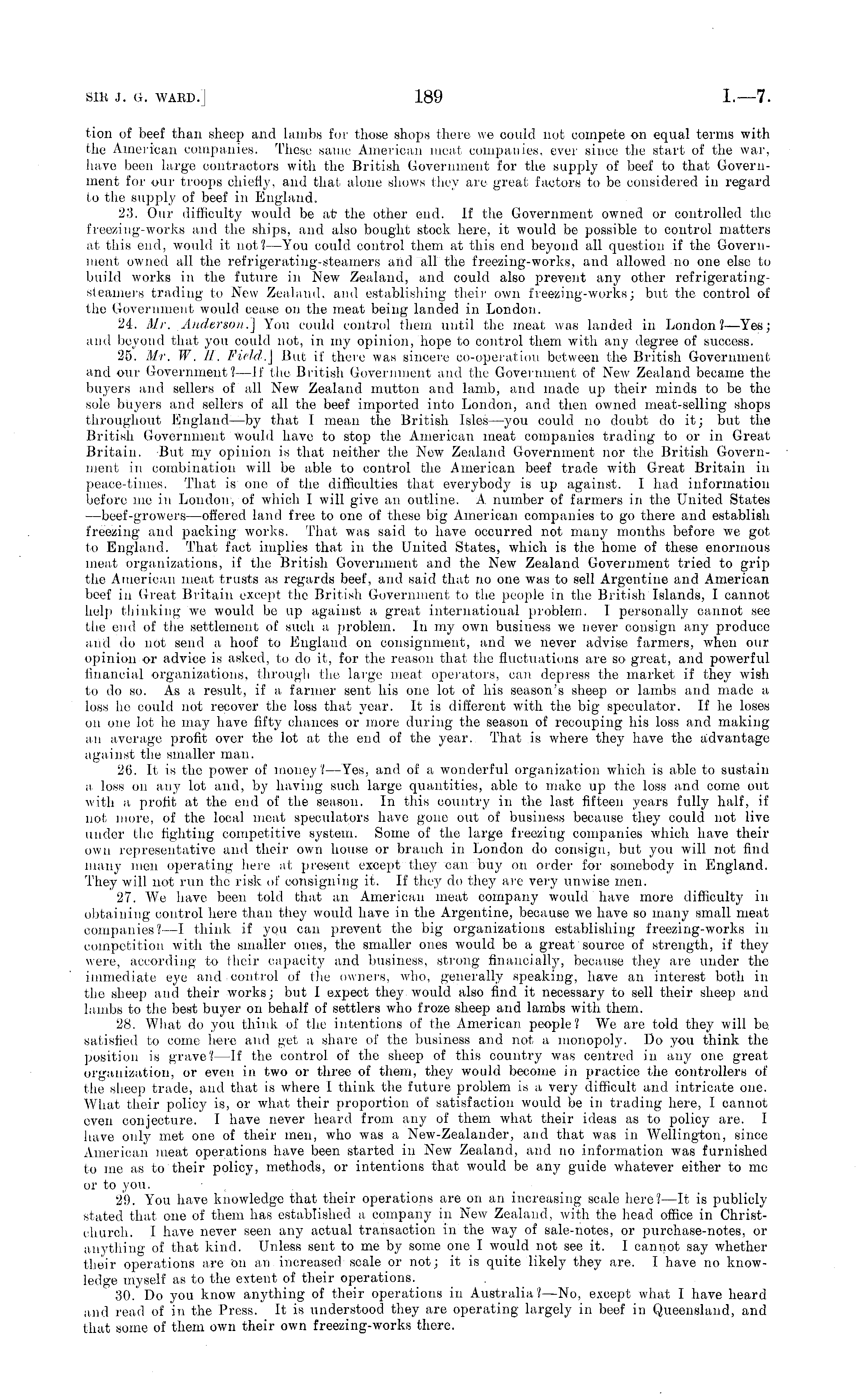 tion of beef than sheep and lambs for those shops there we could not compete on equal terms with the American companies. These same American meal companies, ever since the start of the war, have been large contractors with the British Government for tho supply of beef to that Government for our troops chiefly, and that alone shows they are great, factors to be considered in regard to the supply of beef in England. 23. Our difficulty would be at the other end. If the Government owned or controlled the freezing-works and the ships, and also bought stock here, it would be possible to control matters at this end, would it not? —You could control them at this end beyond all question if the Government owned all the refrigerating-steamers and all the freezing-works, and allowed no one else to build works in the future in New Zealand, and could also prevent any other refrigeratingsteamers trading to New Zealand, and establishing their own freezing-works; but the control of the Government would cease on the meat being landed in London. 24. Mr. Anderson.] You could control them until the meat was landed in London?— Yes; and beyond that you could not, in my opinion, hope to control them with any degree of success. 25. Mr. W. 11. Field.] But if there was sincere co-operation between the British Government and our Government?—lf the British Government and the Government of New Zealand became the buyers and sellers of all New Zealand mutton and lamb, and made up their minds to be the sole buyers and sellers of all the beef imported into London, and then owned meat-selling shops throughout England—by that I mean the British Isles—you could no doubt do it; but the British Government would have to stop the American meat companies trading to or in Great Britain. But my opinion is that neither the New Zealand Government nor the British Government in combination will be able to control the American beef trade with Great Britain in peace-times. That is one, of the difficulties that everybody is up against. 1 had information before me in London, of which I will give an outline. A. number of farmers in the United States —beef-growers—offered land free to one of these big American companies to go there and establish freezing and packing works. That was said to have occurred not many months before we got to England. That fact implies that in the United States, which is the home of these enormous meat organizations, if the British Government and the New Zealand Government tried to grip the American meat trusts as regards beef, and said that no one was to sell Argentine and American beef in Great Britain except the British Government to the people in the British Islands, I cannot help thinking we would be up against a great international problem, I personally cannot see the end of the settlement of such a problem. In my own business we never consign any produce and do not send a hoof to England on consignment, and we never advise farmers, when our opinion or advice is asked, to do it, for the reason that the fluctuations are so great, and powerful financial organizations, through the large meal operators, can depress the market, if they wish to do so. As a, result, if a, farmer sent his one lot of his season's sheep or lambs and made a, loss he could not recover the loss that year. It is different with the big speculator. If he loses on one lot he may have fifty chances or more during the season of recouping his loss and making an average profit over the lot at the end of the year. That is where they have the advantage against the smaller man. 26. It is the power of money?— Yes, and of a wonderful organization which is able to sustain a loss on any lot and, by having such large quantities, able to make up the loss and come out with a profit at the end of the season. In this country in the last fifteen years fully half, if not more, of the local meat speculators have gone out of business because they could not live under the fighting competitive system. Some of the large freezing companies which have their own representative and their own house or branch in London do consign, but you will not find many men operating here at present except they can buy on order for somebody in England. They will not run the risk of consigning it. If they do they are very unwise men. 27. We have been told that an American meat company would have more difficulty in obtaining control here than they would have in the Argentine, because we have so many small meat companies? —I think if you can prevent the big organizations establishing freezing-works in competition with the smaller ones, tho smaller ones would be a great source of strength, if they were, according to their capacity and business, strong financially, because they are under the immediate eye and control of the owners, who, generally speaking, have an interest both in the sheep and their works; but 1 expect they would also find it necessary to sell their sheep and lambs to the best buyer on behalf of settlers who froze sheep and lambs with them. 28. What do you think of the intentions of the American people? We are told they will be satisfied to come here and get a share of the business and not a monopoly. Do you think the position is grave?—lf the control of the sheep of this country was centred in any one great organization, or even in two or three of them, they would become in practice the controllers of the sheep trade, and that is where I think the future problem is a very difficult and intricate one. What their policy is, or what their proportion of satisfaction would be in trading here, I cannot oven conjecture. I have never heard from any of them what their ideas as to policy are. 1 have only met one of their men, who was a New-Zealander, and that was in Wellington, since American meat operations have been started in New Zealand, and no information was furnished to me as to their policy, methods, or intentions that would be any guide whatever eith
