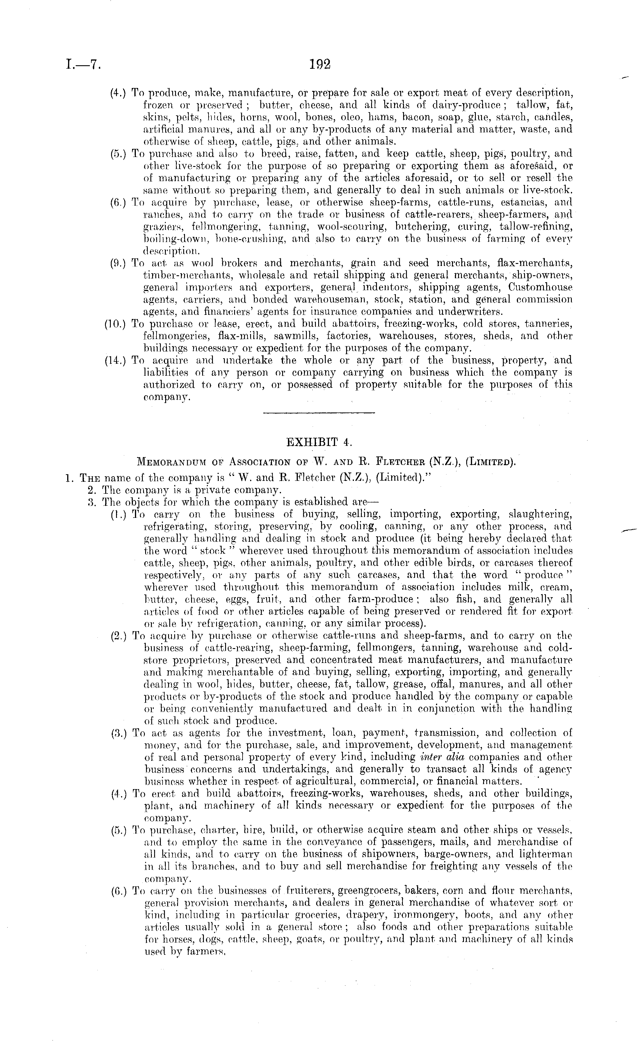 EXHIBIT 4, Memorandum op Association op W. and R. Fletcher (N.Z.), (Limited). 1. The name of the company is " W. and R. Fletcher (N.Z.), (Limited)." 2. The company is a private company. 3. The objects for which the company is established are — (I.) To carry on the business of buying, selling, importing, exporting, slaughtering, refrigerating, storing, preserving, by cooling, canning, or any other process, and generally handling and dealing in stock and produce (it being hereby declared that the word " stock " wherever used throughout this memorandum of association includes cattle, sheep, pigs, other animals, poultry, and other edible birds, or carcases thereof respectively, or any parts of any such carcases, and that the word " produce " wherever used throughout this memorandum of association includes milk, cream, butter, cheese, eggs, fruit, and other farm-produce; also fish, and generally all articles of food or other articles capable of being preserved or rendered fit for export or sale by refrigeration, canning, or any similar process). (2.) To acquire by purchase or otherwise cattle-runs and sheep-farms, and to carry on the business of cattle-rearing, sheep-farming, fellmongers, tanning, warehouse and coldstore proprietors, preserved and concentrated meat manufacturers, and manufacture and making merchantable of and buying, selling, exporting, importing, and generally dealing in wool, hides, butter, cheese, fat, tallow, grease, offal, manures, and all other products or by-products of the stock and produce handled by the company or capable or being conveniently manufactured and dealt in. in conjunction with the handling of such stock and produce. (3.) To act as agents for the investment, loan, payment, transmission, and collection of money, and for the purchase, sale, and improvement, development, and management of real and personal property of every kind, including inter alia companies and other business concerns and undertakings, and generally to transact all kinds of agency business whether in respect of agricultural, commercial, or financial matters. (4.) To erect and build abattoirs, freezing-works, warehouses, sheds, and other buildings, plant, and machinery of all kinds necessary or expedient for the purposes of the company. (5.) To purchase, charter, hire, build, or otherwise acquire steam and other ships or vessels, and to employ the same in the conveyance of passengers, mails, and merchandise of all kinds, and to carry on the business of shipowners, barge-owners, and lighterman in all its branches, and to buy and sell merchandise for freighting any vessels of the company. (6.) To carry on the businesses of fruiterers, greengrocers, bakers, corn and flour merchants, general provision merchants, and dealers in general merchandise of whatever sort or kind, including in particular groceries, drapery, ironmongery, boots, and any other articles usually sold in a general store ; also foods and other preparations suitable for horses, dogs, cattle, sheep, goats, or poultry, and plant and machinery of all kinds used by farmers,