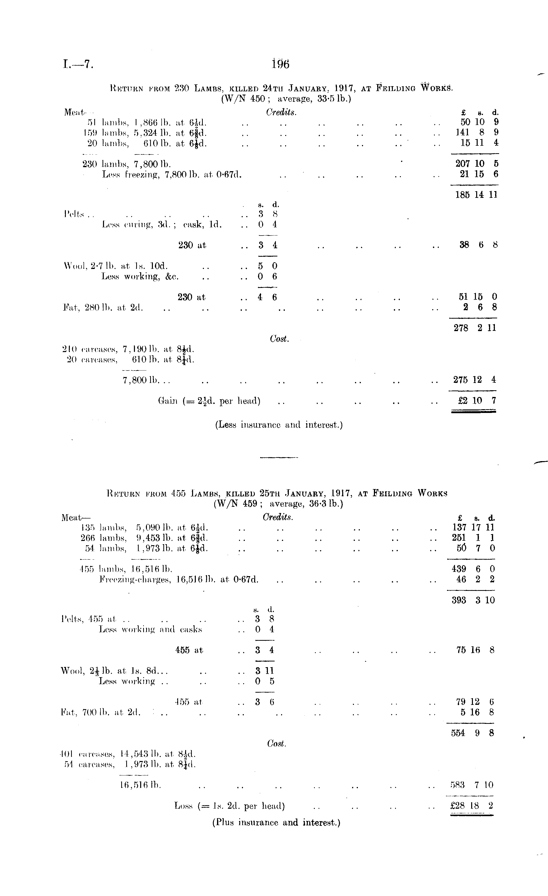 Return from 230 Lambs, killed 24tu January. 1917, at Feilding Works. (W/N 450 ; average, 33-5 lb.) Meat Credits. £ s. d. 51 lambs, I ,866 lb. at (i.'.il. .. .. .. .. .. .. 50 10 9 159 lambs, 5.324 Ib. at 6|d. .. .. .. .. .. .. 141 8 9 20 lambs, 610 lb. at 6Jd. .. .. .. .. .. . . 15 11 4 230 lambs, 7,800 Ib. 207 10 5 Less freezing, 7,800 Ib. at 0-67(1. .... .. .. . . 21 15 6 185 14 11 s. d. Pells.. .. .. .. ..3 8 Les>, curing, 3d.; cask, Id. .. 0 4 230 at ..34 .. .. .. .. 38 6 8 Wool, 2-7 Hi. at Is. 10d. .. ..5 0 Less working, &c. . . ..06 230 at, ..46 .. .. .. .. 51 15 0 Fat, 280 Ib. at 2d. .. .. .. .. .. .. .. .. 268 278 2 11 Cost. 210 carcases, 7, 190 lb. at B|d. 20 carcases, 610 Ib. at BJd. 7,8001b. .. .. .. .. .. .. .. .. 275 12 4 Gain (= 2sd. per head) .. .. .. .. .. £2 10 7 (Less insurance and interest,)