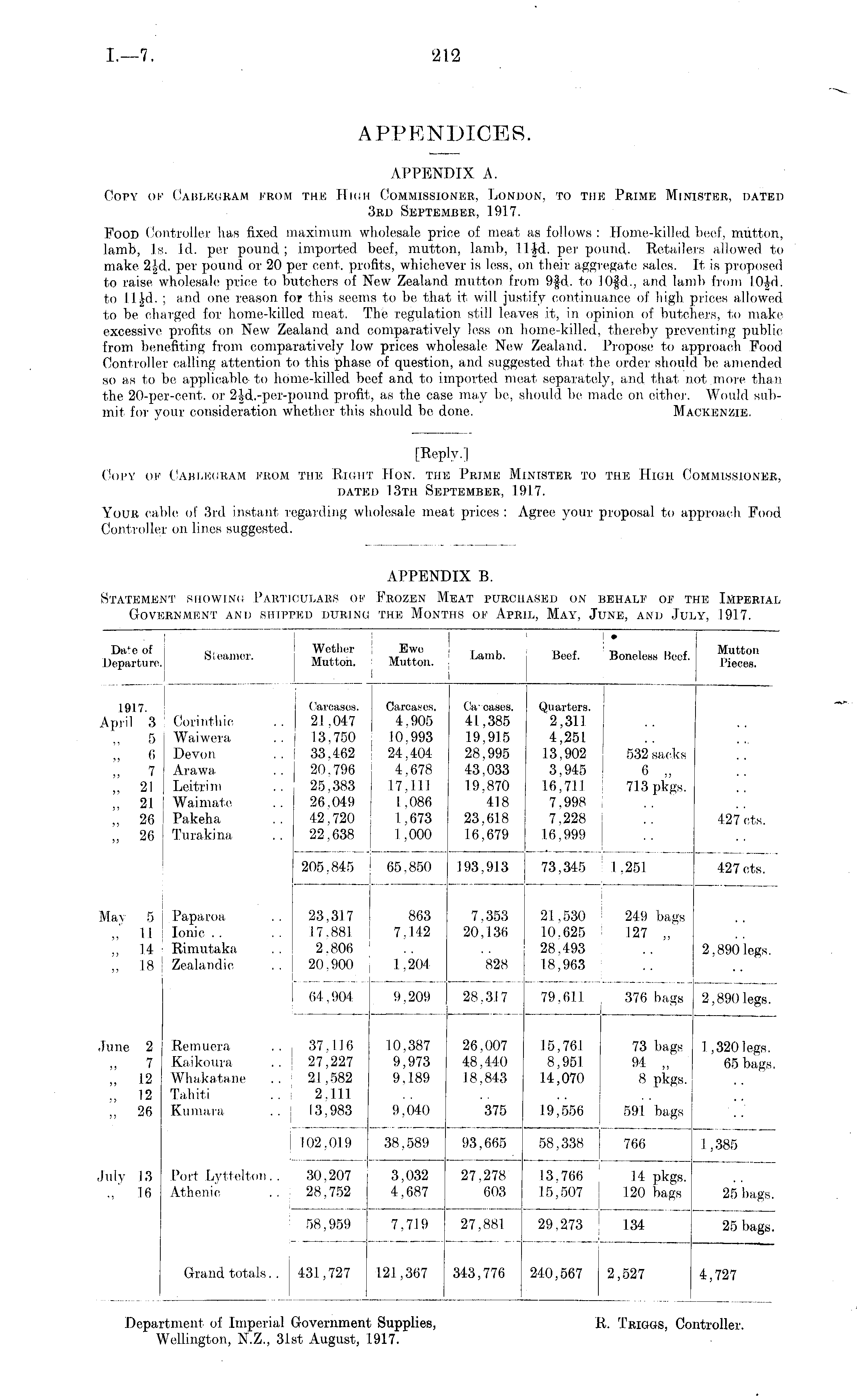 Department of Imperial Government Supplies, R. Triggs, Controller. Wellington, N.Z., 3.lst August, 1917.