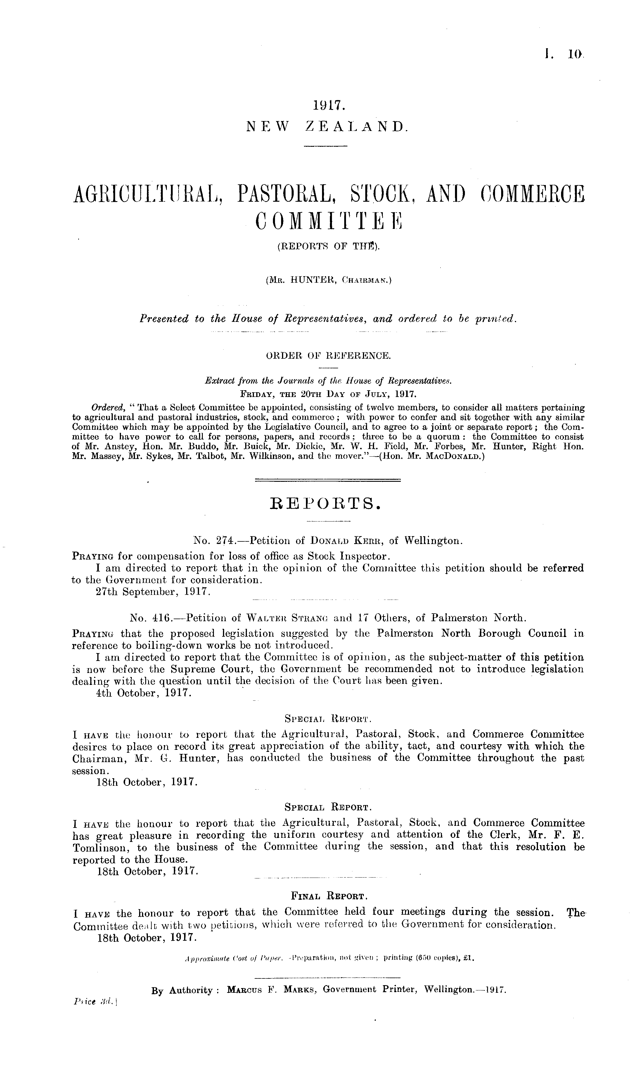 EEPOETS. No. 274.—Petition of Donald Kerb, of Wellington. Prating for compensation for loss of office as Stock Inspector. I am directed to report that in the opinion of the Committee this petition should be referred to the Government for consideration. 27th September, 1917. No. 416.—Petition of Walter Strang and 17 Others, of Palmerston North. Praying that the proposed legislation suggested by the Palmerston North Borough Council in reference to boiling-down works be not introduced. I am directed to report that the Committee is of opinion, as the subject-matter of this petition is now before the Supreme Court, the Government be recommended not to introduce legislation dealing with the question until the decision of the Court has been given. 4th October, 1917. Special Report. I have the honour to report that the Agricultural, Pastoral, Stock, and Commerce Committee desires to place on record its great appreciation of the ability, tact, and courtesy with which the Chairman, Mr. G. Hunter, has conducted the business of the Committee throughout the past session. 18th October, 1917. Special Report. I have the honour to report that the Agricultural, Pastoral, Stock, and Commerce Committee has great pleasure in recording the uniform courtesy and attention of the Clerk, Mr. F. E. Tomlinson, to the business of the Committee during the session, and that this resolution be reported to the House. 18th October, 1917. Final Report. I have the honour to report that the Committee held four meetings during the session. The Committee denlc with two petitions, which were referred to the Government for consideration. 18th October, 1917.