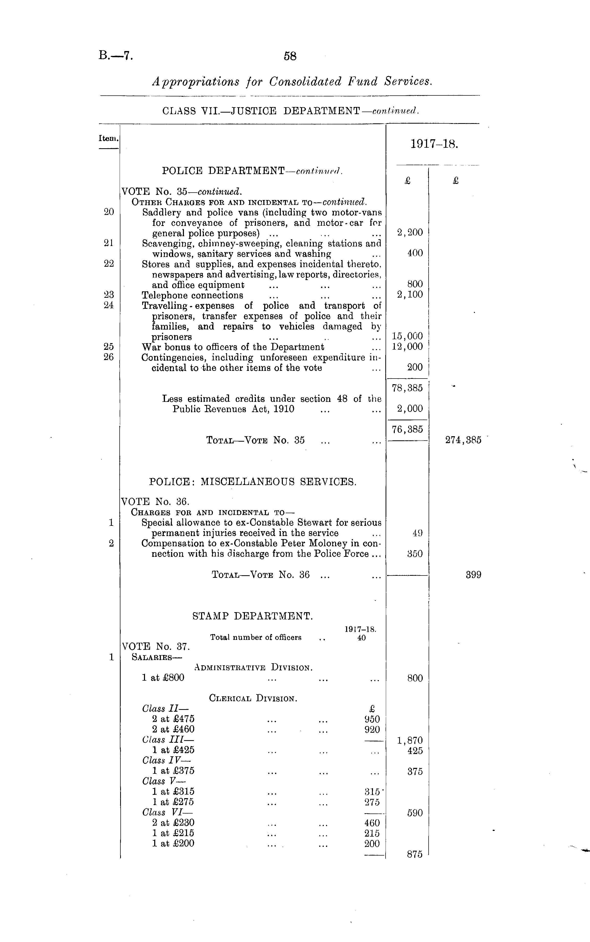 teni. 191 '-18. POLICE DEPARTMENT— continued. £ £ 20 21 22 VOTE No. 35— continued. Other Charges for and incidental to—continued. Saddlery and police vans (including two motor-vans for conveyance of prisoners, and motor-car for general police purposes) ... Scavenging, chimney-sweeping, cleaning stations and windows, sanitary services and washing Stores and supplies, and expenses incidental thereto, newspapers and advertising, law reports, directories, and office equipment Telephone connections Travelling - expenses of police and transport of prisoners, transfer expenses of police and their families, and repairs to vehicles damaged by prisoners War bonus to officers of the Department Contingencies, including unforeseen expenditure incidental to the other items of the vote 2,200 400 800 2,100 23 24 15,000 12,000 25 26 200 Less estimated credits under section 48 of the Public Revenues Act, 1910 78,385 2,000 Total—Vote No. 35 76,385 274,385 POLICE: MISCELLANEOUS SERVICES. 1 VOTE No. 36. Charges for and incidental to — Special allowance to ex-Constable Stewart for serious permanent injuries received in the service Compensation to ex-Constable Peter Moloney in connection with his discharge from the Police Force ... 2 49 350 Total —Vote No. 36 ... 399 STAMP DEPARTMENT. 1917-18. Total number of officers .. 40 VOTE No. 37. Salaries — Administrative Division. 1 at £800 800 Clerical Division. Class II— £ 2 at £475 ... ... 950 2 at £460 ... ... 920 Class III — 1 at £425 Class IV— 1 at £375 Class V— 1 at £315 ... ... 315 • 1 at £275 ... ... 275 Glass VI— 2 at £230 ... ... 460 1 at £215 ... ... 215 1 at £200 ... . ... 200 1,870 425 375 590 875