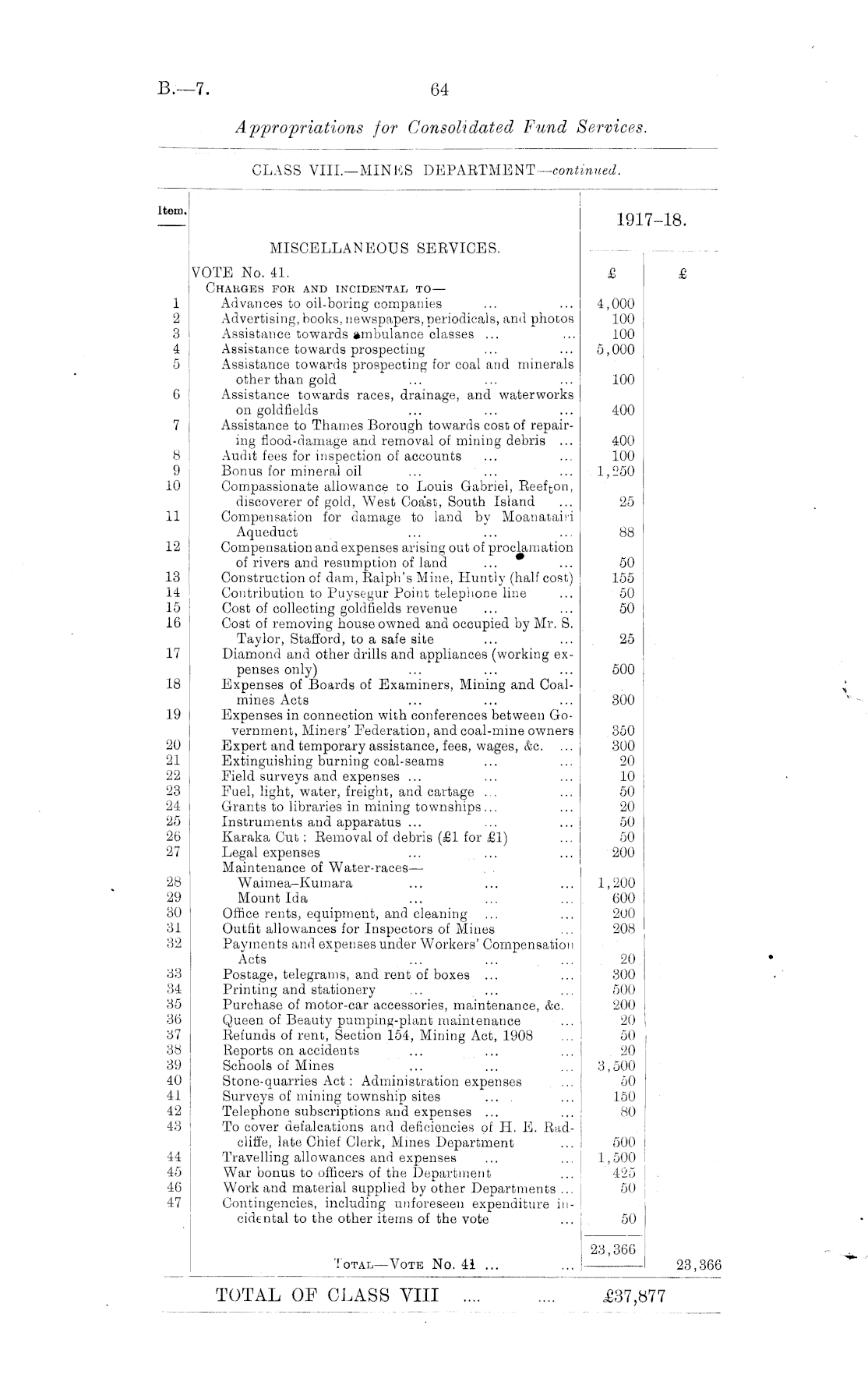 Item. 1917-18. MISCELLANEOUS SERVICES. VOTE No. 41. Charges for and incidental to — Advances to oil-boring companies Advertising, books, newspapers, periodicals, and photos Assistance towards ambulance classes ... Assistance towards prospecting Assistance towards prospecting for coal and minerals other than gold Assistance towards races, drainage, and waterworks on goldfields Assistance to Thames Borough towards cost of repairing flood-damage and removal of mining debris ... Audit fees for inspection of accounts Bonus for mineral oil Compassionate allowance to Louis Gabriel, Reef ton, discoverer of gold, West Coa'st, South Island Compensation for damage to land by Moanatairi Aqueduct Compensation and expenses arising out of proclamation of rivers and resumption of land Construction of dam, Ralph's Mine, Huntly (half cost) Contribution to Puysegur Point telephone line Cost of collecting goldfields revenue Cost of removing house owned and occupied by Mr. S. Taylor, Stafford, to a safe site Diamond and other drills and appliances (working expenses only) Expenses of Boards of Examiners, Mining and Coalmines Acts Expenses in connection with conferences between Government, Miners' Federation, and coal-mine owners Expert and temporary assistance, fees, wages, &c. Extinguishing burning coal-seams Field surveys and expenses ... Fuel, light, water, freight, and cartage ... Grants to libraries in mining townships ... Instruments and apparatus ... Karaka Cut: Removal of debris (£1 for £1) Legal expenses ... ... Maintenance of Water-races— . . Waimea-Kumara Mount Ida Office rents, equipment, and cleaning Outfit allowances for Inspectors of Mines Payments and expenses under Workers' Compensation Acts Postage, telegrams, and rent of boxes ... Printing and stationery Purchase of motor-car accessories, maintenance, &c. Queen of Beauty pumping-plant maintenance Refunds of rent, Section 154, Mining Act, 1908 Reports on accidents Schools of Mines Stone-quarries Act : Administration expenses Surveys of mining township sites Telephone subscriptions and expenses ... To cover defalcations and deficiencies of II. E. Radcliffe, late Chief Clerk, Mines Department Travelling allowances and expenses War bonus to officers of the Department Work and material supplied by other Departments ... Contingencies, including unforeseen expenditure incidental to the other items of the vote £ £ 1 2 3 4 5 4,000 100 100 5,000 6 100 7 400 8 9 10 400 100 1,250 11 25 12 88 13 14 15 16 50 155 50 50 17 25 18 500 19 300 20 21 22 23 24 25 26 27 350 300 20 10 50 20 50 50 200 28 29 30 31 32 1,200 600 200 208 33 34 35 36 37 38 39 40 41 42 43 20 300 500 200 20 50 20 3,500 50 150 80 44 45 46 47 500 1,500 425 i 50 50 Total —Vote No. 41 ... 23,366 2f 23,366 TOTAL OF CLASS VIII £37, ■77