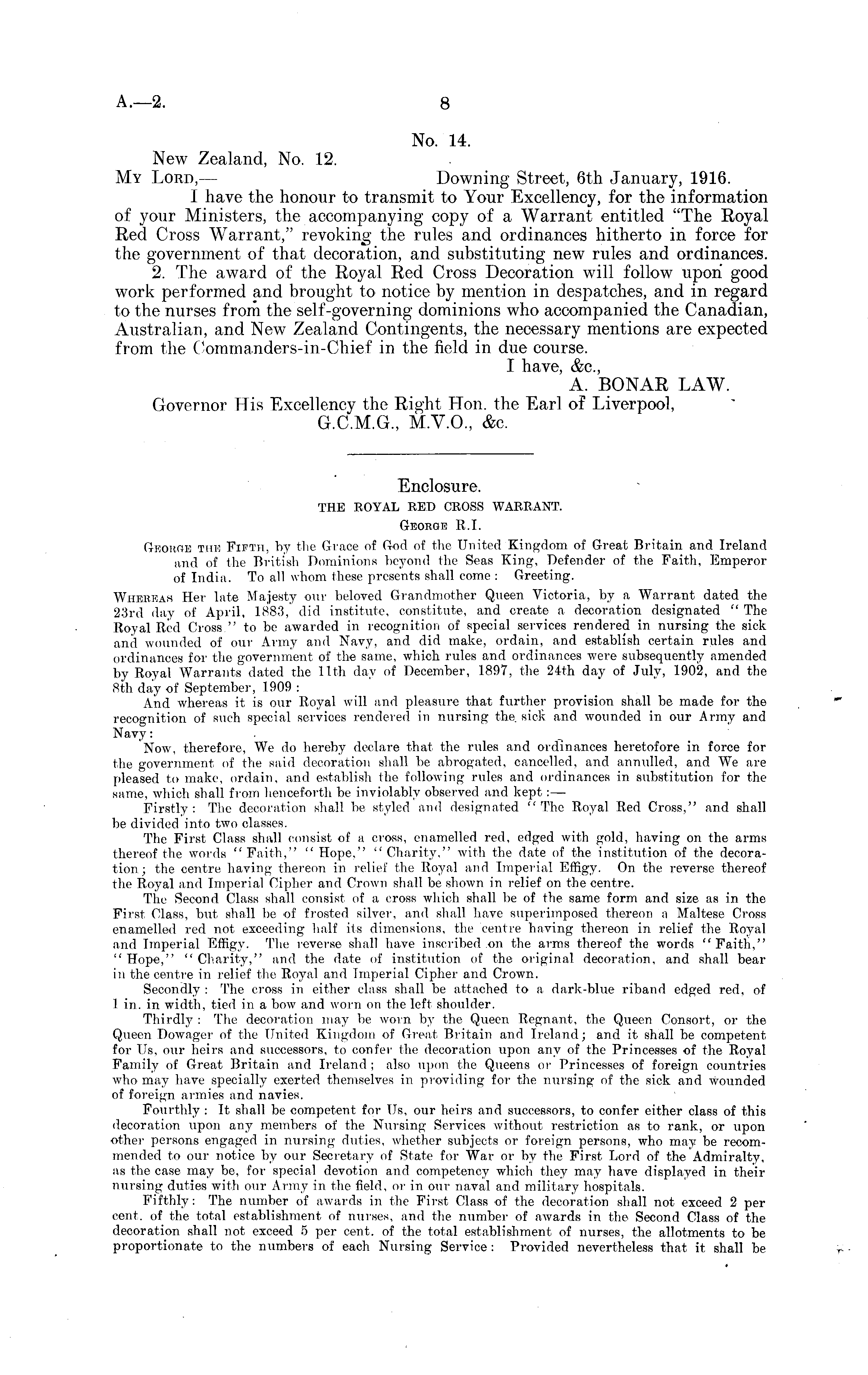 No. 14. New Zealand, No. 12. My Lord, — Downing Street, 6th January, 1916. I have the honour to transmit to Your Excellency, for the information of your Ministers, the accompanying copy of a Warrant entitled "The Royal Red Cross Warrant," revoking the rules and ordinances hitherto in force for the government of that decoration, and substituting new rules and ordinances. 2. The award of the Royal Red Cross Decoration will follow upon good work performed and brought to notice by mention in despatches, and in regard to the nurses from the self-governing dominions who accompanied the Canadian, Australian, and New Zealand Contingents, the necessary mentions are expected from the Commanders-in-Chief in the field in due course. I have, &c, A. BONAR LAW. Governor His Excellency the Right Hon. the Earl of Liverpool, G.C.M.G., M.V.0., &c.