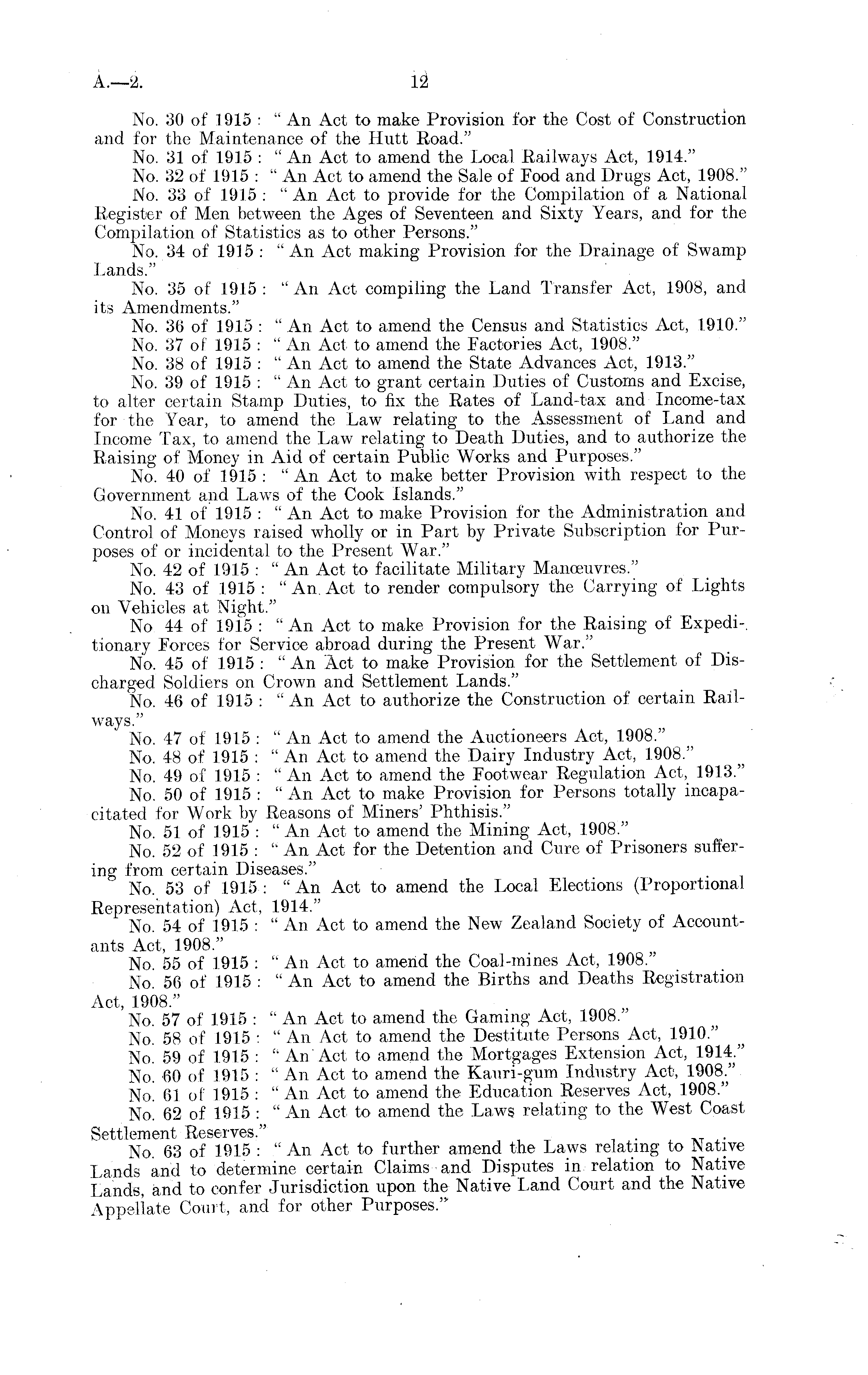 No. 30 of 1915 : " An Act to make Provision for the Cost of Construction and for the Maintenance of the Hutt Road." No. 31 of 1915 : " An Act to amend the Local Railways Act, 1914." No. 32 of 1915 : " An Act to amend the Sale of Food and Drugs Act, 1908." No. 33 of 1915 : "An Act to provide for the Compilation of a National Register of Men between the Ages of Seventeen and Sixty Years, and for the Compilation of Statistics as to other Persons." No. 34 of 1915 : "An Act making Provision for the Drainage of Swamp Lands." No. 35 of 1915 : " An Act compiling the Land Transfer Act, 1908, and its Amendments." No. 36 of 1915 : " An Act to amend the Census and Statistics Act, 1910." No. 37 of 1915 : "An Act to amend the Factories Act, 1908." No. 38 of 1915 : " An Act to amend the State Advances Act, 1913." No. 39 of 1915 : " An Act to grant certain Duties of Customs and Excise, to alter certain Stamp Duties, to fix the Rates of Land-tax and Income-tax for the Year, to amend the Law relating to the Assessment of Land and Income Tax, to amend the Law relating to Death Duties, and to authorize the Raising of Money in Aid of certain Public Works and Purposes." No. 40 of 1915 : " An Act to make better Provision with respect to the Government and Laws of the Cook Islands." No. 41 of 1915 : " An Act to make Provision for the Administration and Control of Moneys raised wholly or in Part by Private Subscription for Purposes of or incidental to the Present War." No. 42 of 1915 : " An Act to facilitate Military Manoeuvres." No. 43 of 1915 : " An. Act to render compulsory the Carrying of Lights on Vehicles at Night." No 44 of 1915 : "An Act to make Provision for the Raising of Expedi-, tionary Forces for Service abroad during the Present War." No. 45 of 1915 : "An Act to make Provision for the Settlement of Discharged Soldiers on Crown and Settlement Lands." No. 46 of 1915 : "An Act to authorize the Construction of certain Railways." No. 47 of 1915 : " An Act to amend the Auctioneers Act, 1908." No. 48 of 1915 : " An Act to amend the Dairy Industry Act, 1908." No. 49 of 1915 : " An Act to amend the Footwear Regulation Act, 1913." No. 50 of 1915 : " An Act to make Provision for Persons totally incapacitated for Work by Reasons of Miners' Phthisis." No. 51 of 1915 : "An Act to amend the Mining Act, 1908." No. 52 of 1915 : " An Act for the Detention and Cure of Prisoners suffering from certain Diseases." No. 53 of 1915 : "An Act to amend the Local Elections (Proportional Representation) Act, 1914." No. 54 of 1915 : " An Act to amend the New Zealand Society of Accountants Act, 1908." No. 55 of 1915 : "An Act to amend the Coal-mines Act, 1908. No. 56 of 1915 : "An Act to amend the Births and Deaths Registration Act, 1908." No. 57 of 1915 : " An Act to amend the Gaming Act, 1908. No. 58 of 1915 : " An Act to amend the Destitute Persons Act, 1910." No. 59 of 1915 : " An Act to amend the Mortgages Extension Act, 1914." No. 60 of 1915 : " An Act to amend the Kauri-gum Industry Act, 1908." No. 61 of 1915 : " An Act to amend the Education Reserves Act, 1908." No! 62 of 1915 : "An Act to amend the Laws relating to the West Coast Settlement Reserves." No. 63 of 1915 : "An Act to further amend the Laws relating to Native Lands and to determine certain Claims and Disputes in relation to Native Lands, and to confer Jurisdiction upon the Native Land Court and the Native Appellate Court, and for other Purposes."
