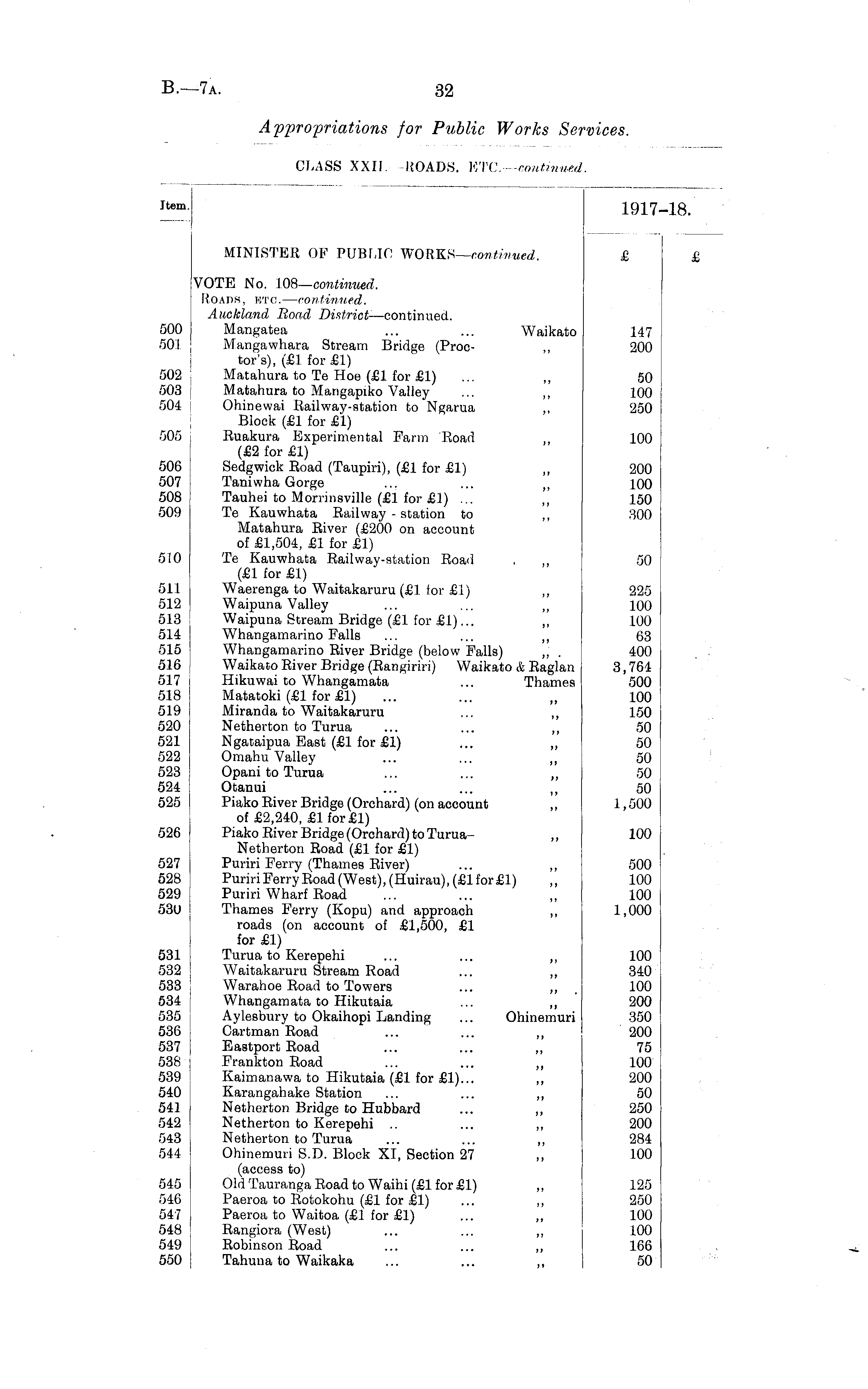 Item. 191718. MINISTER OF PUBLIC WORKS— continued. £ £ 500 501 502 503 504 505 506 507 508 509 510 511 512 513 514 515 516 517 518 519 520 521 522 523 524 525 VOTE No. 108— continued. Roads, etc. — continued. Auckland Boad District— continued. Mangatea ... ... Waikato Mangawhara Stream Bridge (Proctor's), (£1 for £1) Matahura to Te Hoe (£1 for £1) Matahura to Mangapiko Valley ... ,, Ohinewai Railway-station to Ngarua ,, Block (£1 for £1) Ruakura Experimental Farm Road , (£2 for £1) Sedgwick Road (Taupiri), (£1 for £1) Taniwha Gorge Tauhei to Morrmsville (£1 for £1) ... ," Te Kauwhata Railway - station to ,, Matahura River (£200 on account of £1,504, £1 for £1) Te Kauwhata Railway-station Road . ,, (£1 for £1) Waerenga to Waitakaruru (£1 lor £1) ,, Waipuna Valley ... ... ,, Waipuna Stream Bridge (£1 for £1)... ,, Whangamarino Falls ... ... ,, Whangamarino River Bridge (below Falls) ,, Waikato River Bridge (Eangiriri) Waikato & Eaglan Hikuwai to Whangamata ... Thames Matatoki (£1 for £1) Miranda to Waitakaruru ... ,, Netherton to Turua ... ... ,, Ngataipua East (£1 for £1) Omahu Valley ... ... ,, Opani to Turua ... ... ,, Otanui ... ... ,, Piako Eiver Bridge (Orchard) (on account ,, of £2,240, £lfor£l) Piako Eiver Bridge (Orchard) to Turua- ,, Netherton Eoad (£1 for £1) Puriri Ferry (Thames Eiver) ... ,, Puriri Ferry Eoad (West), (Huirau), (£1 for £1) Puriri Wharf Eoad Thames Ferry (Kopu) and approach ,, roads (on account of £1,500, £1 for £1) Turua to Kerepehi ... ... ,, Waitakaruru Stream Road ... ,, Warahoe Eoad to Towers ... ,, Whangamata to Hikutaia ... ,, Aylesbury to Okaihopi Landing ... Ohinemuri Cartman Eoad ... ... ,, Eastport Eoad ... ... ,, Frankton Eoad ... ... ,, Kaimanawa to Hikutaia (£1 for £1)... ,, Karangahake Station ... ... „ Netherton Bridge to Hubbard ... ,, Netherton to Kerepehi .. ... ,, Netherton to Turua ... ... ,, Ohinemuri S.D. Block XI, Section 27 (access to) Old Tauranga Eoad to Waihi (£1 for £1) Paeroa to Eotokohu (£1 for £1) ... ,, Paeroa to Waitoa (£1 for £1) Eangiora (West) ... ... ,, Eobinson Eoad ... ... ,, Tahuna to Waikaka ... ... ,, 147 200 50 100 250 100 200 100 150 300 50 225 100 100 63 400 3,764 500 100 150 50 50 50 50 50 1,500 526 100 527 528 529 53U 500 100 100 1,000 531 532 533 534 535 536 537 538 539 540 541 542 543 544 100 340 100 200 350 200 75 100 200 50 250 200 284 100 545 546 547 548 549 550 125 250 100 100 166 50