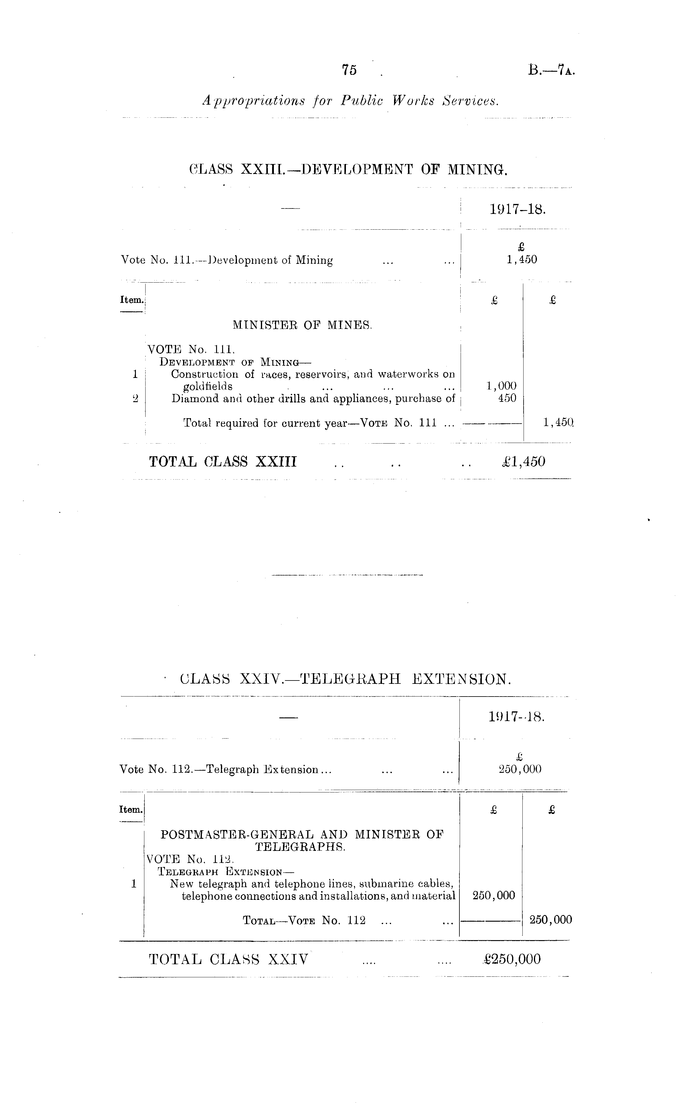 1917-18. Vote No. 111.—Development of Mining £ 1,450 Item. £ £ MINISTEE OF MINES. VOTE No. 111. Development of Mining— 1 Construction of races, reservoirs, and waterworks on goldfields 2 Diamond and other drills and appliances, purchase of ; 1,000 450 Total required for current year —Vote No. Ill ... 1,450 i TOTAL CLASS XXIII £1,450