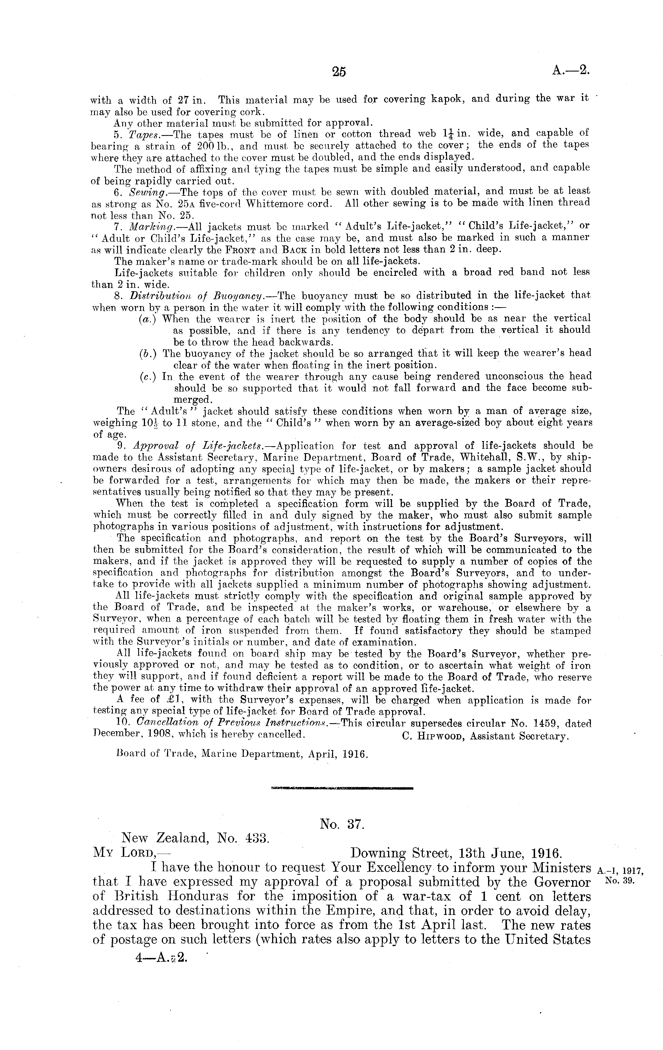 with a width of 27 in. This material may be used for covering kapok, and during the war it may also be used for covering cork. Any other material must be submitted for approval. 5. Tapes. —The tapes must be of linen or cotton thread web l£in. wide, and capable of bearing a strain of 2001b, and must be securely attached to the cover; the ends of the tapes where they are attached to the cover must be doubled, and the ends displayed. The method of affixing and tying the tapes must be simple and easily understood, and capable of being rapidly carried out. 6. Sewing. —The tops of the cover must be sewn with doubled material, and must be at least as strong as No, 25a five-cord Whittemore cord. All other sewing is to be made with linen thread not less than No. 25. 7. Marking. —All jackets must be marked "Adult's Life-jacket," "Child's Life-jacket," or " Adult or Child's Life-jacket," as the case may be, and must also be marked in such a manner as will indicate clearly the Front and Back in. bold letters not less than 2 in. deep. The maker's name or trade-mark should be on all life-jackets. Life-jackets suitable for- children only should be encircled with a broad red band not less than 2 in. wide. 8. Distribution of Buoyancy. —The buoyancy must be so distributed in the life-jacket that when worn by a person, in the water it will comply with the following conditions : — (a.) When the wearer is inert the position of the body should be as near the vertical as possible, and if there is any tendency to depart from the vertical it should be to throw the head backwards. (b.) The buoyancy of the jacket should be so arranged that it will keep the wearer's head clear of the water when floating in the inert position, (c.) In the event of the wearer through any cause being rendered unconscious the head should be so supported that it would not fall forward and. the face become submerged . The "Adult's" jacket should satisfy these conditions when worn by a man of average size, weighing 10 1 to 11 stone, and the " Child's " when worn by an average-sized boy about eight years of age. 9. Approval of Life-jackets. —Application for test and approval of life-jackets should be made to the Assistant Secretary, Marine Department, Board of Trade, Whitehall, S.W, by shipowners desirous of adopting any speciaj type of life-jacket, or by makers; a sample jacket should be forwarded for a test, arrangements for which may then be made, the makers or their representatives usually being notified so that they may be present. When the test is completed a specification form will be supplied by the Board of Trade, which must be correctly filled in. and duly signed by the maker, who must also submit sample photographs in various positions of adjustment, with instructions for adjustment. The specification and photographs, and report on the test by the Board's Surveyors, will then be submitted for the Board's consideration, the result of which will be communicated to the makers, and if the jacket is approved they will be requested to supply a number of copies of the specification and photographs for distribution amongst the Board's Surveyors, and to undertake to provide with all jackets supplied a minimum number of photographs showing adjustment. All life-jackets must strictly comply with the specification and original sample approved by the Board of Trade, and be inspected at the maker's works, or warehouse, or elsewhere by a Surveyor, when a percentage of each batch will be tested by floating them in fresh water with the required amount of iron suspended from them. If found satisfactory they should be stamped with the Surveyor's initials or number, and date of examination. All life-jackets found on board ship may be tested by the Board's Surveyor, whether previously approved or not, and may be tested as to condition, or to ascertain what weight of iron they will support, and if found deficient a report will be made to the Board of Trade, who reserve the power at any time to withdraw their approval, of an approved life-jacket. A fee of £1, with the Surveyor's expenses, will be charged when application is made for testing any special type of life-jacket for Board of Trade approval. 10. Cancellation of Previous Instructions. —This circular supersedes circular No. 1459, dated December, 1908, which is hereby cancelled. C. Hipwood, Assistant Secretary. Board of Trade, Marine Department, April, 1916.
