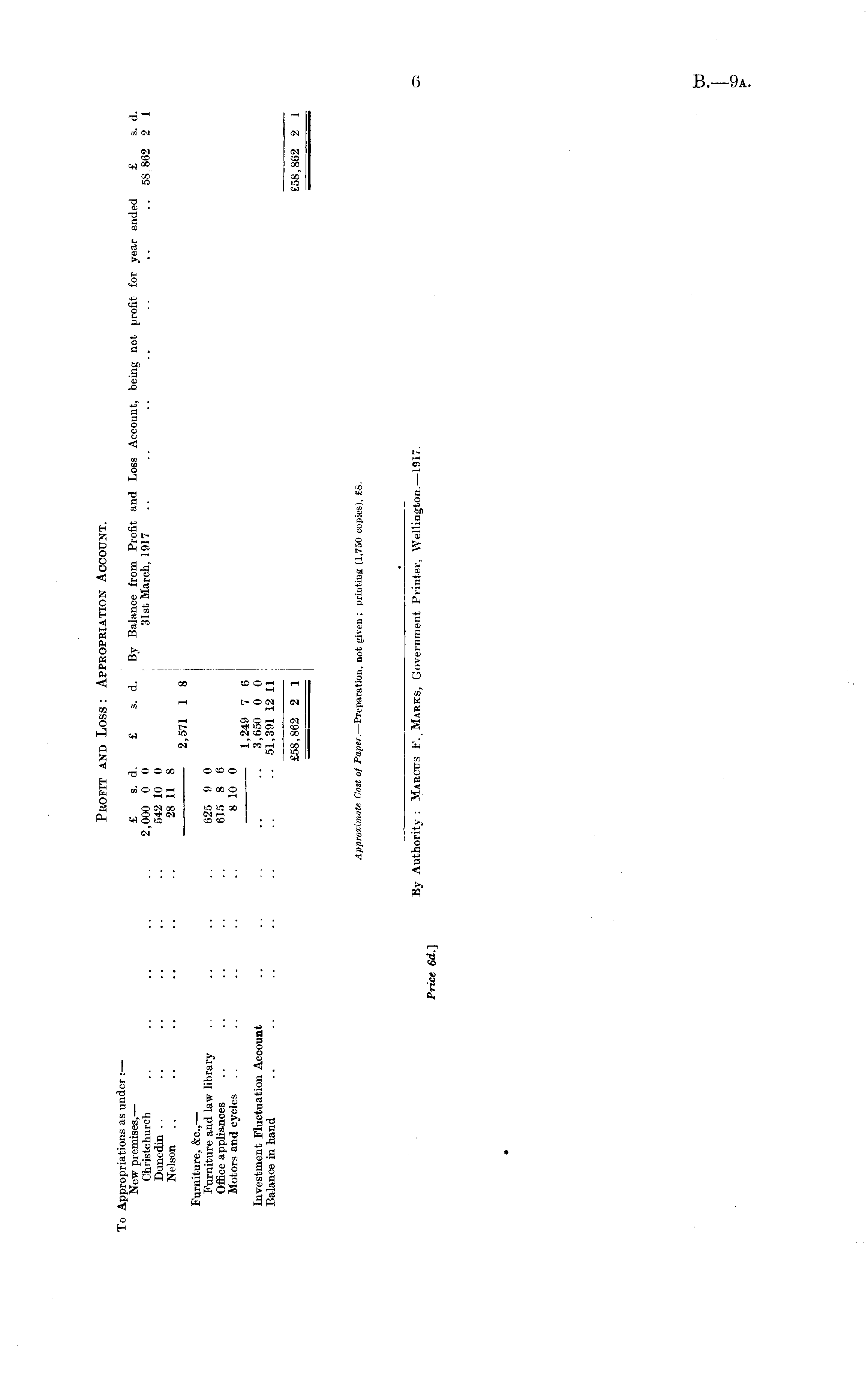 Profit and Loss : Appropriation Account. To Appropriations as under :— New premises,— £ s. d. £ s. d. By Balance from Profit and Loss Account, being net profit for year ended £ s. d. Christchurch .. .. .. .. .. 2,000 0 0 31st March, 1917 .. .. .. .. .. .. .. 58 862 2 1 Dunedin .. .. .. .. .. .. 542 10 0 Nelson .. .. .. .. .. .. 28 11 8 2,571 1 8 Furniture, &c.,— Furniture and law library .. .. .. .. 625 9 0 Office appliances .. .. .. .. .. 615 8 6 Motors and cycles .. .. .. .. .. 810 0 1,249 7 6 Investment Fluctuation Account .. .. .. .. 3,650 0 0 Balance in hand .. .. .. .. .. .. -• 51,39112 11 £58,862 2 1 £58,862 2 1
