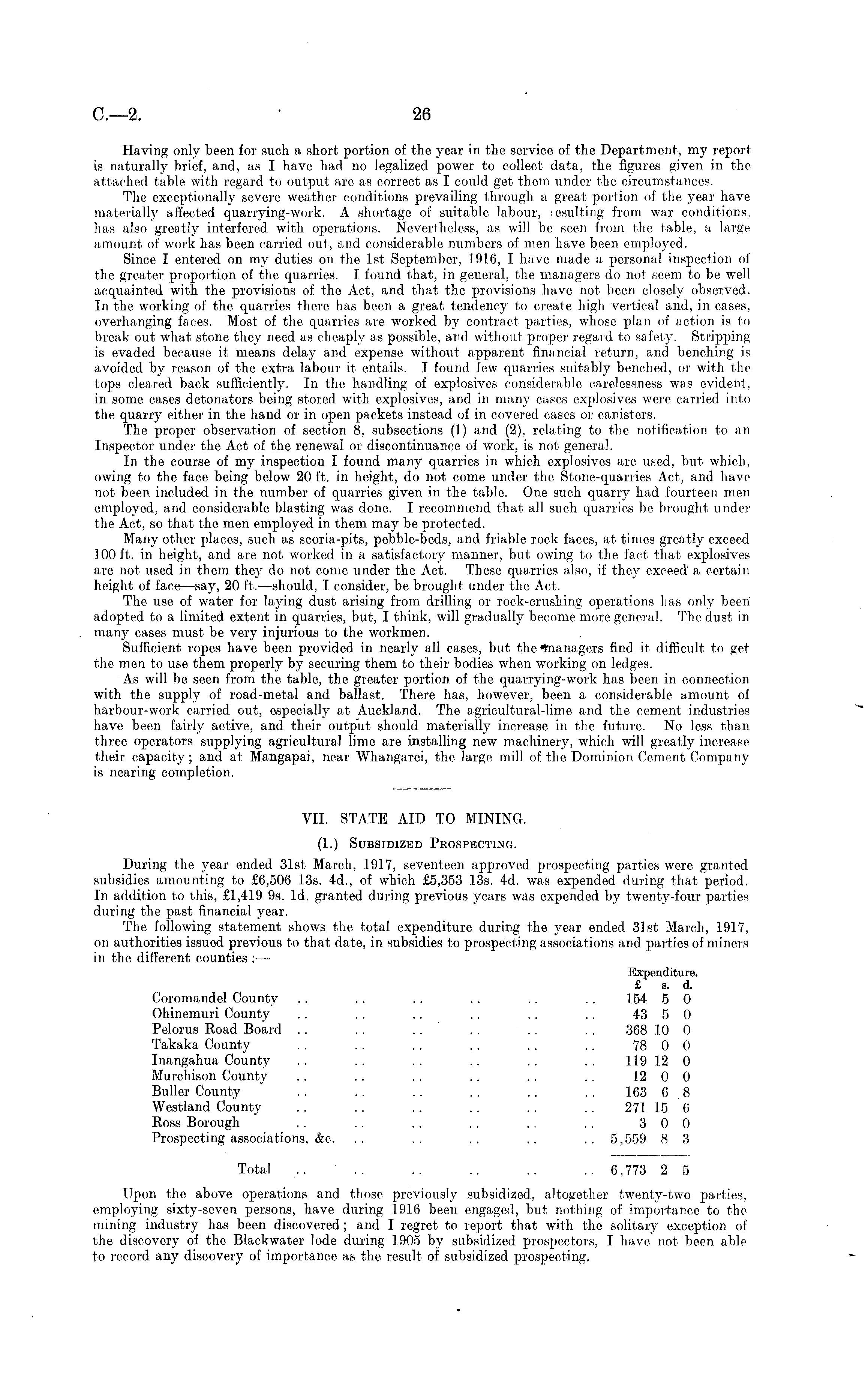 VII. STATE AID TO MINING. (.!.) Subsidized Prospecting. During the year ended 3.lst March, 1917, seventeen approved prospecting parties were granted subsidies amounting to £6,506 13s. 4d., of which £5,353 13s. 4d. was expended during that period. In addition to this, £1,419 9s. Id. granted during previous years was expended by twenty-four parties during the past financial year. The following statement shows the total expenditure during the year ended 31st March, 1.917, on authorities issued previous to that date, in subsidies to prospecting associations and parties of miners in the different counties :— Expenditure. £ s. d. Coromandel County .. .. .. .. .. .. 154 5 0 Ohinemuri County .. . . . . .. . . . . 43 5 0 Pelorus Road Board . . .. . . . . . . . . 368 10 0 Takaka County . . . . . . .. . . .. 78 0 0 Inangahua County .. .. .. .. .. .. 119 12 0 Murchison County . . . . . . . . . . . . 12 0 0 Buller County .. .. .. .. .. .. 163 6 8 Westland County . . . . .. . . . . .. 271 15 6 Ross Borough . . . . .. . . . . . . 3 0 0 Prospecting associations, &c. .. ~ .. .. .. 5,559 8 3 Total .. .. .. .. .. ~ 6,773 2 5 Upon the above operations and those previously subsidized, altogether twenty-two parties, employing sixty-seven persons, have during 1916 been engaged, but nothing of importance to the mining industry has been discovered; and I regret to report that with the solitary exception of the discovery of the Blackwatcr lode during 1905 by subsidized prospectors, I have not been able to record any discovery of importance as the result of subsidized prospecting.