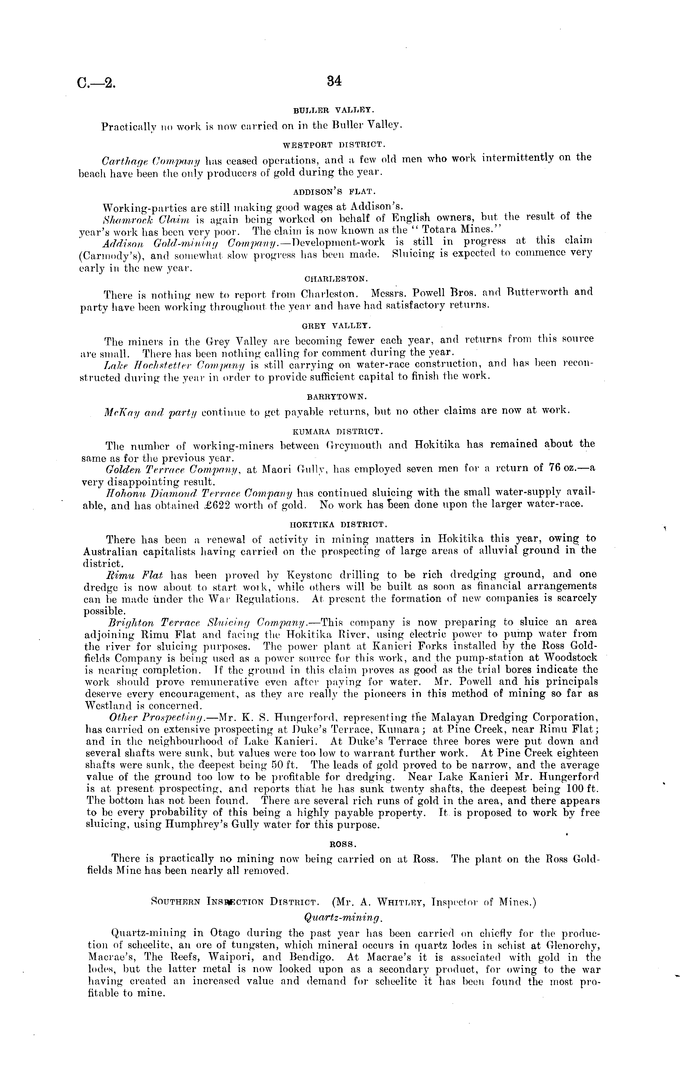 BULLEII VALLEY. Practically no work is now carried on in the Bullcr Valley. WESTPORT DISTRICT. Carthage Company has ceased operations, and a few old men who work intermittently on the beach have been the only producers of gold during the year. addison's flat. Working-parties are still making good wages at Addison's. Shamrock Claim is again being worked on behalf of English owners, brU the result of the year's work has been very poor. The claim is now known as the " Totara Mines." Addison Gold-mininq Company. —Development-work is still in progress at this claim (Carmody's), and somewhat slow progress has been made. Sluicing is expected to commence very early in the new year. CHARLESTON. There is nothing new to report from Charleston. Messrs. Powell Bros, and Buttcrworth and party have been working throughout the year and have bad satisfactory returns. GREY VALLEY. The miners in the Grey Valley are becoming fewer each year, and returns from this source are small. There has been nothing calling for comment during the year. Lake Hochstetter Company is still carrying on water-race construction, and lias been reconstructed during the year in order to provide sufficient capital to finish the work. BARRYTOWN. McKay and party continue to get payable returns, but no other claims are now at work. KUMARA DISTRICT. The number of working-miners between Greymouth and Hokitika has remained about the same as for the previous year. Golden Terrace Company, at Maori Cully, has employed seven men for a return of 76 oz. —a very disappointing result. Ilohonu Diamond Terrace Company has continued sluicing with the small water-supply available, and has obtained £622 worth of gold. No work has been done upon the larger water-race. HOKITIKA DISTRICT. , There has been a renewal of activity in mining matters in Hokitika this year, owing to Australian capitalists having carried on the prospecting of large areas of alluvial ground in the district. Rimu Flat has been proved by Keystone drilling to bo rich dredging ground, and one dredge is now about to start woik, while others will be built as soon as financial arrangements can be made under the War Regulations. At present tlie formation of new companies is scarcely possible. Brighton Terrace Sluicing Company. —This company is now preparing to sluice an area adjoining Rimu Flat and facing the Hokitika River, using electric power to pump water from the river for sluicing purposes. The power plant at Kanieri Forks installed by the Ross Goldfields Company is being used as a power source for this work, and the pump-station at Woodstock is nearing completion. If the ground in this claim proves as good as the trial bores indicate the work should prove remunerative even after paying for water. Mr. Powell and his principals deserve every encouragement, as they are really the pioneers in this method of mining so far as Westland is concerned. Other Prospecting. —Mr. K. S. Hungerford, representing the Malayan Dredging Corporation, has carried on extensive prospecting at Duke's Terrace, Kumara; at Pine Creek, near Rimu Flat; and in the neighbourhood of Lake Kanieri. At Duke's Terrace three bores were put down and several shafts were sunk, but values were too low to warrant further work. At Pine Creek eighteen shafts were sunk, the deepest being 50 ft, The leads of gold proved to be narrow, and the average value of the ground too low to be profitable for dredging. Near Lake Kanieri Mr. Hungerford is at. present prospecting, and reports that he has sunk twenty shafts, the deepest being 100 ft. The bottom has not been found. There are several rich runs of gold in the area, and there appears to bo every probability of this being a highly payable property. It is proposed to work by free sluicing, using Humphrey's Gully water for this purpose. ROSS. There is practically no mining now being carried on at Ross. The plant on the Ross Goldfields Mine has been nearly all removed. Southern Inspection District. (Mr. A. Whitley, Inspector of Mines.) Quartz-mining. Quartz-mining in Otago during the past year has been carried on chiefly for the production of scheelite, an ore of tungsten, which mineral occurs in quartz lodes in schist at Glenorchy, Macrae's, The Reefs, Waipori, and Bendigo. At Macrae's it is associated with gold in the lodes, but the latter metal is now looked upon as a seoondary product, I'm- owing to the war having created an increased value and demand for scheelite it has been found the most profitable to mine.