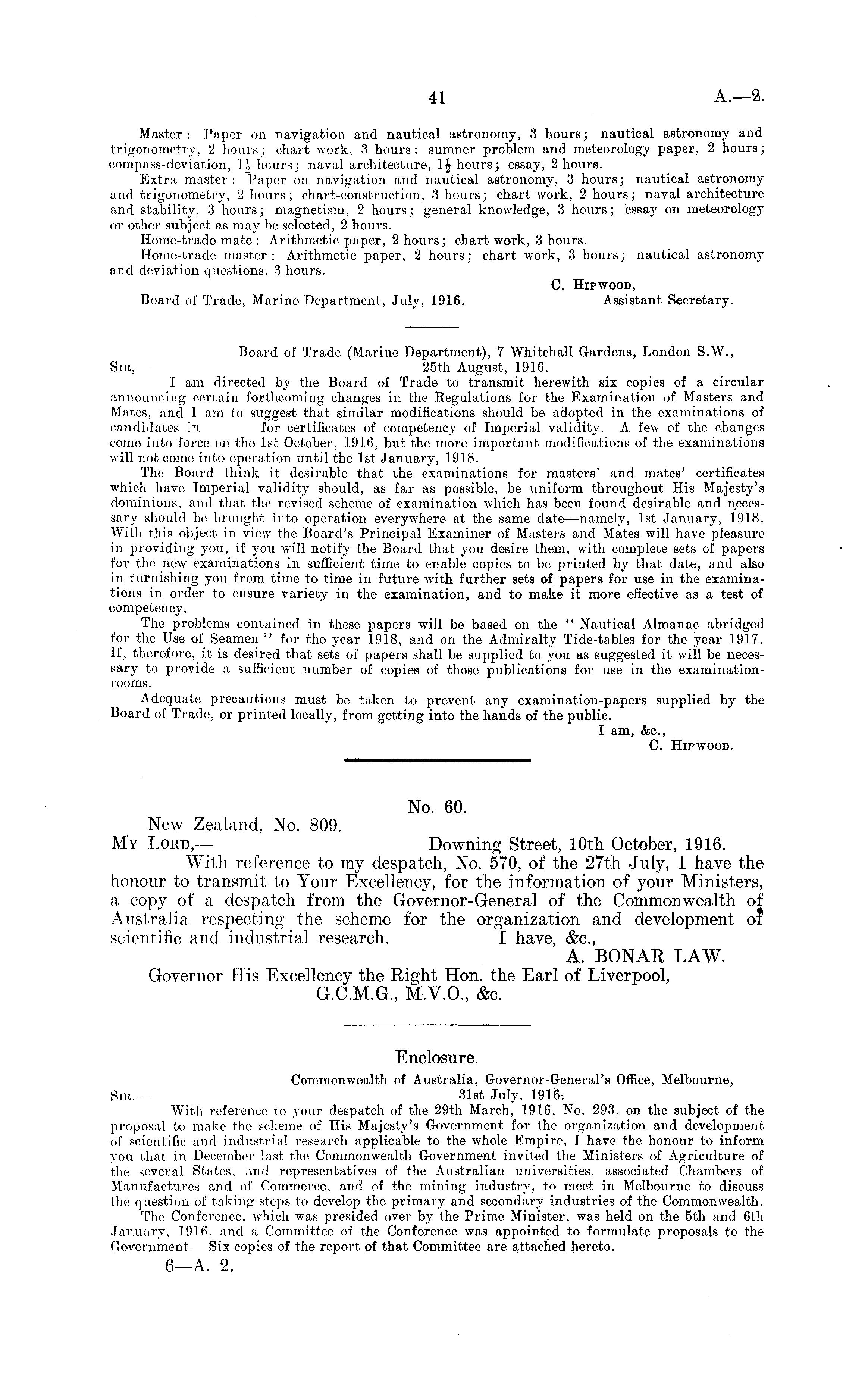 Board of Trade (Marine Department), 7 Whitehall Gardens, London S.W, Sir,— 25th August, 1916. I am directed by the Board of Trade to transmit herewith six copies of a circular announcing certain forthcoming changes in the Regulations for the Examination of Masters and Mates, and I am to suggest that similar modifications should be adopted in the examinations of candidates in for certificates of competency of Imperial validity. A few of the changes come into force on the Ist October, 1916, but the more important modifications of the examinations will not come into operation until the Ist January, 1918. The Board think it desirable that the examinations for masters' and mates' certificates which have Imperial validity should, as far as possible, be uniform throughout His Majesty's dominions, and that the revised scheme of examination which has been found desirable and necessary should be brought into operation everywhere at the same date —namely, Ist January, 1918. With this object in view the Board's Principal Examiner of Masters and Mates will have pleasure in providing you, if you will notify the Board that you desire them, with complete sets of papers for the new examinations in sufficient time to enable copies to be printed by that date, and also in furnishing you from time to time in future with further sets of papers for use in the examinations in order to ensure variety in the examination, and to make it more effective as a test of competency. The problems contained in these papers will be based on the " Nautical Almanac abridged for the Use of Seamen " for the year 1918, and on the Admiralty Tide-tables for the year 1917. If, therefore, it is desired that sets of papers shall be supplied to you as suggested it will be necessary to provide a sufficient number of copies of those publications for use in the examinationrooms. Adequate precautions must be taken to prevent any examination-papers supplied by the Board of Trade, or printed locally, from getting into the hands of the public. I am, &c, C Hipwood.
