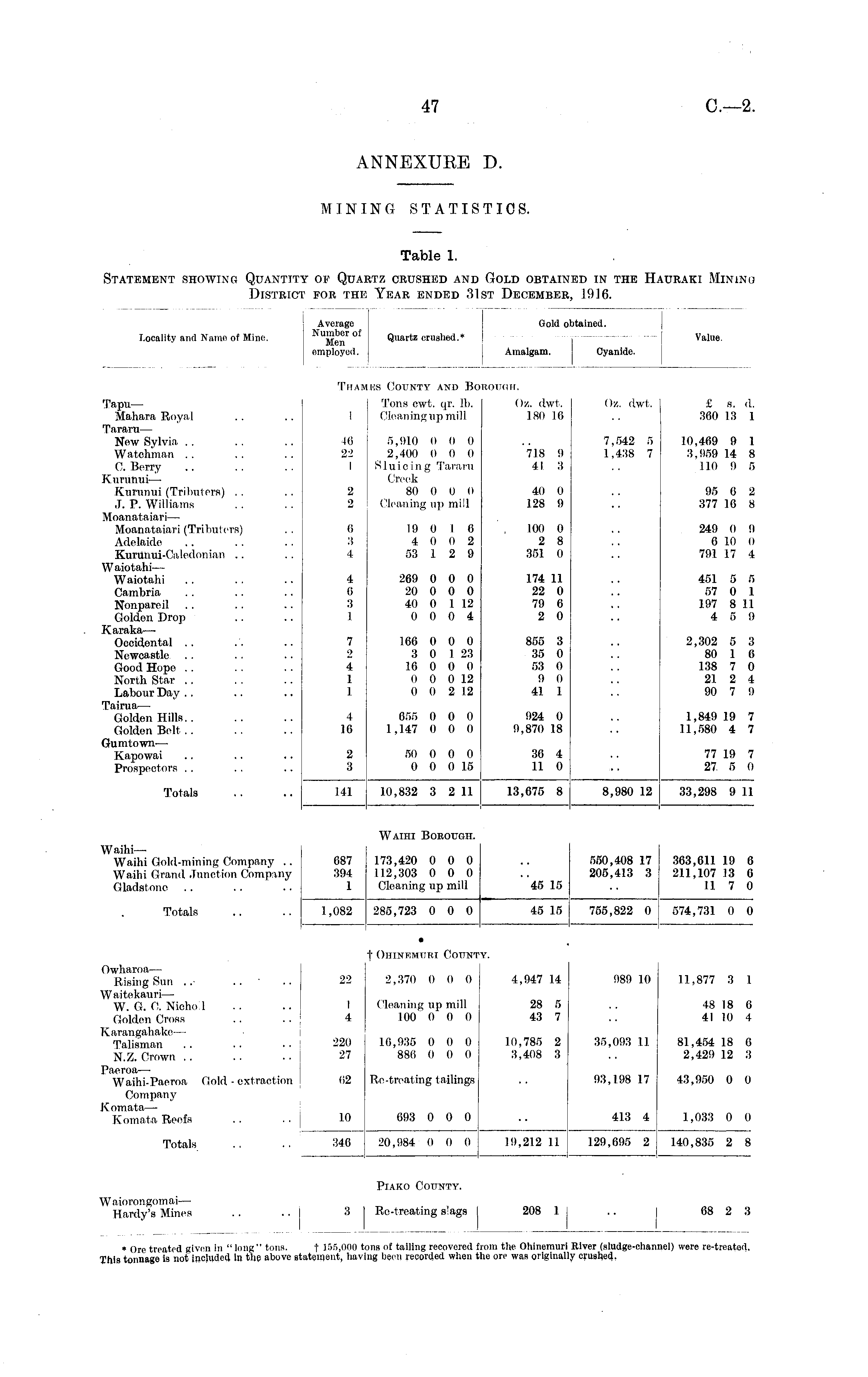Table 1. Statement showing Quantity of Quartz crushed and Gold obtained in the Hauraki Mining District for the Year ended 31st December, 1916.