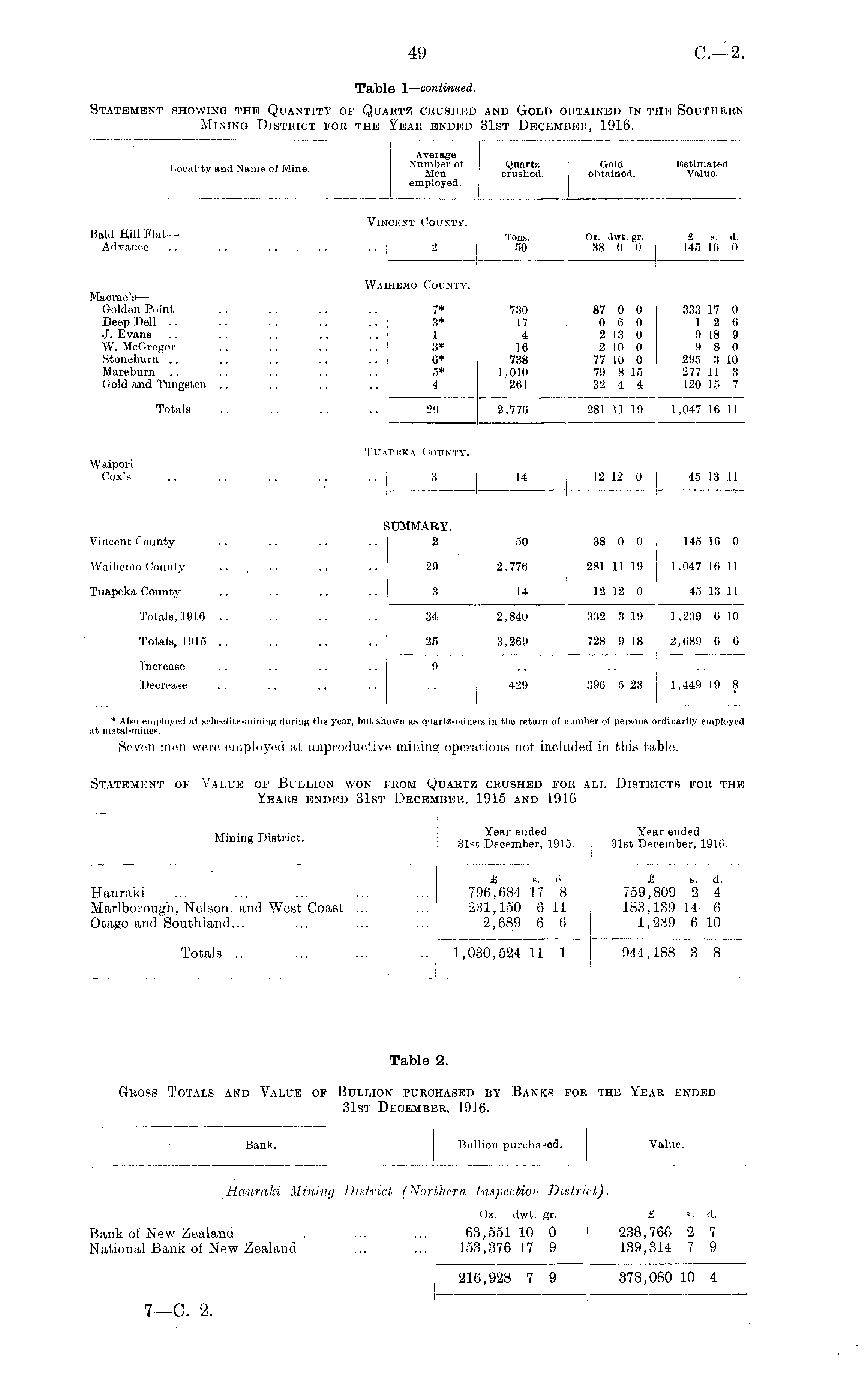 Table 1—continued 1 — continued. Statement showing the Quantity of Quartz crushed and Gold obtained in the Southern Mining District for the Year ended 31st December, 1916.