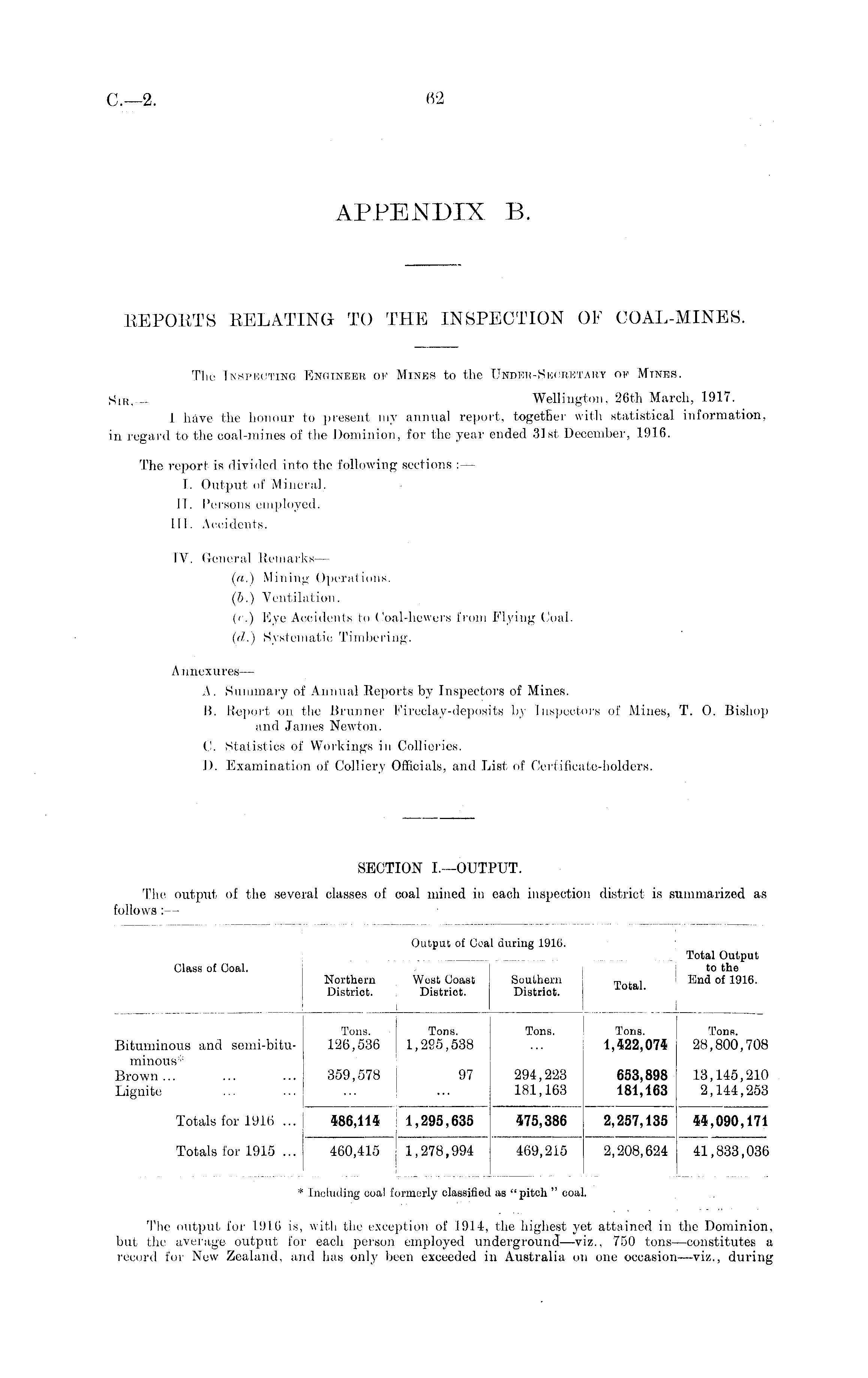 APPENDIX B. BEPOIvTS BELATINO TO THE INSPECTION OF COAL-MINES. Tlie Inspecting Engineer of Mines to the Under-Secretary of Mtnes. g IR _ Wellington, 26th March, 1917. 1 have the honour to present my annual report, together with statistical information, in regard to the coal-mines of the Dominion, for the year ended 31st December, 1916. The report is divided into the following sections : — I. Output of Mineral. • 11. Persons employed. 111. Accidents. IV. General Remarks — (a.) Mining Operations. (b.) Ventilation. (c.) Eye Accidents to Coal-hewers from Flying Coal. (d.) Systematic Timbering. Annexures— A. Summary of Annual Reports by Inspectors of Mines. 15. Report on tlie Brunner Fireclay-deposits by Inspectors of Mines, T. O. Bishop and James Newton. C. Statistics of Workings in Collieries. D. Examination of Colliery Officials, and List of Certificate-holders.