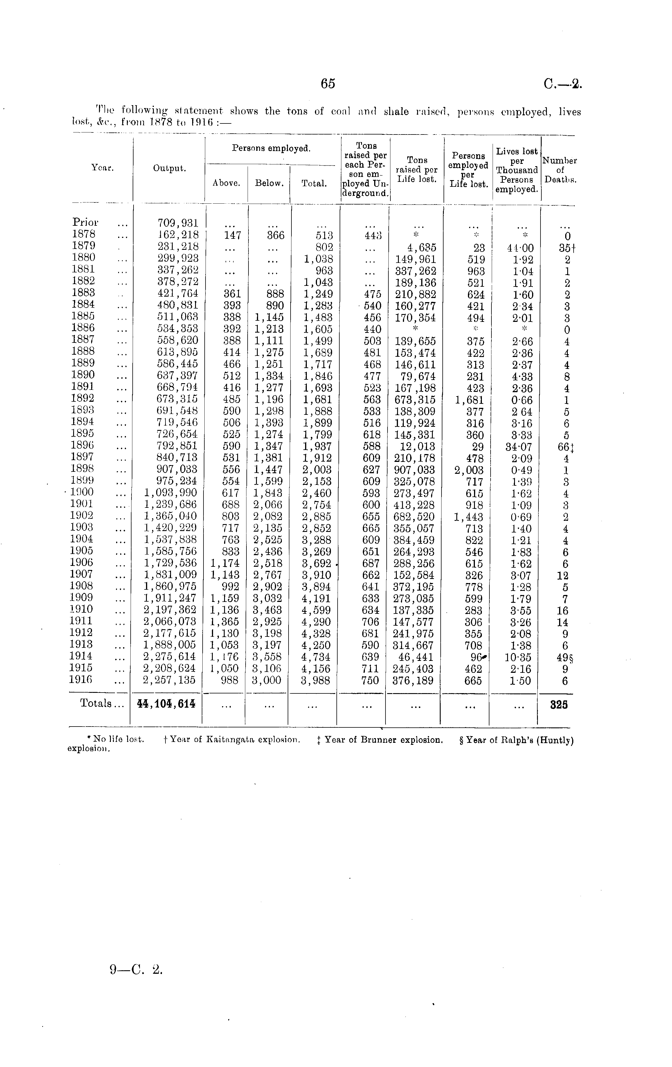 Year. Output. Persons empi iyod. ed. Tons raised per each Person emTotal, ployed Underground. Tons raised por Life lost. Persons omployed per Life lost. Lives lost per Thousand Persons employed. Number of Deaths. Above. Below. Prior 1878 1879 1880 1881 1882 1883 1884 1885 1886 1887 1888 1889 1890 1891 1892 1893 1894 1895 1896 1897 1898 1899 1900 1901 1902 1903 1904 1905 1906 1907 1908 1909 1910 1911 1912 1913 1914 1915 1916 709,931 162,218 231,218 299,923 337,262 378,272 421,764 480,831 511,063 534,353 558,620 613,895 586,445 637,397 668,794 673,315 691,548 719,546 726,654 792,851 840,713 907,033 975,234 1,093,990 1,239,686 1,365,040 1,420,229 1,537,838 1,585,756 1,729,536 1,831,009 1,860,975 1,911,247 2,197,362 2,066,073 2,177,615 1,888,005 2,275,614 2,208,624 2,257,135 147 361 393 338 392 388 414 466 512 416 485 590 506 525 590 531 556 554 617 688 803 717 763 833 1,174 1,143 992 1,159 1,136 1,365 1,130 1,053 1, 176 1,050 988 366 888 890 1,145 1,213 1,111 1,275 1,251 1,334 1,277 1,196 L,298 1,393 1,274 1,347 1,381 1,447 1,599 1,843 2,066 2,082 2,135 2,525 2,436 2,518 2,767 2,902 3,032 3,463 2,925 3,198 3,197 3,558 3,106 3,000 513 443 802 1,038 963 1,043 1.249 475 1,283 540 1,483 456 1,605 440 1,499 503 1,689 481 1,717 468 1,84.6 477 1,693 523 1,681 563 1,888 533 1,899 516 1,799 618 1,937 588 1,912 609 2,003 627 2,153 609 2,460 593 2,754 600 2,885 655 2,852 665 3,288 609 3,269 651 3,692. 687 3,910 662 3,894 641 4,191 633 4,599 634 4,290 706 4,328 681 4.250 590 4,734 639 4,156 711 3,988 750 4,635 149,961 337,262 189,136 210,882 160,277 170,354 * 139,655 153,474 146,611 79,674 167 ,198 673,315 138,309 119,924 145,331 12,013 210,178 907,033 325,078 273,497 413,228 682,520 355,057 384,459 264,293 288,256 152,584 372,195 273,035 137,335 147,577 241,975 314,667 46,441 245,403 376,189 23 519 963 521 624 421 494 375 422 313 231 423 1,681 377 316 360 29 478 2,003 717 615 918 1,443 713 822 546 615 326 778 599 283 306 355 708 96* 462 665 41-00 1-92 1-04 1-91 1-60 234 2-01 2-66 2-36 2-37 4-33 2-36 0-66 2 64 3-16 3-33 34-07 2-09 0-49 1-39 1-62 1-09 0-69 1-40 1-21 1-83 1-62 3-07 1-28 1-79 3-55 3-26 2-08 1-38 10-35 2-16 1-50 0 35 1 2 1 2 2 3 3 0 4 4 4 8 4 1 5 6 5 66 } 4 1 3 4 3 2 4 4 6 6 12 5 7 16 14 9 6 49§ 9 6 Totals... 44,104,614 325 ♦No life 1 ixplosion. rat. t Year o: Kaitangi ,ta explosr m. { Ye; ir of Brun: ier explosion. § Year of Ralph's (Huntly)