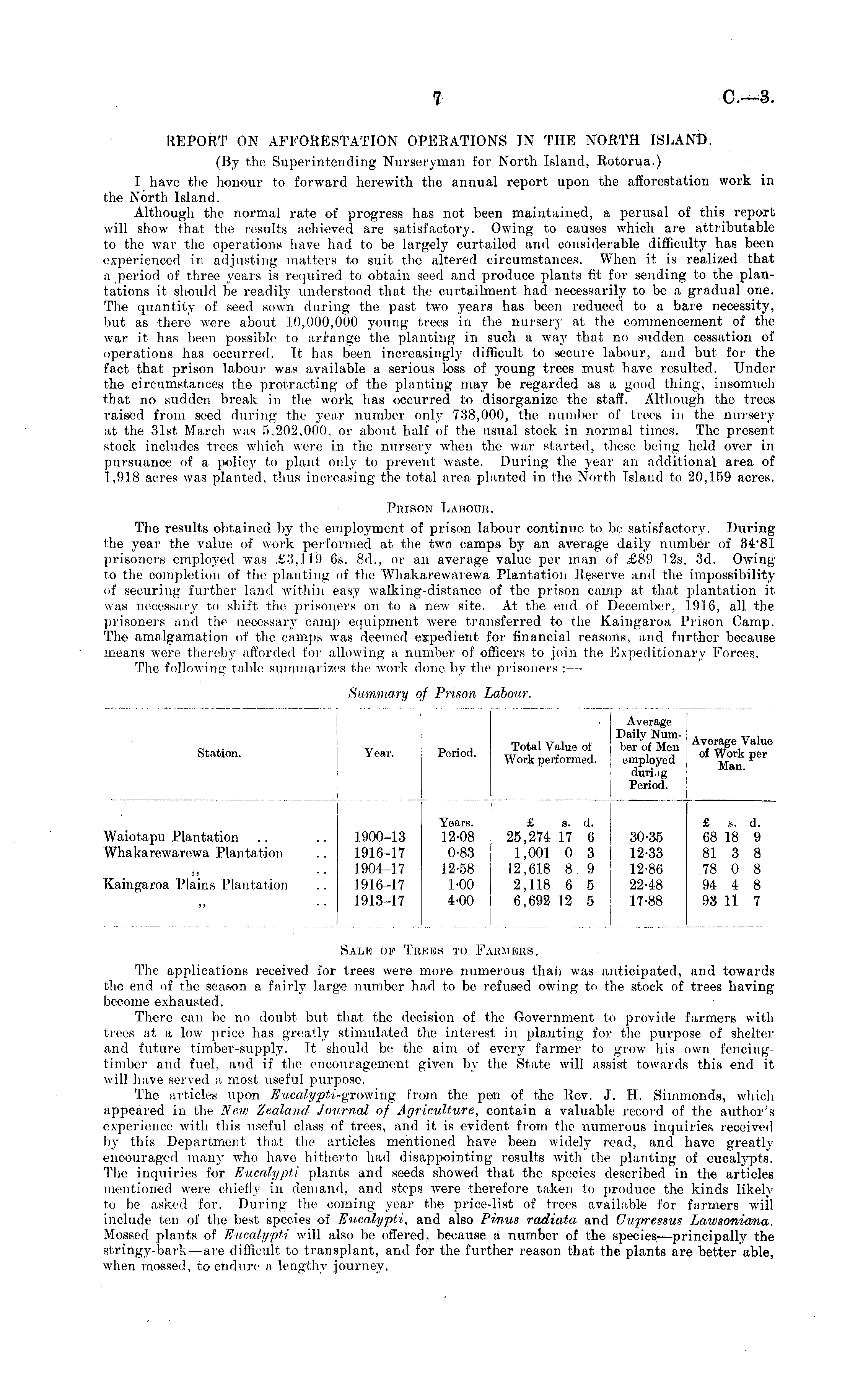 REPORT ON AFFORESTATION OPERATIONS IN THE NORTH ISLAND. (By the Superintending Nurseryman for North Island, Rotorua.) I have the honour to forward herewith the annual report upon the afforestation work in the North Island. Although the normal rate of progress has not been maintained, a perusal of this report will show that the results achieved are satisfactory. Owing to causes which are attributable to the war the operations have had to be largely curtailed and considerable difficulty has been experienced in adjusting matters to suit the altered circumstances. When it is realized that a period of three years is required to obtain seed and produce plants fit for sending to the plantations it should be readily understood that the curtailment had necessarily to be a gradual one. The quantity of seed sown during the past two years has been reduced to a bare necessity, but as there were about 10,000,000 young trees in the nursery at the commencement of the war it has been possible to ari-ange the planting in such a way that no sudden cessation of operations has occurred. It has been increasingly difficult to secure labour, and but for the fact that prison labour was available a serious loss of young trees must have resulted. Under the circumstances the protracting of the planting may be regarded as a good thing, insomuch that no sudden break in the work has occurred to disorganize the staff. Although the trees raised from seed during the year number only 738,000, the number of trees in the nursery at the 31st March was 5,202,000, or about half of the usual stock in normal times. The present stock includes trees which were in the nursery when the war started, these being held over in pursuance of a policy to plant only to prevent waste. During the year an additional area of 1,918 acres was planted, thus increasing the total area planted in the North Island to 20,159 acres. Prison Labour. The results obtained by the employment of prison, labour continue to be satisfactory. During the year the value of work performed at the two camps by an average daily number of 3481 prisoners employed was .£3,119 6s. Bd., or an average value per man of £89 12s. 3d. Owing to the completion of the planting of the Whakarewarewa Plantation Reserve and the impossibility of securing further land within easy walking-distance of the prison camp at that plantation it was necessary to shift the prisoners on to a new site. At the end of December, 1916, all the prisoners and the necessary camp equipment were transferred to the Kaingaroa Prison Camp. The amalgamation of the camps was deemed expedient for financial reasons, and further because means were thereb) - afforded for allowing a number of officers to join the Expeditionary Forces. The following table summarizes the work done by the prisoners : —