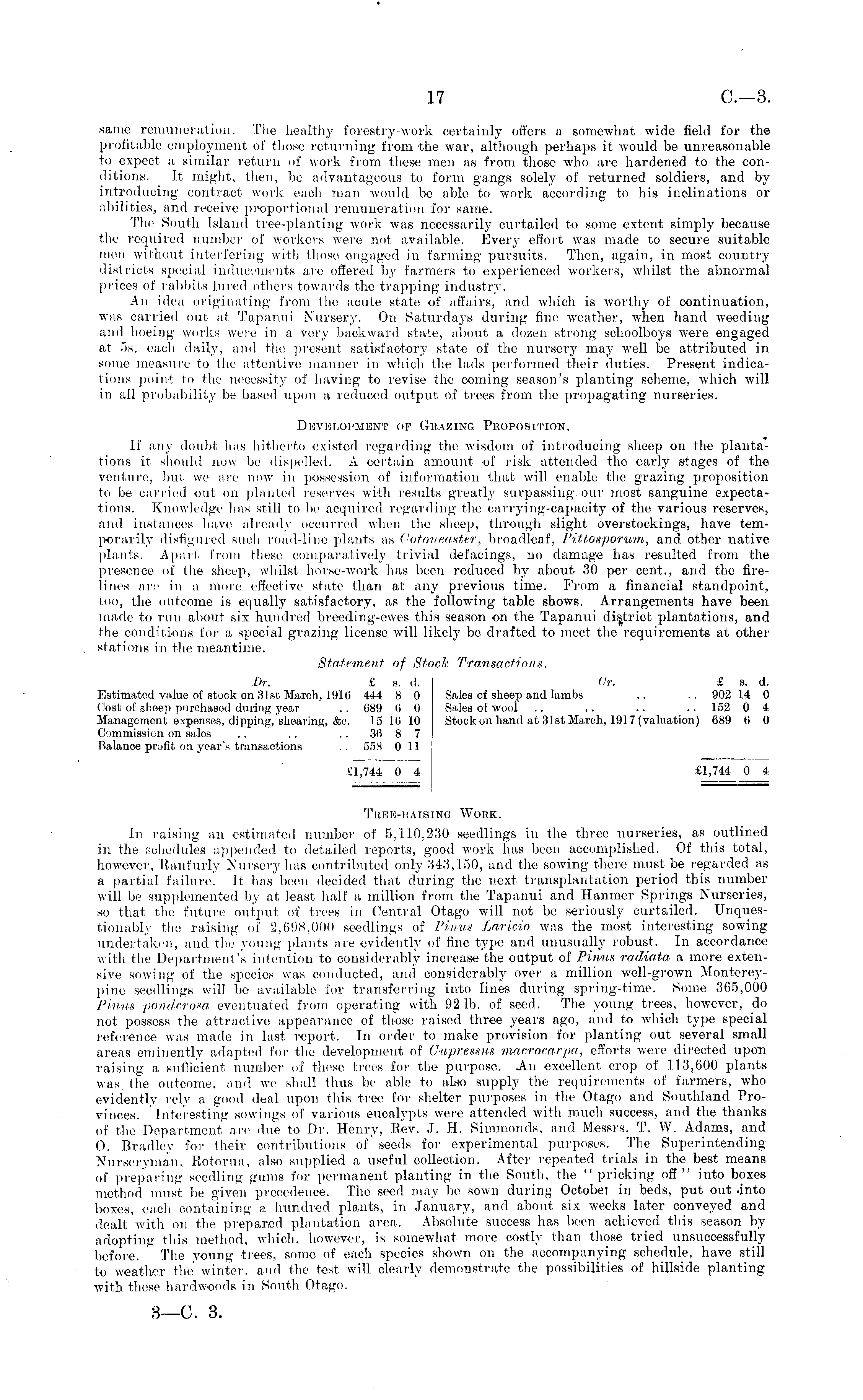 same remuneration. The healthy forestry-work certainly offers a somewhat wide field for the profitable employment of those returning from the war, although perhaps it would be unreasonable to expect ;i similar return of work from these men as from those who are hardened to the conditions. It might, then, be advantageous to form gangs solely of returned soldiers, and by introducing contract work eaeli man would, be able to work according to his inclinations inabilities, and receive proportional remuneration for same. The South Island tree-planting work was necessarily curtailed to some extent simply because the required number of workers were not available. Every effort was made to secure suitable men without: interfering with those engaged in farming pursuits. Then, again, in most country districts special inducements are offered by farmers to experienced workers, whilst the abnormal prices of rabbits lured others towards the trapping industry. An idea originating from the acute state of affairs, and which is worthy of continuation, was carried out at, Tapanui Nursery. On Saturdays during fine weather, when hand weeding and hoeing works were in a very backward state, about a dozen strong schoolboys were engaged at ss. each daily, and the present satisfactory state of the nursery may well be attributed in some measure to the attentive manner in which the lads performed their duties. Present indications point to the necessity of having to revise the coming season's planting scheme, which will in all probability be based upon a reduced output of trees from the propagating nurseries. Development ok Grazing Proposition. If any doubt has hitherto existed regarding the wisdom of introducing sheep on the plantations it should now be dispelled. A certain amount of risk attended the early stages of the venture, but, we are now in possession of information that will enable the grazing proposition to be carried out on planted reserves with results greatly surpassing our most sanguine expectations. Knowledge has still to lie acquired regarding the carrying-capacity of the various reserves, and instances have already occurred when the sheep, through slight overstockings, have temporarily disfigured such road-line plants as <-ototicaster, broadleaf, Pittosporum, and other native plants. Apart from these comparatively trivial defacings, no damage has resulted from the presence of the sheep, whilst horse-work has been reduced by about 30 per cent., and the firelines arc in a more effective state than at any previous time. From a financial standpoint, too, the outcome is equally satisfactory, as the following table shows. Arrangements have been made to run about six hundred breeding-ewes this season on the Tapanui district plantations, and the conditions for a special grazing license will likely be drafted to meet the requirements at other stations in the meantime. Statement of Stock Transactions. Dr. £ s. d. Or, £ s. d. Estimated value of stock on 31st March, 1916 444 8 0 Sales of sheep and lambs .. .. 902 14 0 (!ost of sheep purchased during year . . 689 (i 0 Sales of wool .. . . .. .. 152 0 4 Management expenses, dipping, shearing, &c. 15 16 10 Stock on hand at 31st March, 1917 (valuation) 689 6 0 Commission on sales .. .. .. 36 8 7 Balance profit on year's transactions .. 558 011 £1,744 0 4 £1,744 0 4 Tree-raising Work. In raising an estimated number of 5,110,230 seedlings in the three nurseries, as outlined in the schedules appended to detailed reports, good work has been accomplished. Of this total, however, Ranfurly Nursery has contributed only 343,150, and the sowing there must be regarded as a partial failure. It lias been decided that during the next transplantation period this number will be supplemented by at least half a million from the Tapanui and Hanmer Springs Nurseries, so that the future output of trees in Central Otago will not be seriously curtailed. Unquestionably the raising ol' 2,698,000 seedlings of Pinus Laricio was the most interesting sowing undertaken, and. tin- young plants are evidently of fine type and unusually robust. In accordance with the Department's intention to considerably increase the output of Pinus radiata a more extensive sowing of the species was conducted, and considerably over a million well-grown Montereypine seedlings will be available for transferring into lines during spring-time. Some 365,000 Pinus ponderosa eventuated from operating with 92 Ib. of seed. The young trees, however, do not possess the attractive appearance of those raised three years ago, and to which type special reference was made in last report. In order to make provision for planting out several small areas eminently adapted for the development of Cupressus macrocarpa, efforts were directed upon raising a sufficient number of these trees for the purpose. An excellent crop of 113,600 plants was the outcome, and we shall thus be able to also supply the requirements of farmers, who evidently rely a good deal upon this tree for shelter purposes in the Otago and Southland Provinces. Interesting sowings of various eucalypts were attended with much success, and the thanks of the Department are due to Dr. Henry, Rev. J. H. Simmonds, and Messrs. T. W. Adams, and O. Bradley for their contributions of seeds for experimental purposes. The Superintending Nurseryman, Rotorua, also supplied a useful collection. After repeated trials in the best means of preparing seedling gums for permanent planting in the South, the "pricking off" into boxes method must be given precedence. The seed may be sown during Octobei in beds, put out -into boxes, each containing a, hundred plants, in January, and about six weeks later conveyed and dealt with on the prepared plantation area. Absolute success has been achieved this season by adopting this method, which, however, is somewhat more costly than those tried unsuccessfully before. The young trees, some of each species shown on the accompanying schedule, have sti