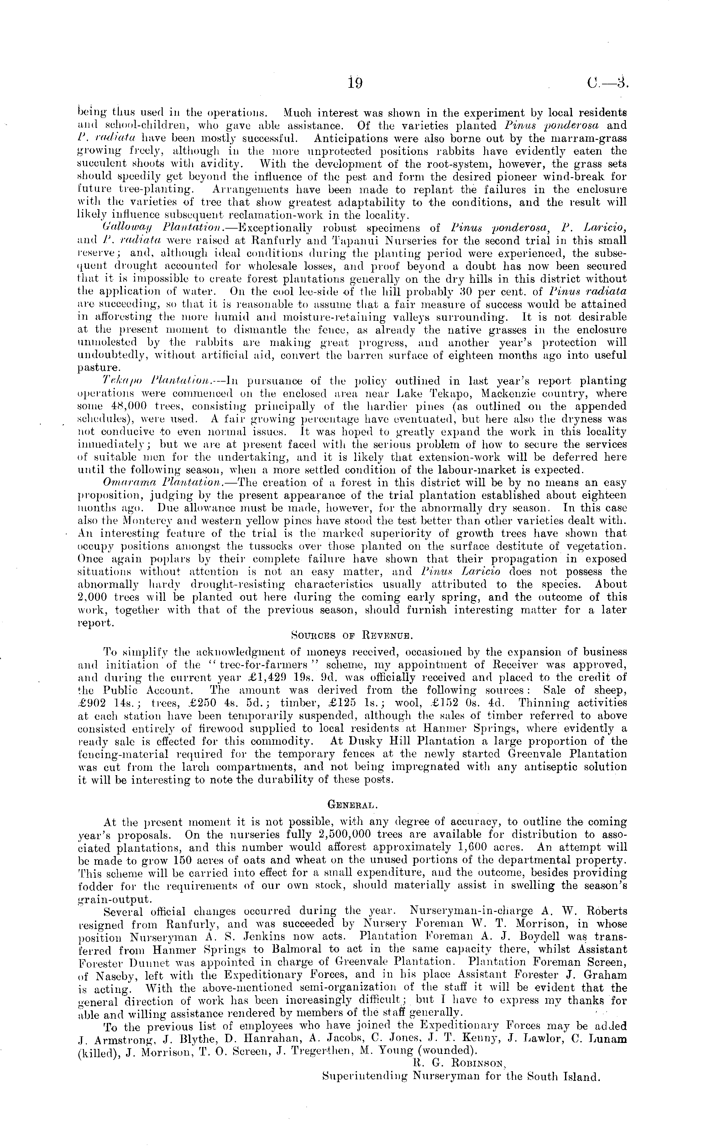 being thus used in the operations. Muoh interest was shown in the experiment by local residents and school-children, who gave able assistance. Of the varieties planted Pinus ponderosa and /'. radiata have been mostly successful. Anticipations were also borne out by the marram-grass growing freely, although in the more unprotected positions rabbits have evidently eaten the succulent shoots with avidity. With the development of the root-system, however, the grass sets should speedily get beyond the influence of the pest and form the desired pioneer wind-break for future tree-planting. Arrangements have been made to replant the failures in the enclosure with the varieties of tree that show greatest adaptability to the conditions, and the result will likely influence subsequent reclamation-work in the locality. Calloway Plantation. —Exceptionally robust specimens of Pinus ponderosa, P. Laricio, and /'. radiata were raised at Ranfurly and Tapanui Nurseries for the second trial in this small reserve; and, although ideal conditions during the planting period were experienced, the subsequent drought accounted for wholesale losses, and proof beyond a doubt has now been secured that it is impossible to create forest plantations generally on the dry hills in this district without the application of water. On the cool lee-side of the hill probably 30 per cent, of Pinus radiata. are succeeding, so that it is reasonable to assume that a fair measure of success would be attained in afforesting the more humid and moisture-retaining valleys surrounding. It is not desirable at the present moment to dismantle the fence, as already the native grasses in the enclosure unmolested by the rabbits are making great progress, and another year's protection will undoubtedly, without artificial aid, convert the barren surface of eighteen months ago into useful pasture. Tekapo Plantation. —ln pursuance of the policy outlined in last year's report plantingoperations were commenced on the enclosed area, near Lake Tekapo, Mackenzie country, where some 48,000 trees, consisting principally of the hardier pines (as outlined on the appended schedules), were used. A fair growing percentage have eventuated, but here also the dryness was not conducive to even normal issues. It was hoped to greatly expand the work in this locality immediately; but we are at present faced with the serious problem of how to secure the services of suitable men for the undertaking, and it is likely that extension-work will be deferred here until the following season, when a more settled condition of the labour-market is expected. Omarama Plantation. —The creation of a forest in this district will be by no means an easy proposition, judging by the present appearance of the trial plantation established about eighteen months ago. Due allowance must be made, however, for the abnormally dry season. In this case also the Monterey and western yellow pines have stood the test better than other varieties dealt with. An interesting feature of the trial is the marked superiority of growth trees have shown that occupy positions amongst the tussocks over those planted on the surface destitute of vegetation. Once again poplars by their complete failure have shown that their propagation in exposed situations without attention is not an easy matter, and Pinus Laricio does not possess the abnormally hardy drought-resisting characteristics usually attributed to the species. About 2,000 trees will be planted out here during the coming early spring, and the outcome of this work, together with that of the previous season, should furnish interesting matter for a later report. Sources of Revenue. 'lii simplify the acknowledgment of moneys received, occasioned by the expansion of business and initiation of the " tree-tor-farmers " scheme, my appointment of Receiver was approved, and during the current year £1,4-29 19s. 9d. was officially received and placed to the credit of 'Aid Public Account. The amount was derived from the following sources : Sale of sheep, £902 145.; trees, £250 4s. 5d.; timber, £125 Is.; wool, £152 os. 4d. Thinning activities at, each station have been temporarily suspended, although the sales of timber referred to above consisted entirely of firewood supplied to local residents at Hanmer Springs, where evidently a ready sale is effected for this commodity. At Dusky Hill Plantation a large proportion of the fencing-material required for the temporary fences at the newly started Greenvale Plantation was cut from the larch compartments, and not being impregnated with any antiseptic solution it will be interesting to note the durability of these posts. General. At the present moment it is not possible, with any degree of accuracy, to outline the coming year's proposals. On the nurseries fully 2,500,000 trees are available for distribution to associated plantations, and this number would afforest approximately 1,600 acres. An attempt will be made to grow 150 acres of oats and wheat on the unused portions of the departmental property. This scheme will be carried into effect for a small expenditure, and the outcome, besides providing fodder for the requirements of our own stock, should materially assist in swelling the season's grain-output. Several official changes occurred during the year. Nurseryman-in-oharge A. W. Roberts resigned from Ranfurly, and was succeeded by Nursery Foreman W. T. Morrison, in whose position Nurseryman A. S. Jenkins now acts. Plantation Foreman A. J. Boydcll was transferred from Hanmer Springs to Balmoral to act in the same capacity there, whilst Assistant Forester Dunnet was appointed in charge of Greenvale Plantation. Plantation Foreman Screen, of Naseby, left with the Expeditionary Forces, and in his place Assistant Forester J. Graham is acting. With the above-mentioned semi-organization of the staff it will be evident that the general direction of work has been increasingly difficult; but I have to express my thank