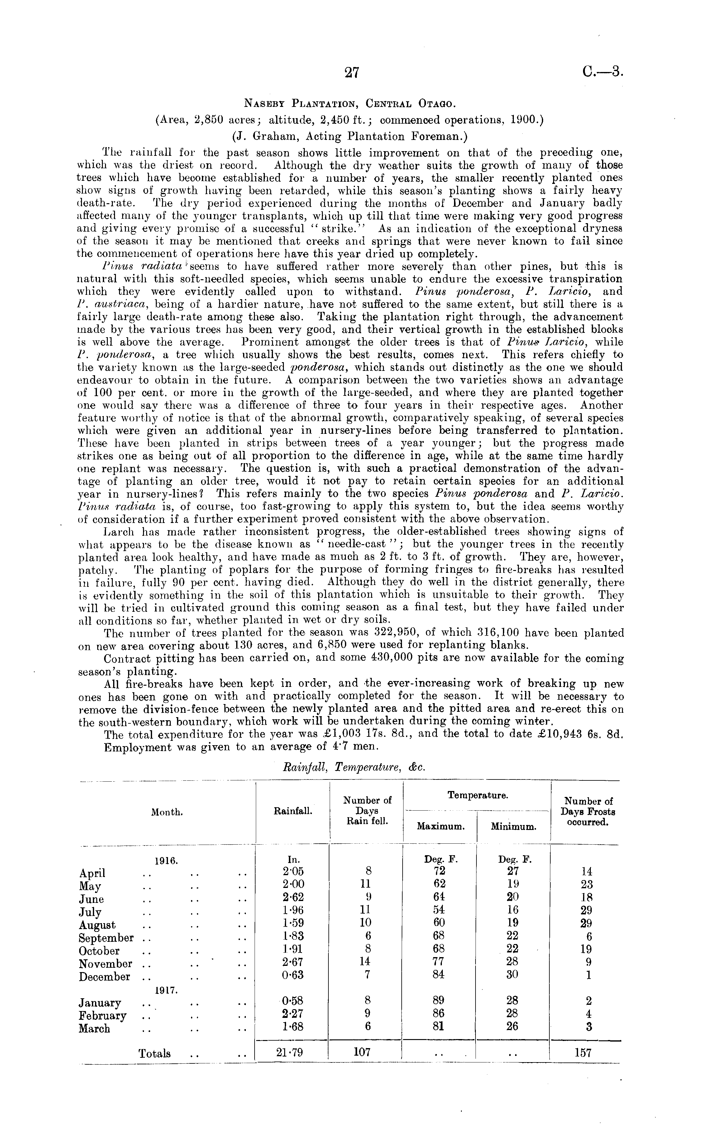 Naseby Plantation, Central Otago. (Area, 2,850 acres; altitude, 2,450 ft.; commenced operations, 1900.) (J. Graham, Acting Plantation Foreman.) The rainfall for the past season shows little improvement on that of the preceding one, which was the driest on record. Although the dry weather suits the growth of many of those trees which have become established for a number of years, the smaller recently planted ones show signs of growth having been retarded, while this season's planting shows a fairly heavy death-rate. The dry period experienced during the months of December and January badly affected many of the younger transplants, which up till that time were making very good progress and giving every promise of a successful "strike." As an indication of the exceptional dryness of the season it may be mentioned that creeks and springs that were never known to fail since the commencement of operations here have this year dried up completely. Pinus radiata' seems to have suffered rather more severely than other pines, but this is natural with this soft-needled species, which seems unable to endure the excessive transpiration which they were evidently called upon to withstand. Pinus ponderosa, P. Laricio, and P. austriaca, being of a hardier nature, have not suffered to the same extent, but still there is a fairly large death-rate among these also. Taking the plantation right through, the advancement made by the various trees has been very good, and their vertical growth in the established blocks is well above the average. Prominent amongst the older trees is that of Pinus l Laricio, while P. ponderosa, a tree which usually shows the best results, comes next. This refers chiefly to the variety known as the large-seeded ponderosa, which stands out distinctly as the one we should endeavour to obtain in the future. A comparison between the two varieties shows an advantage of 100 per cent, or more in the growth of the large-seeded, and where they are planted together one would say there was a difference of three to four years in their respective ages. Another feature worthy of notice is that of the abnormal growth, comparatively speaking, of several species which were given an additional year in nursery-lines before being transferred to plantation. These have been planted in strips between trees of a year younger; but the progress made strikes one as being out of all proportion to the difference in age, while at the same time hardly one replant was necessary. The question is, with such a practical demonstration of the advantage of planting an. older tree, would it not pay to retain certain species for an additional year in nursery-lines? This refers mainly to the two species Pinus ponderosa and P. Laricio. Pinus radiata is, of course, too fast-growing to apply this system to, but the idea seems worthy of consideration if a further experiment proved consistent with the above observation. Larch has made rather inconsistent progress, the older-established trees showing signs of what appears to be the disease known as " needle-cast"; but the younger trees in the recently planted area look healthy, and have made as much as 2 ft. to 3 ft. of growth. They are, however, patchy. The planting of poplars for the purpose of forming fringes to fire-breaks has resulted in failure, fully 90 per cent, having died. Although they do well in the district generally, there is evidently something in the soil of this plantation which is unsuitable to their growth. They will be tried in cultivated ground this coming season as a final test, but they have failed under all conditions so far, whether planted in wet or dry soils. The number of trees planted for the season was 322,950, of which 316,100 have been planted on new area covering about 130 acres, and 6,850 were used for replanting blanks. Contract pitting has been carried on, and some 430,000 pits are now available for the coming season's planting. All fire-breaks have been kept in order, and the ever-increasing work of breaking up new ones has been gone on with and practically completed for the season. It will be necessary to remove the division-fence between the newly planted area and the pitted area and re-erect this on the south-western boundary, which work will be undertaken during the coming winter. The total expenditure for the year was £1,003 17s. Bd., and the total to date £10,943 6s. Bd. Employment was given to an average of 4"7 men.