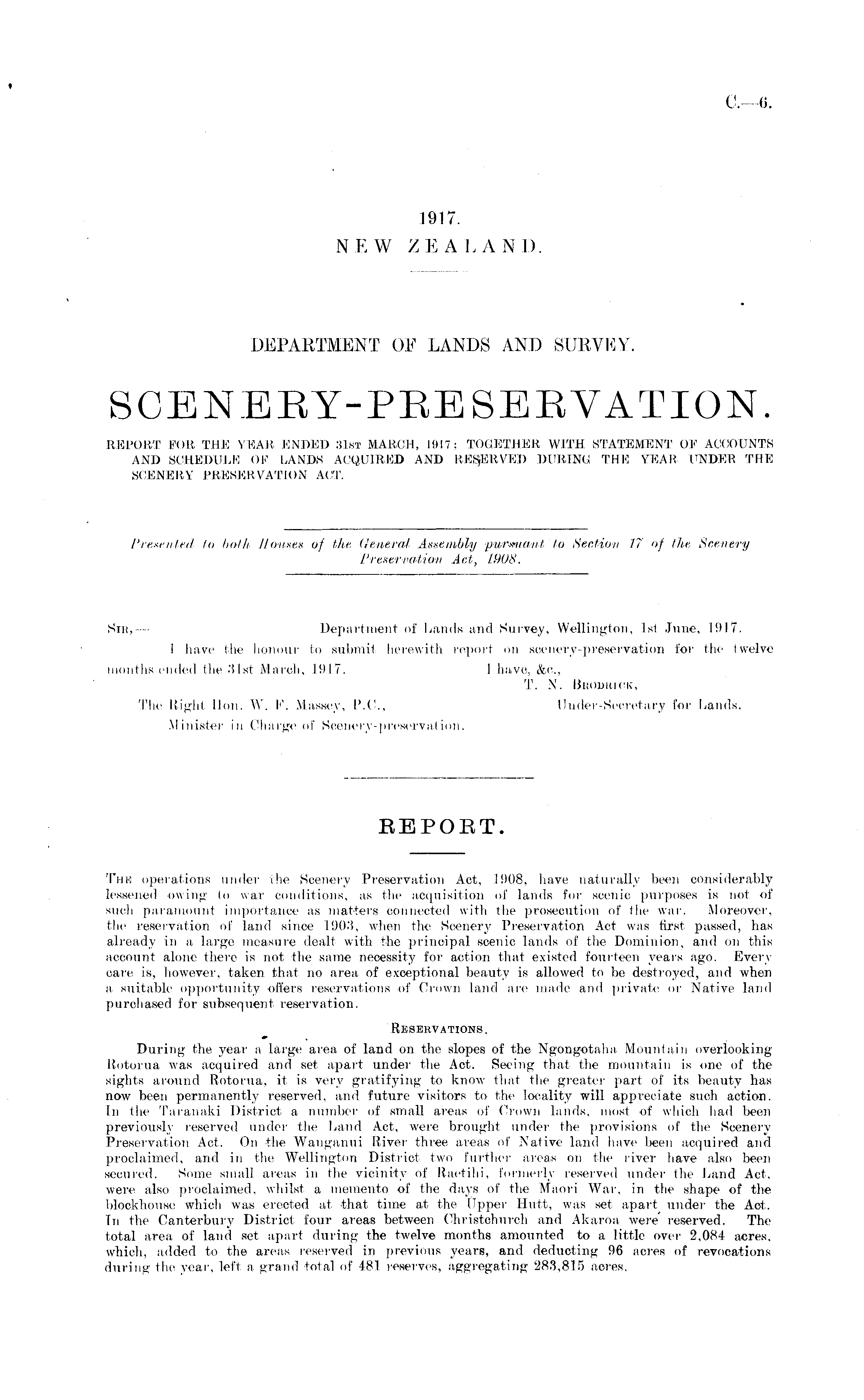 DEPARTMENT OF LANDS AND SURVEY. SCENERY-PRESERVATION. REPORT FOR THE YEAR ENDED 31st MARCH, 1917. TOGETHER WITH STATEMENT OF ACCOUNTS AND SCHEDULE OF LANDS ACQUIRED AND RESERVED DURING THE YEAR UNDER THE SCENERY PRESERVATION ACT.