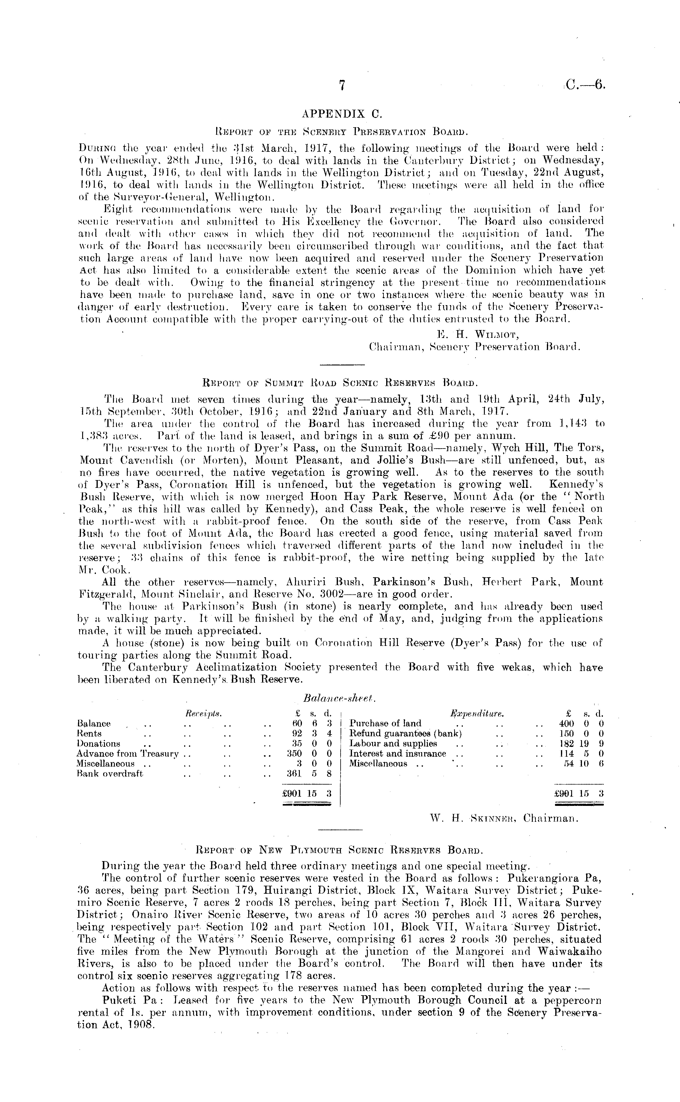 APPENDIX C. Report of the Scenery Preservation Board. During; the year ended the 31st March, 191.7, the following meetings of the Board were held: On Wednesday. 28th June, 1916, to deal with lands in the Canterbury District; on Wednesday, 16th August, 1916, to deal with lands in the Wellington District; and on Tuesday, 22nd August, 1916, to deal with lands in the Wellington District. These meetings were all field in the office of the Surveyor-General, Wellington. Eight recommendations were made by the Board regarding the acquisition of land for scenic reservation and submitted to His Excellency the Governor. The Hoard also considered and dealt with other eases in which they did not recommend the acquisition of land. The work of the Hoard has necessarily been circumscribed through war conditions, and the fact that such large areas of land have now been acquired and reserved under the Scenery Preservation Act has also limited to a considerable extent the scenic areas of the Dominion which have yet to be dealt with. Owing to the financial stringency at the present time no recommendations have been made to purchase land, save in one or two instances where the scenic beauty was in danger of early destruction. Every care is taken to conserve the funds of the Scenery Preservation Account compatible with the proper carrying-out of the duties entrusted to the Board. E. H. Wn.siOT, Chairman, Scenery Preservation Hoard. Report of Summit Road Scenic Reserves Board. The Board met seven times during the year —namely, 13th and 19th April, 24th July, 15th September, 30th October, 1916; and 22nd January and Bth March, 1917. 'fhe area under the control of the Board has increased during the year from 1,143 to 1,383 acres. Part of the land is leased, and brings in a sum of £90 per annum. The reserves to the north of Dyer's Pass, on the Summit Road—namely, Wych Hill, The Tors, Mount Cavendish (or Morten), Mount Pleasant, and Jollies Bush—are still unfenced, but, as no fires have occurred, the native vegetation is growing well. As to the reserves to the south of" Dyer's Pass, Coronation Hill is unfenced, but the vegetation is growing well. Kennedy's Bush Reserve, with which is now merged Hoon Hay Park Reserve, Mount Ada (or the " North Peak," as this hill was called by Kennedy), and Cass Peak, the whole reserve is well fenced on the north-west with a rabbit-proof fence. On the south side of the reserve, from Cass Peak Hush to the foot of Mount Ada, the Board has erected a good fence, using material saved from the several subdivision fences which traversed different parts of the land now included in the reserve; 33 chains of this fence is rabbit-proof, the wire netting being supplied by the late Mr. Cook. All the other reserves —namely, Almriri Bush, Parkinson's Bush, Herbert Park, Mount Fitzgerald, Mount Sinclair, and Reserve No. 3002 —are in good order. The house at Parkinson's Bush (in stone) is nearly complete, and has already been used by a walking party. It will be finished by the end of May, and, judging from the applications made, it will be much appreciated. A house (stone) is now being built on Coronation Hill Reserve (Dyer's Pass) for the use of touring parties along the Summit Road. The Canterbury Acclimatization Society presented the Board with five wekas, which have been liberated on Kennedy's. Bush Reserve. Bala/nce-sheet. Receipts. C s. d. i Expenditure. £ s. d. Balance ... .. .. .. 60 (i :i I Purchaso of land .. .. .. 400 0 0 Rents .. .. .. .. 92 8 4 Refund guarantees (bank) .. .. 150 0 0 Donations .. .. .. .. 35 0 0 Labour and supplies .. .. .. 182 10 9 Advance from Treasury .. .. .. 350 0 0 Interest and insurance .. .. .. 114 5 0 Miscellaneous .. .. .. .. 3 0 0 Miscellaneous .. '.. .. .. 54 10 6 Bank overdraft .. .. .. 361 5 8 £901 15 3 £901 15 3 W. H. Skinner, Chairman. Report of New Plymouth Scenic Reserves Board. During the year the Board held three ordinary meetings and one special meeting. The control of further scenic reserves were vested in the Board as follows : Pukerangiora Pa, 36 acres, being part Section 179, Huirangi District, Block IX, Waitara Survey District; Pukemiro Scenic Reserve, 7 acres 2 roods 18 perches, being part Section 7, Block 111, Waitara Survey District; Onairo River Scenic Reserve, two areas of 10 acres 30 perches and 3 acres 26 perches, being respectively part Section 102 and part Section 101, Block VII, Waitara Survey District. The " Meeting of the Waters " Scenic Reserve, comprising 61 acres 2 roods 30 perches, situated five miles from the New Plymouth Borough at the junction of the Mangorei and Waiwakaiho Rivers, is also to be placed under the Board's control. The Hoard will then have under its control six scenic reserves aggregating 178 acres. Action as follows with respect, to the reserves named has been completed during the year : — Puketi Pa : Leased for five years to the New Plymouth Borough Council at a peppercorn rental of Is. per annum, with improvement conditions, under section 9 of the Scenery Preservation Act, 1908.