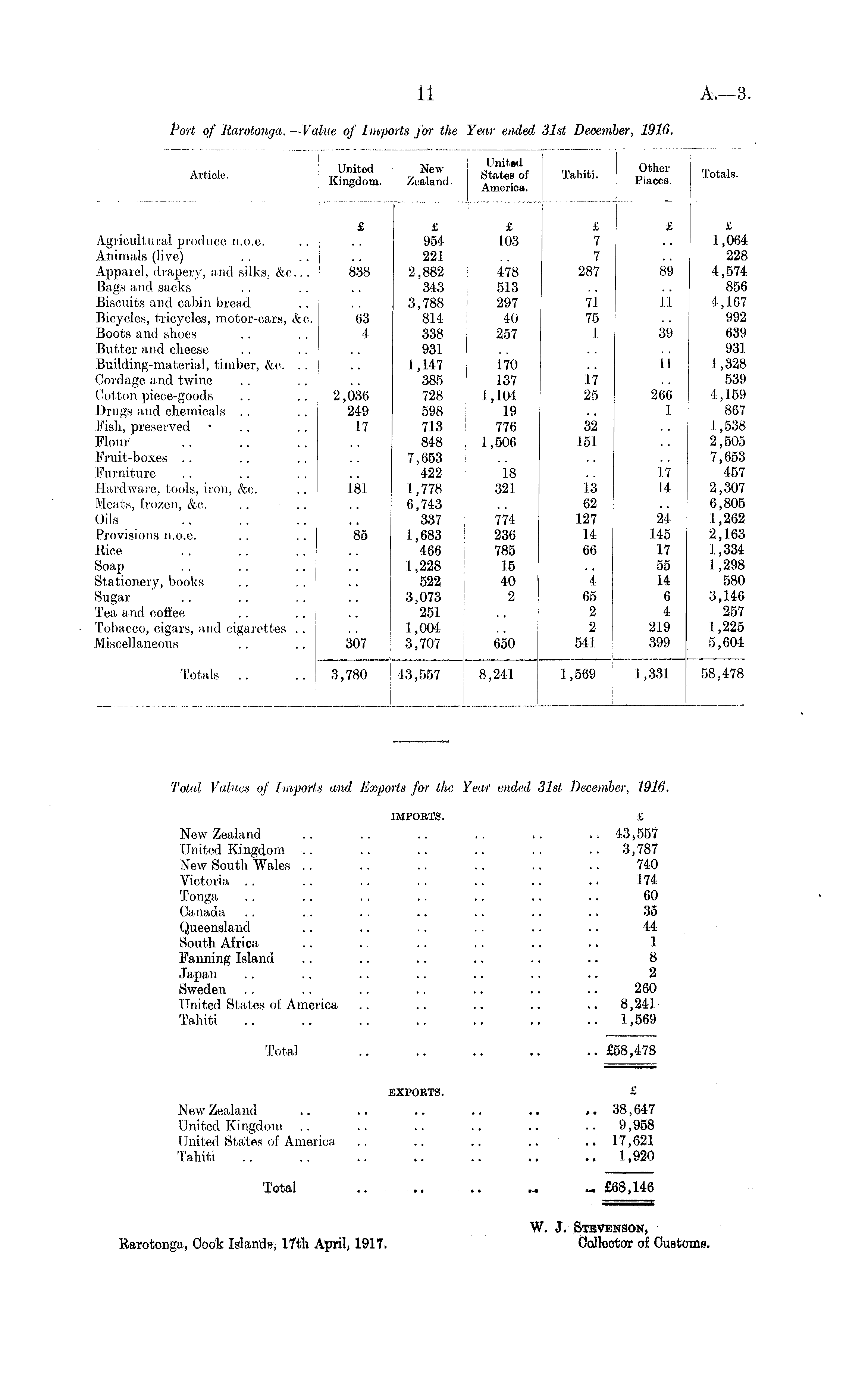 Total Values of Imports and Exports for the Year ended 31st December, 1916. imports. £ New Zealand .. .. .. .. .. .. 43,557 United Kingdom .. .. .. .. .. ..3,787 New South Wales 740 Victoria .. .. .. .. .. .. .. 174 Tonga .. .. .. .. .. .. .. 60 Canada .. ... .. .. .. .. .. 35 Queensland .. .. .. .. .. .. 44 South Africa .. .. .. .. .. .. 1 Fanning Island .. .. .. .. .. .. 8 Japan .. .. .. .. .. .. .. 2 Sweden .. .. .. .. .. .. .. 260 United States of America .. .. .. .. .. 8,241 Tahiti .. .. .. .. .. .. .. 1,569 Total .. .. .. .. .. £58,478 exports. £ New Zealand. .. .. .. .. .. .. 38,647 United Kingdom .. .. .. .. .. .. 9,958 United States of America .. .. .. .. .. 17,621 Tahiti 1,920 Total .. ~ .. .-. ■- £68,146 W. J. Stevenson, Rarotonga, Cook Islands, lfth April, 1917. C/olrector of Customs.