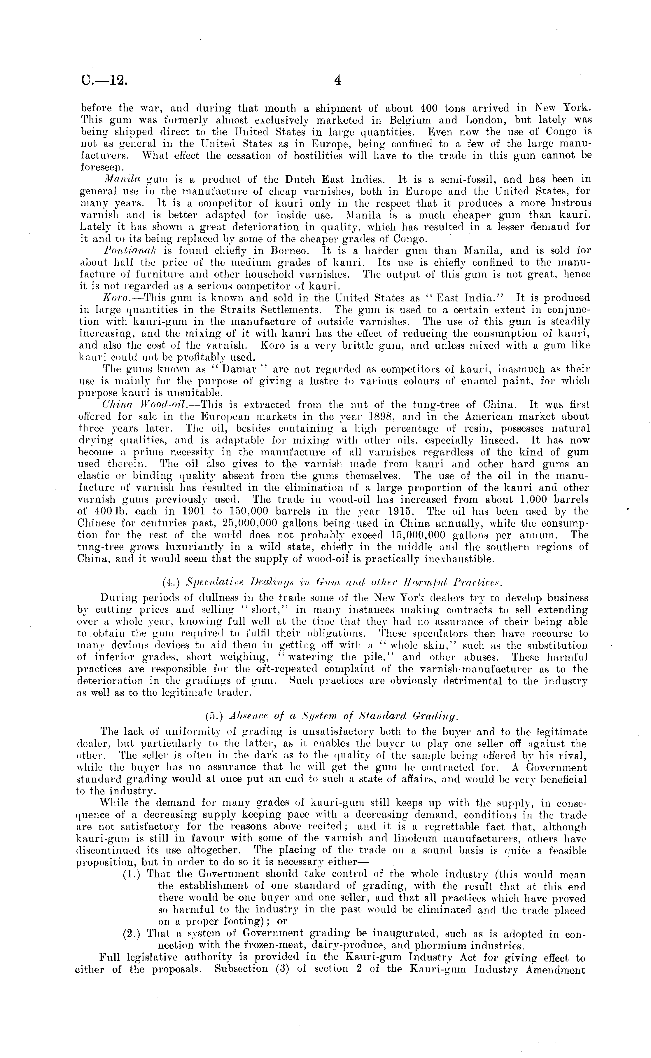 before the war, and during that month a shipment of about 400 tons arrived in New York. This gum was formerly almost exclusively marketed in Belgium and London, but lately was being shipped direct to the United States in large, quantities. Even now the use of Congo is not as general in the United States as in Europe, being confined to a few of the large manufacturers. What effect the cessation of hostilities will have to the trade in this gum cannot be foreseen. Manila gum is a product of the Dutch East Indies. It is a semi-fossil, and has been in general use in the manufacture of cheap varnishes, both in Europe and the United States, for many years. It is a competitor of kauri only in the respect that it produces a more lustrous varnish and is better adapted for inside use. Manila is a much cheaper gum than kauri. Lately it has shown a great deterioration in quality, which has resulted in a lesser demand for it and to its being replaced by some of the cheaper grades of Congo. Pontianak is found chiefly in Borneo. It is a harder gum than Manila, and is sold for about half the price of the medium grades of kauri. Its use is chiefly confined to the manufacture of furniture and other household varnishes. The output of this gum is not great, hence it is not regarded as a serious competitor of kauri. Koto. —This gum is known and sold in the United States as " East India." It is produced in large quantities in the Straits Settlements, The gum is used to a certain extent in conjunction with kauri-gum in the manufacture of outside varnishes. The use of this gum is steadily increasing, and the mixing of it with kauri has the effect of reducing the consumption of kauri, and also the cost of the varnish. Koro is a very brittle gum, and unless mixed with a gum like kauri could not be profitably used. The gums known as " Damar " are not regarded as competitors of kauri, inasmuch as their use is mainly for the purpose of giving a lustre to various colours of enamel paint, for which purpose kauri is unsuitable. China Wood-oil. —This is extracted from the nut of the t ting-tree of China. It was first offered for sale in the European markets in the year 1898, and in the American market about three years later. The oil, besides containing a high percentage of resin, possesses natural dry*ing qualities, and is adaptable for mixing with other oils, especially linseed. It has now become a prime necessity in the manufacture of all varnishes regardless of the kind of gum used therein. The oil also gives to the varnish made from kauri and other hard gums an elastic or binding quality absent from the gums themselves. The use of the oil in the manufacture of varnish has resulted in the elimination of a large proportion of the kauri and other varnish gums previously used. The trade in wood-oil has increased from about 1,000 barrels of 4001b. each in 1901 to 150,000 barrels in the year 1915. The oil has been used by the Chinese for centuries past, 25,000,000 gallons being used in China annually, while the consumption for the rest of the world does not probably exceed 15,000,000 gallons per annum. The tung-tree grows luxuriantly in a wild state, chiefly in the middle and the southern regions of China, and it would seem that the supply of wood-oil is practically inexhaustible. (4.) Speculative Dealings in (Sum and other Harmful Practices. During periods of dullness in the trade some of the New York dealers try to develop business by cutting prices and selling " short," in many instances making contracts to sell extending over a whole year, knowing full well at the time that they had no assurance of their being able to obtain the gum required to fulfil their obligations. These speculators then have recourse to many devious devices to aid them in getting off with a "whole skin," such as the substitution of inferior grades, short weighing, "watering the pile," and other abuses. These harmful practices are responsible for the oft-repeated complaint of the varnish-manufacturer as to the deterioration in the gradings of gum. Such practices are obviously detrimental to the industry as well as to the legitimate trader. (5.) Absence of a System of Standard Grading. The lack of uniformity of grading is unsatisfactory both to the buyer and to the legitimate dealer, but particularly to the latter, as it enables the buyer to play one seller off against the other. The seller is often in the dark as to the quality of the sample being offered by his rival, while the buyer has no assurance that he will get the gum he contracted for. A Government standard grading would at once put an end to such a state of affairs, and would be very beneficial to the industry. While the demand for many grades of kauri-gum still keeps it]) with the supply, in consequence of a decreasing supply keeping pace with a decreasing demand, conditions in the trade are not satisfactory for the reasons above recited; and it is a regrettable fact that, although kauri-gum is still in favour with some of the varnish and linoleum manufacturers, others have discontinued its use altogether. The placing of the trade on a sound basis is quite a feasible proposition, but in order to do so it is necessary either — (1.) That the Government should take control of the whole industry (this would mean the establishment of one standard of grading, with the result that at this end there would be one buyer and one seller, and that all practices which have proved so harmful to the industry in the past would be eliminated and the trade placed on a, proper footing); or (2.) That a system of Government grading be inaugurated, such as is adopted in connection with the frozen-meat, dairy-produce, and phormium industries. Full legislative authority is provided in the Kauri-gum Industry Act for giving effect to either of the proposals. Subsection (3) of section 2 of the Kauri-gum Industry Amendment