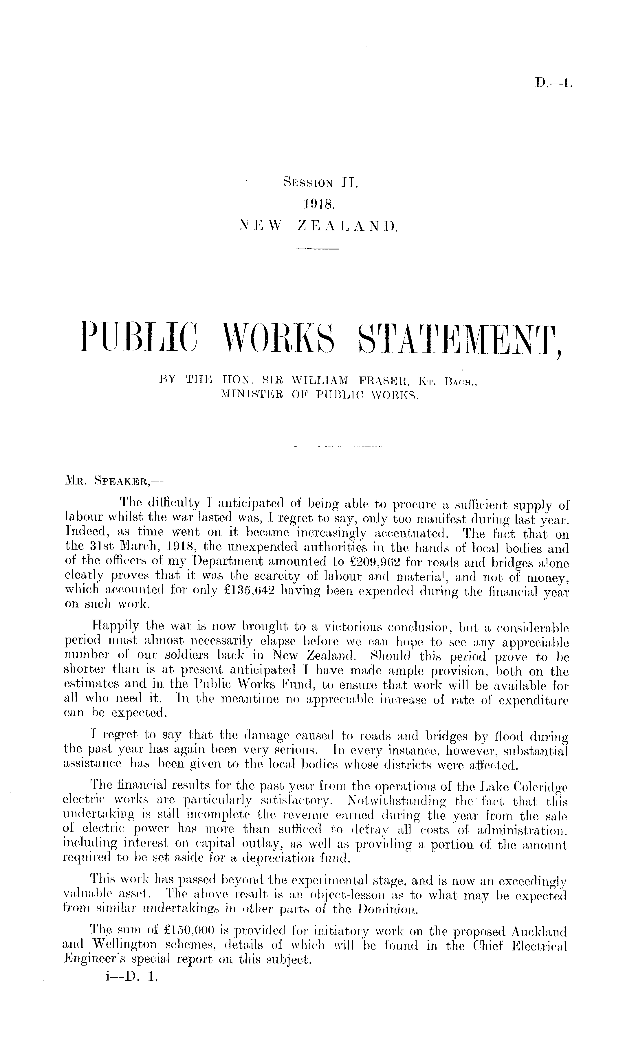 Mr. Speaker,— The difficulty I anticipated of being able to procure a sufficient supply of labour whilst the war lasted was, I regret to say, only too manifest during last year. Indeed, as time went on it became increasingly accentuated. The fact that on the 31st March, 1918, the unexpended authorities in the hands of local bodies and of the officers of my Department amounted to £209,962 for roads and bridges alone clearly proves that it was the scarcity of labour and materia, l , and not of money, which accounted for only £135,642 having been expended during the financial year on such work. . Happily the war is now brought to a victorious conclusion, but a considerable period must almost necessarily elapse before we can. hope to sec any appreciable number of our soldiers back in New Zealand. Should this period prove to be shorter than is at present anticipated I have made ample provision, both on the estimates and in. the Public Works Fund, to ensure that work will be available for all who need it. In the meantime no appreciable increase of rate of expenditure can be expected. I regret to say that the damage caused to roads and bridges by flood during the past year has again been very serious. I n every instance, however, substantial assistance has been given to the local bodies whose districts were affected. The financial results for the past year from the operations of the Lake Coleridge electric works are particularly satisfactory. Notwithstanding the fact that this undertaking is still incomplete the revenue earned during the year from the sale of electric power has more than sufficed to defray all Costs' of- administration, including interest on capital outlay, as well as providing a portion of the amount required to be set aside for a depreciation fund. This work- has passed beyond the experimental stage, and is now an exceedingly valuable asset. The above result is an object-lesson as to what may be expected from similar undertakings in other parts of the Dominion. The sum of £150,000 is provided for initiatory work' on the proposed Auckland and Wellington schemes, details of which will be found in the Chief Electrical Engineer's special report on this subject.
