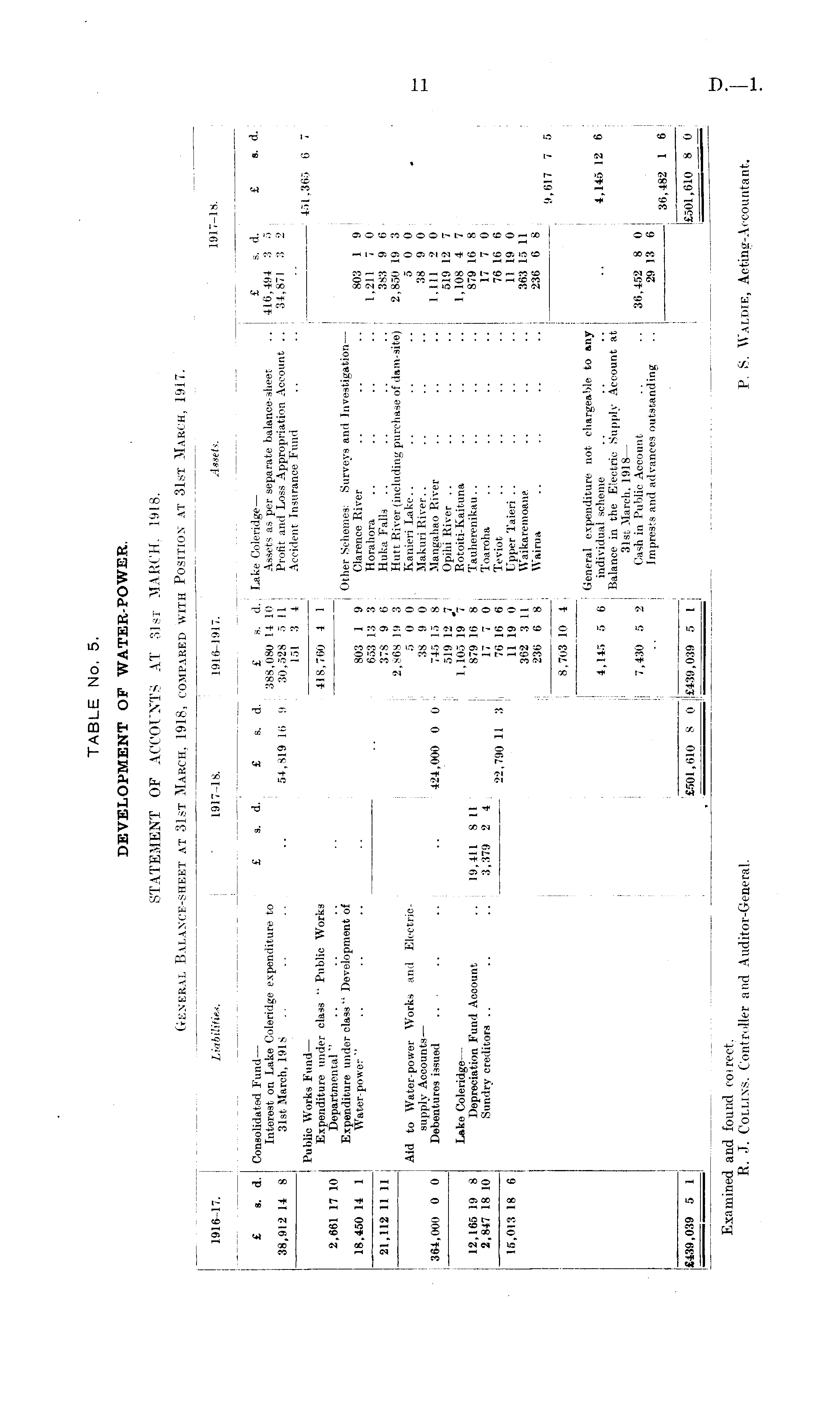 TABLE No. 5. DEVELOPMENT OF WATER-POWER. STATEMENT OF ACCOUNTS AT 31st MARCH, 1918. General Balance-sheet at 31st March, 1918, compared with Position at 31st March, 1917.