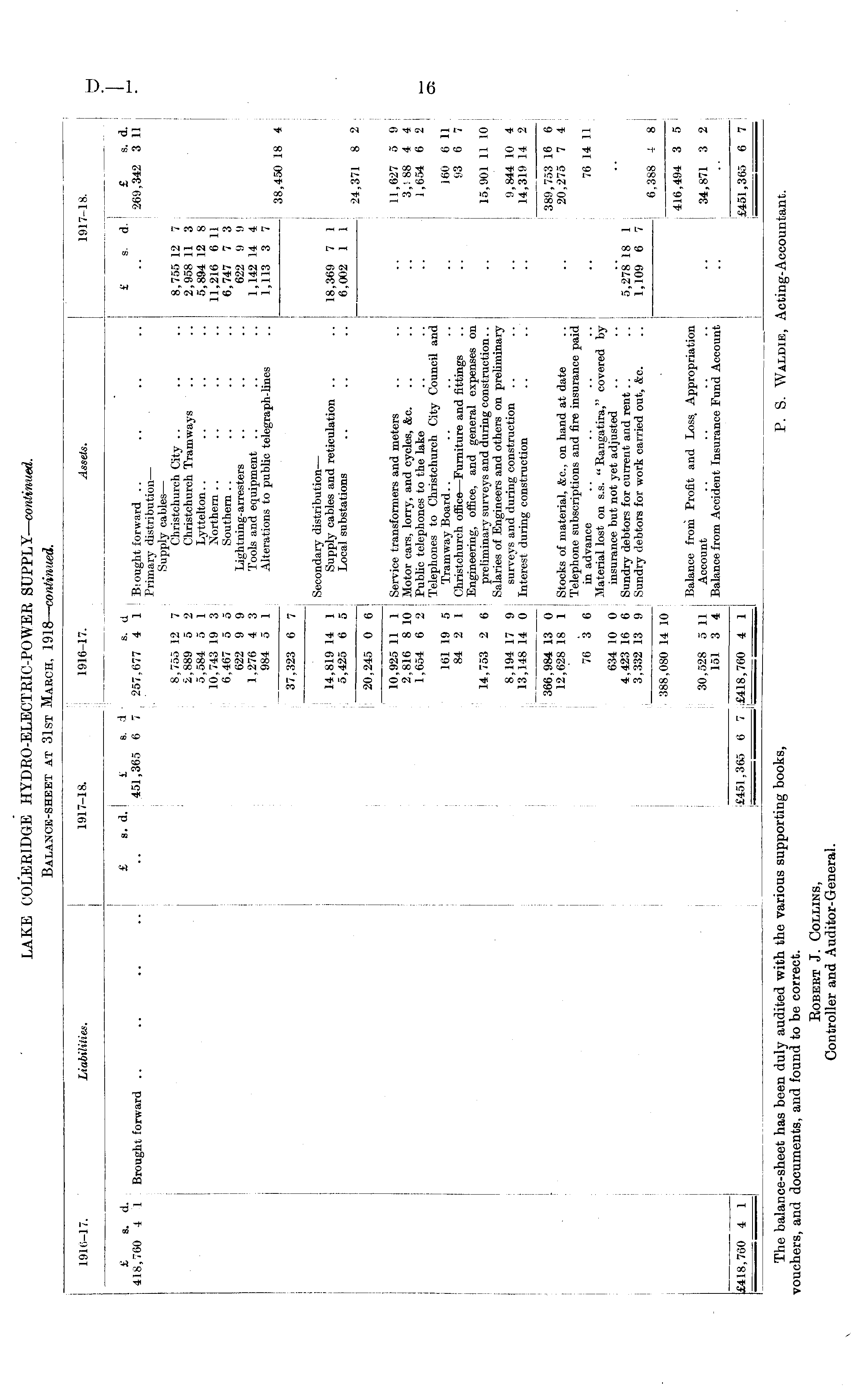 1916-17. Liabilities. 1917-18. 1916-17. Assets. 1917-18. £ £ s. d. 418,760 4 1 £418,760 4 1 Brought forward .. £ s. d. ! £ s. d ■ s. d £ s. d. I £ s. d. 451,365 6 7 257,677 4 1 ! Bi ought forward .. .. .. .. .. 269,342 3 11 Primary distribution — Supply cables — 8,755 12 7 | Christchurch City .. .. .. 8,755 12 7 2,889 5 2 Christchurch Tramways .. .. 2,958 11 3 5,584 5 1 Lyttelton.. .. .. .. 5,894 12 8 10,743 19 3 Northern.. .. .. .. 11,216 6 11 6,467 5 5 Southern.. .. .. .. 6,747 7 3 622 9 9 Lightning-arresters .. .. .. 622 9 9 1,276 4 3 Tools and equipment .. .. .. 1,142 144 984 5 1 Alterations to public telegraph-lines .. 1,113 3 7 — — ■ 38,450 18 4 37,323 6 7 Secondary distribution — 14,819 14 1 Supply cables and reticulation .. .. 18,369 7 1 5,425 6 5 Local substations .. .. .. 6,002 1 1 ! — 24,371 8 2 20,245 0 6 10,925 11 1 J Service transformers and meters .. .. .. 11,627 5 9 2,816 8 10 j Motor cars, lorrv, and cycles, &c. .. .. .. 3,: 88 4 4 1,654 6 2 ; Public telephones to the lake .. .. .. 1,654 6 2 Telephones to Christchurch City Council and 161 19 5 j Tramway Board.. .. .. .. .. 160 6 11 84 2 1 j Christchurch office —Furniture and fittings .. .. 93 6 7 Engineering, office, and general expenses on 14,753 2 6 preliminary surveys and during construction.. .. 15,901 11 10 Salaries of Engineers and others on preliminary 8,194 17 9 surveys and during construction .. .. .. 9,844 10 4 13,148 14 0 ! Interest" during construction .. .. .. 14,319 14 2 366,984 13 0 j 389,753 16 6 12,628 18 1 . Stocks of material, &c, on hand at date .. .. 20,275 7 4 Telephone subscriptions and fire insurance paid 76 3 6 in advance .. .. .. .. .. 76 14 11 Material lost on s.s. " Rangatira," covered by 634 10 0 insurance but not yet adjusted .. .. j 4,423 16 6 Sundry debtors for current and rent .. .. | 5,278 18 1 3,332 13 9 Sundry debtors for work carried out, &c. .. 1,109 6 7 ! 6.388 4 8 388,080 14 10 416,494 3 5 Balance from Profit and Loss Appropriation 30,528 5 11 i Account .. .. .. .. .. 34,871 3 2 151 3 4 Balance from Accident Insurance Fund Account J£451,365 6 7 £418,760 4 1 £451,365 6 7 £418,760 4 1 £451,365 6 7