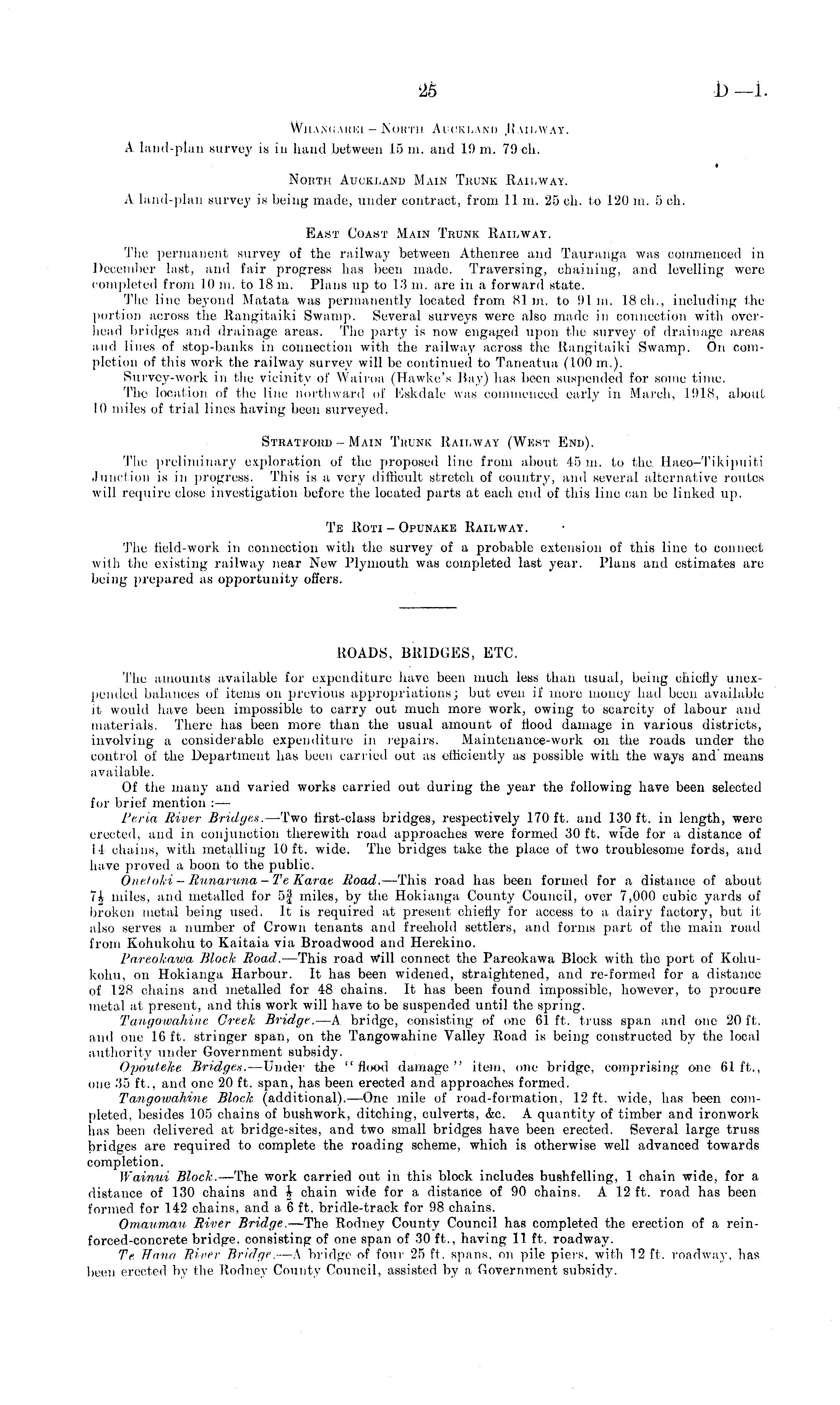 WiiA.\ii.\ui-:i -North Auckland Railway. A land-plan survey is in hand between 15 m. and 19 m. 79 ch. t North Auckland Main Trunk Railway, A land-plan survey is being made, under contract, from 11 m. 25 ch. to 120 m. 5 ch. East Coast Main Trunk Railway. The permanent survey of the railway between Athenree and Tauranga was commenced in December last, and fair progress has been made. Traversing, chaining, and levelling were completed from 10 in. to 18 m. Plans up to 13 m. are in a forward state. The line beyond Matata was permanently located from 81 m. to 91 m. 18 ch., including the portion across the Rangitaiki Swamp. Several surveys were also made in connect.ion with overhead bridges and drainage areas. The party is now engaged upon the survey of drainage areas and lines of stop-banks in connection with the railway across the Rangitaiki Swamp. On completion of this work the railway survey will be continued to Taneatua (100 in.). Survey-work in the vicinity of W'airoa (Ifawkc's Hay) has been suspended for some time. The location of the line northward ol' Eskdale was commenced early in March, 1918, about 10 miles of trial lines having been surveyed. Stratford - Main Trunk Railway (West End). The preliminary exploration of the proposed line from about 45 m. to the. Haeo-Tikipuiti Junction is in progress. This is a very difficult stretch of country, and several alternative routes will require close investigation before the located parts at each end of this line can be linked up. Te Roti - Opunake Railway. The iield-work in connection with the survey of a probable extension of this line to connect with the existing railway near New Plymouth was completed last year. Plans and estimates are being prepared as opportunity offers. ROADS, BRIDGES, ETC. The amounts available for expenditure have been much less than usual, being chiefly unexpended balances of items on previous appropriations; but even if more money had been ava.ila.blc it would have been impossible to carry out much more work, owing to scarcity of labour and materials. There has been more than the usual amount of flood damage in various districts, involving a considerable expenditure in repairs. Maintenance-work on the roads under the control of the Department has been carried out as efficiently as possible with the ways and means available. Of the many and varied works carried out during the year the following have been selected for brief mention :— J'eria River Bridges. —Two first-class bridges, respectively 170 ft. and 130 ft. in length, were erected, and in conjunction therewith road approaches were formed 30 ft. wide for a distance of 14 chains, with metalling 10 ft. wide. The bridges take the place of two troublesome fords, and have proved a boon to the public. One/oki — Runaruna —Te Karae Road. —This road has been formed for a distance of about 7£ miles, and metalled for 5| miles, by the Hokianga County Council, over 7,000 cubic yards of broken metal being used. It is required at present chiefly for access to a dairy factory, but it; also serves a number of Crown tenants and freehold settlers, and forms part of the main road from Kohukohu to Kaitaia via Broadwood and Herekino. Pareokawa Block Road. —This road will connect the Pareokawa Block with the port of Kohukohu, on Hokianga Harbour. It has been widened, straightened, and re-formed for a distance of 128 chains and metalled for 48 chains. It has been found impossible, however, to procure metal at present, and this work will have to be suspended until the spring. Tangowahine Greek Bridge. —A bridge, consisting of one 6l ft. truss span and one 20 ft. and one 16 ft. stringer span, on the Tangowahine Valley Road is being constructed by the local authority under Government subsidy, Opouteke Bridges. —Under the " flood damage " item, one bridge, comprising one 61 ft., one 35 ft., and one 20 ft. span, has been erected and approaches formed. Tangowahine Block (additional). —One mile of road-formation, 12 ft. wide, has been completed, besides 105 chains of bushwork, ditching, culverts, &c. A quantity of timber and ironwork has been delivered at bridge-sites, and two small bridges have been erected. Several large truss bridges are required to complete the roading scheme, which is otherwise well advanced towards completion. Wainui Block. —The work carried out in this block includes bushfclling, 1 chain wide, for a distance of 130 chains and \ chain wide for a distance of 90 chains. A. 12 ft. road has been formed for 142 chains, and a 6 ft. bridle-track for 98 chains. Omaumau River Bridge. —The Rodney County Council has completed the erection of a rein-forced-concrete bridge, consisting of one span of 30 ft,, having 11 ft, roadway. Te Nana "River Bridge. —A bridge of four 25 ft. spans, on pile piers, with 12 ft. roadway, has been erected by the Rodney County Council, assisted by a Government subsidy.