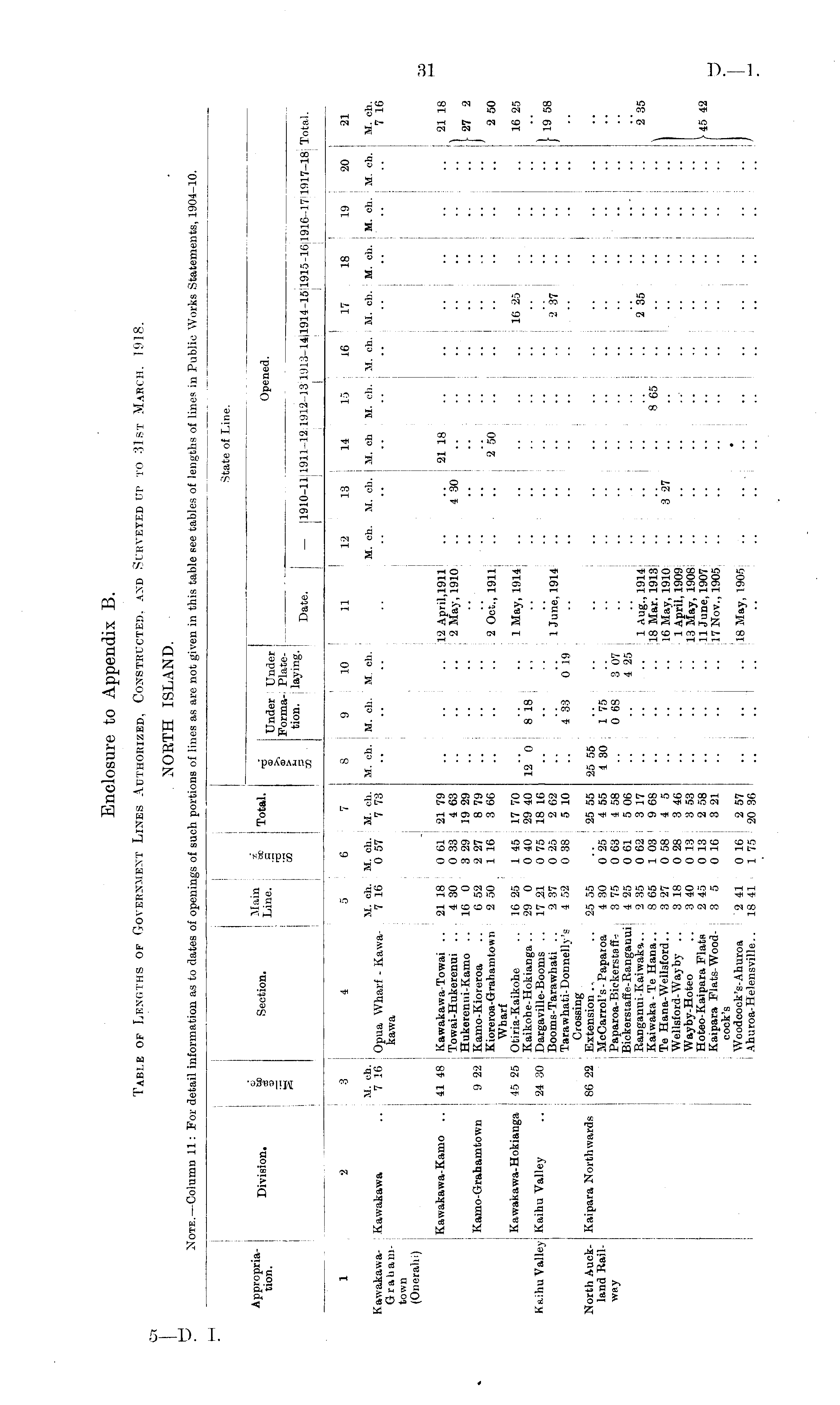 Enclosure to Appendix B. Table of Lengths of Government Lines Authorized, Constructed, and Surveyed up to 31st March, 1918. NORTH ISLAND.