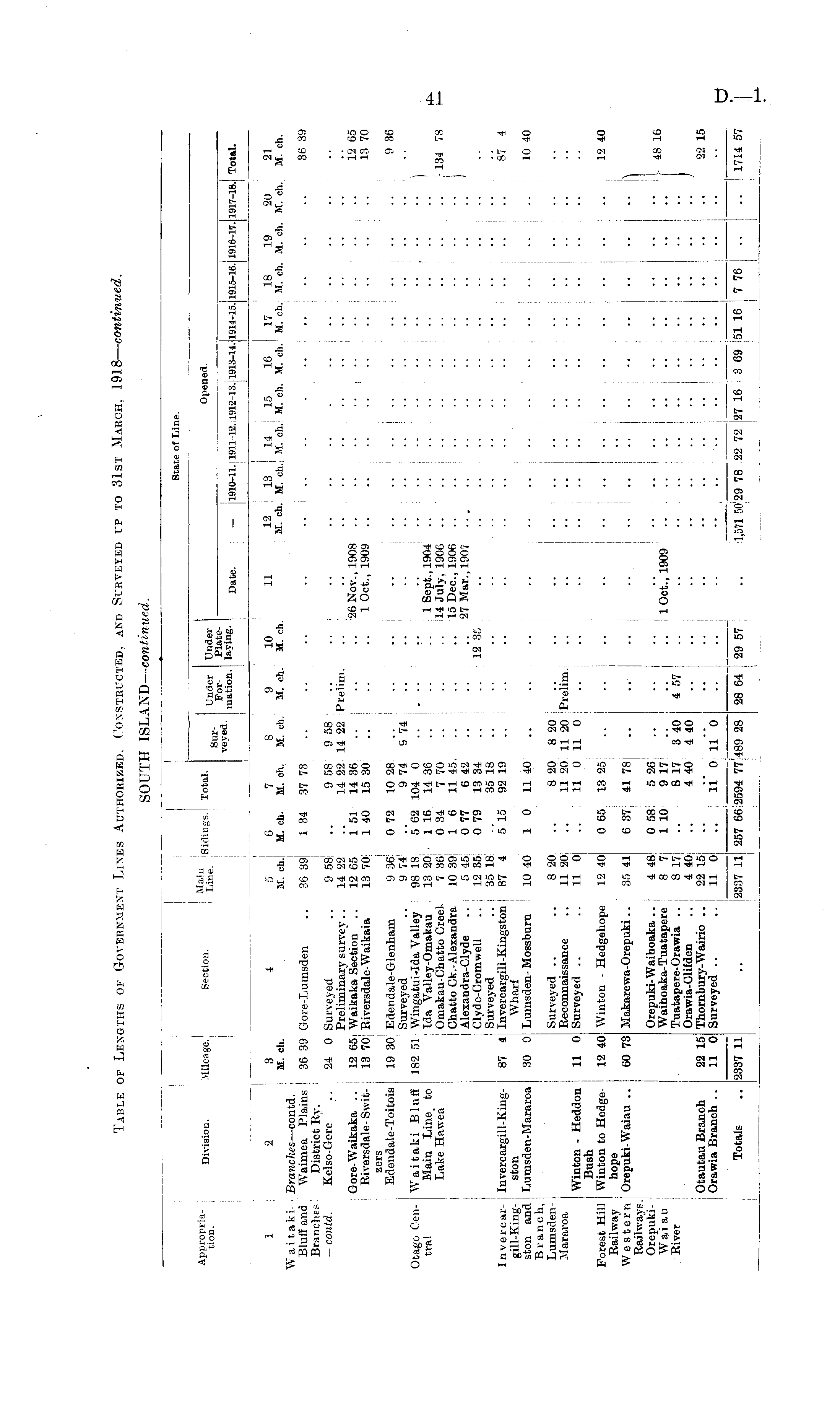 Table of Lengths of Government Lines Authorized, Constructed, and Surveyed up to 31st March, 1918— continued. SOUTH ISLAND— continued.