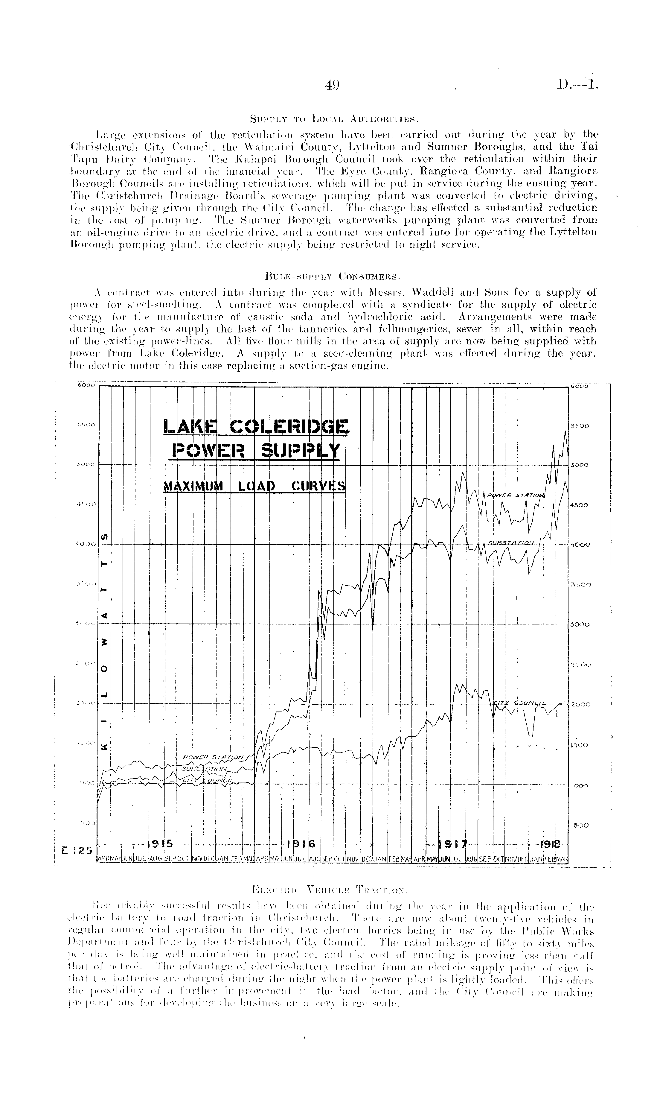Electeic Vehicle Traction. Remarkably successful results have been obtained during the year in the application of the electric battery to road traction in Christchurch. There are now about twenty-live vehicles in regular commercial operation in the city, two electric lorries being in use by the Public Works Department and four by the Christchurch City Council. The rated mileage of fifty to sixty miles per day is being well maintained in practice, and the cost of running is proving less than half that of petrol. The advantage of electric-battery i ruction from an electric supply point of view is that the batteries arc charged during the night when the power plant is lightly loaded. This offers the possibility of a further improvement in the load factor, and the City Council are making preparations for developing the business on ;i very large scale.